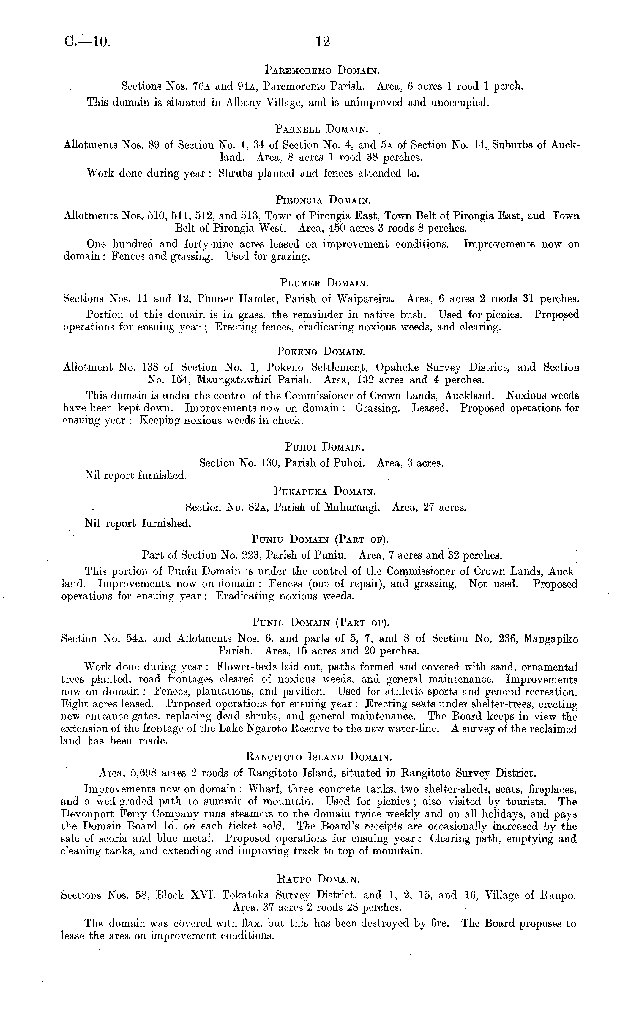 Paremoremo Domain, Sections Nos. 76a and 94a, Paremoremo Parish. Area, 6 acres 1 rood 1 perch. This domain is situated in Albany Village, and is unimproved and unoccupied. Parnell Domain. Allotments Nos. 89 of Section No. 1, 34 of Section No. 4, and 5a of Section No. 14, Suburbs of Auckland. Area, 8 acres 1 rood 38 perches. Work done during year : Shrubs planted and fences attended to. Pirongia Domain. Allotments Nos. 510, 511, 512, and 513, Town of Pirongia East, Town Belt of Pirongia East, and Town Belt of Pirongia West. Area, 450 acres 3 roods 8 perches. One hundred and forty-nine acres leased on improvement conditions. Improvements now on domain : Fences and grassing. Used for grazing. Plumer Domain. Sections Nos. 11 and 12, Plumer Hamlet, Parish of Waipareira. Area, 6 acres 2 roods 31 perches. Portion of this domain is in grass, the remainder in native bush. Used for picnics. Proposed operations for ensuing year :, Erecting fences, eradicating noxious weeds, and clearing. Pokeno Domain. Allotment No. 138 of Section No. 1, Pokeno Settlement, Opaheke Survey District, and Section No. 154, Maungatawhiri Parish. Area, 132 acres and 4 perches. This domain is under the control of the Commissioner of Crown Lands, Auckland. Noxious weeds have been kept down. Improvements now on domain : Grassing. Leased. Proposed operations for ensuing year : Keeping noxious weeds in check. Puhoi Domain. Section No. 130, Parish of Puhoi. Area, 3 acres. Nil report furnished. Pukapuka Domain. Section No. 82a, Parish of Mahurangi. Area, 27 acres. Nil report furnished. Puniu Domain (Part op). Part of Section No. 223, Parish of Puniu. Area, 7 acres and 32 perches. This portion of Puniu Domain is under the control of the Commissioner of Crown Lands, Auck land. Improvements now on domain : Fences (out of repair), and grassing. Not used. Proposed operations for ensuing year : Eradicating noxious weeds. Puniu Domain (Part of). Section No. 54a, and Allotments Nos. 6, and parts of 5, 7, and 8 of Section No. 236, Mangapiko Parish. Area, 15 acres and 20 perches. Work done during year : Flower-beds laid out, paths formed and covered with sand, ornamental trees planted, road frontages cleared of noxious weeds, and general maintenance. Improvements now on domain : Fences, plantations; and pavilion. Used for athletic sports and general recreation. Eight acres leased. Proposed operations for ensuing year : Erecting seats under shelter-trees, erecting new entrance-gates, replacing dead shrubs, and general maintenance. The Board keeps in view the extension of the frontage of the Lake Ngaroto Reserve to the new water-line. A survey of the reclaimed land has been made. Rangitoto Island Domain. Area, 5,698 acres 2 roods of Rangitoto Island, situated in Rangitoto Survey District. Improvements now on domain : Wharf, three concrete tanks, two shelter-sheds, seats, fireplaces, and a well-graded path to summit of mountain. Used for picnics ; also visited by tourists. The Devonport Ferry Company runs steamers to the domain twice weekly and on all holidays, and pays the Domain Board Id. on each ticket sold. The Board's receipts are occasionally increased by the sale of scoria and blue metal. Proposed.operations for ensuing year: Clearing path, emptying and cleaning tanks, and extending and improving track to top of mountain. Raupo Domain. Sections Nos. 58. Block XVI, Tokatoka Survey District, and 1, 2, 15, and 16, Village of Raupo. Area, 37 acres 2 roods 28 perches. The domain was covered with flax, but this has been destroyed by fire. The Board proposes to lease the area on improvement conditions.