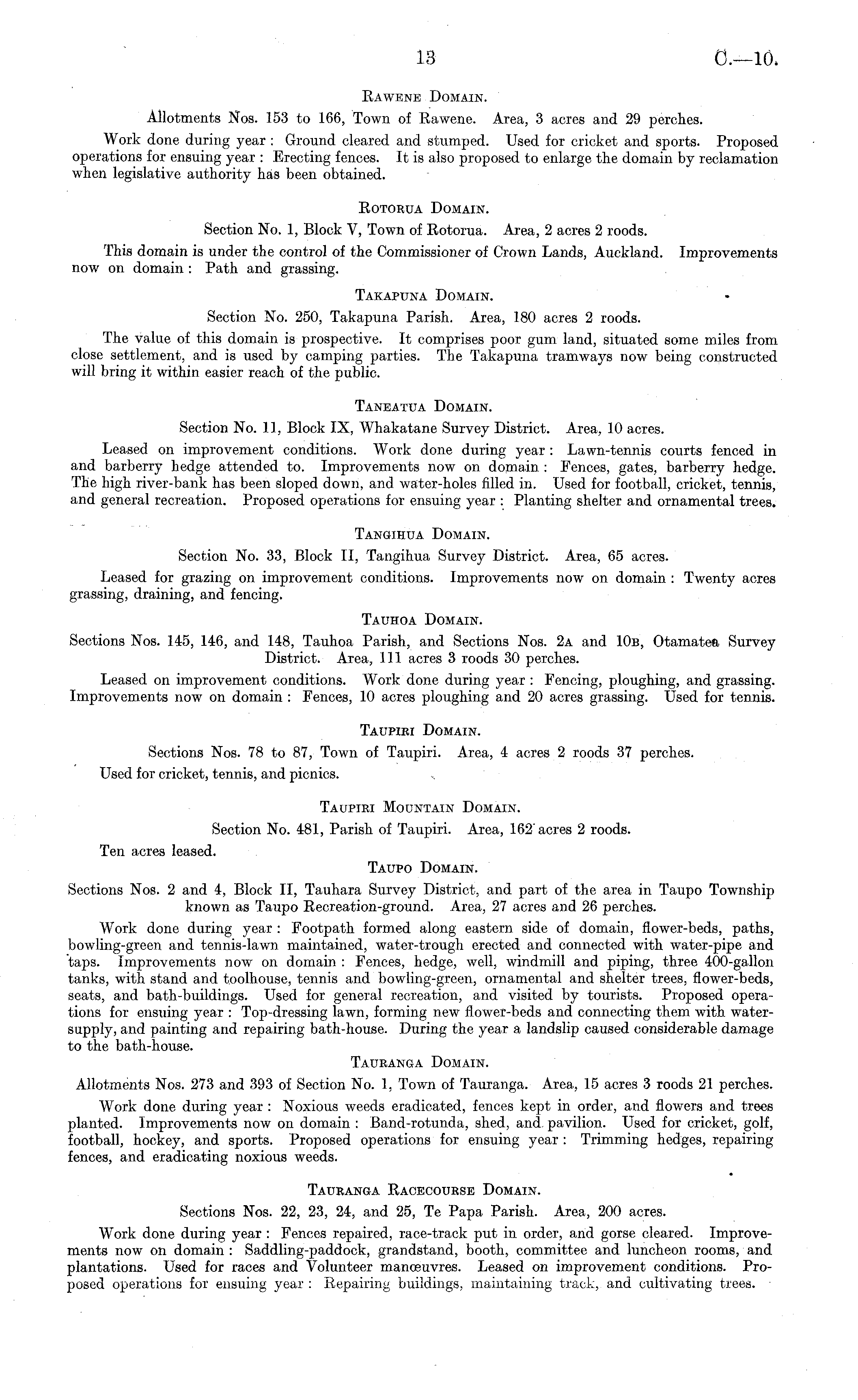 Eawene Domain. Allotments Nos. 153 to 166, Town of Rawene. Area, 3 acres and 29 perches. Work done during year : Ground cleared and stumped. Used for cricket and sports. Proposed operations for ensuing year : Erecting fences. It is also proposed to enlarge the domain by reclamation when legislative authority has been obtained. Rotorua Domain. Section No. 1, Block V, Town of Rotorua. Area, 2 acres 2 roods. This domain is under the control of the Commissioner of Crown Lands, Auckland. Improvements now on domain : Path and grassing. Takapuna Domain. Section No. 250, Takapuna Parish. Area, 180 acres 2 roods. The value of this domain is prospective. It comprises poor gum land, situated some miles from close settlement, and is used by camping parties. The Takapuna tramways now being constructed will bring it within easier reach of the public. Taneatua Domain. Section No. 11, Block IX, Whakatane Survey District. Area, 10 acres. Leased on improvement conditions. Work done during year : Lawn-tennis courts fenced in and barberry hedge attended to. Improvements now on domain : Fences, gates, barberry hedge. The high river-bank has been sloped down, and water-holes filled in. Used for football, cricket, tennis, and general recreation. Proposed operations for ensuing year : Planting shelter and ornamental trees. Tangihua Domain. Section No. 33, Block 11, Tangihua Survey District. Area, 65 acres. Leased for grazing on improvement conditions. Improvements now on domain : Twenty acres grassing, draining, and fencing. Tauhoa Domain. Sections Nos. 145, 146, and 148, Tauhoa Parish, and Sections Nos. 2a and 10b, Otamatea Survey District. Area, 111 acres 3 roods 30 perches. Leased on improvement conditions. Work done during year : Fencing, ploughing, and grassing. Improvements now on domain : Fences, 10 acres ploughing and 20 acres grassing. Used for tennis. Taupiei Domain. Sections Nos. 78 to 87, Town of Taupiri. Area, 4 acres 2 roods 37 perches. Used for cricket, tennis, and picnics. Taupiei Mountain Domain. Section No. 481, Parish of Taupiri. Area, 162 acres 2 roods. Ten acres leased. Taupo Domain. Sections Nos. 2 and 4, Block 11, Tauhara Survey District, and part of the area in Taupo Township known as Taupo Recreation-ground. Area, 27 acres and 26 perches. Work done during year : Footpath formed along eastern side of domain, flower-beds, paths, bowling-green and tennis-lawn maintained, water-trough erected and connected with water-pipe and taps. Improvements now on domain : Fences, hedge, well, windmill and piping, three 400-gallon tanks, with stand and toolhouse, tennis and bowling-green, ornamental and shelter trees, flower-beds, seats, and bath-buildings. Used for general recreation, and visited by tourists. Proposed operations for ensuing year : Top-dressing lawn, forming new flower-beds and connecting them with watersupply, and painting and repairing bath-house. During the year a landslip caused considerable damage to the bath-house. Tauranga Domain. Allotments Nos. 273 and 393 of Section No. 1, Town of Tauranga. Area, 15 acres 3 roods 21 perches. Work done during year : Noxious weeds eradicated, fences kept in order, and flowers and trees planted. Improvements now on domain : Band-rotunda, shed, and pavilion. Used for cricket, golf, football, hockey, and sports. Proposed operations for ensuing year : Trimming hedges, repairing fences, and eradicating noxious weeds. Tauranga Racecourse Domain. Sections Nos. 22, 23, 24, and 25, Te Papa Parish. Area, 200 acres. Work done during year : Fences repaired, race-track put in order, and gorse cleared. Improvements now on domain : Saddling-paddock, grandstand, booth, committee and luncheon rooms, and plantations. Used for races and Volunteer manoeuvres. Leased on improvement conditions. Proposed operations for ensuing year : Repairing buildings, maintaining track, and cultivating tiees.