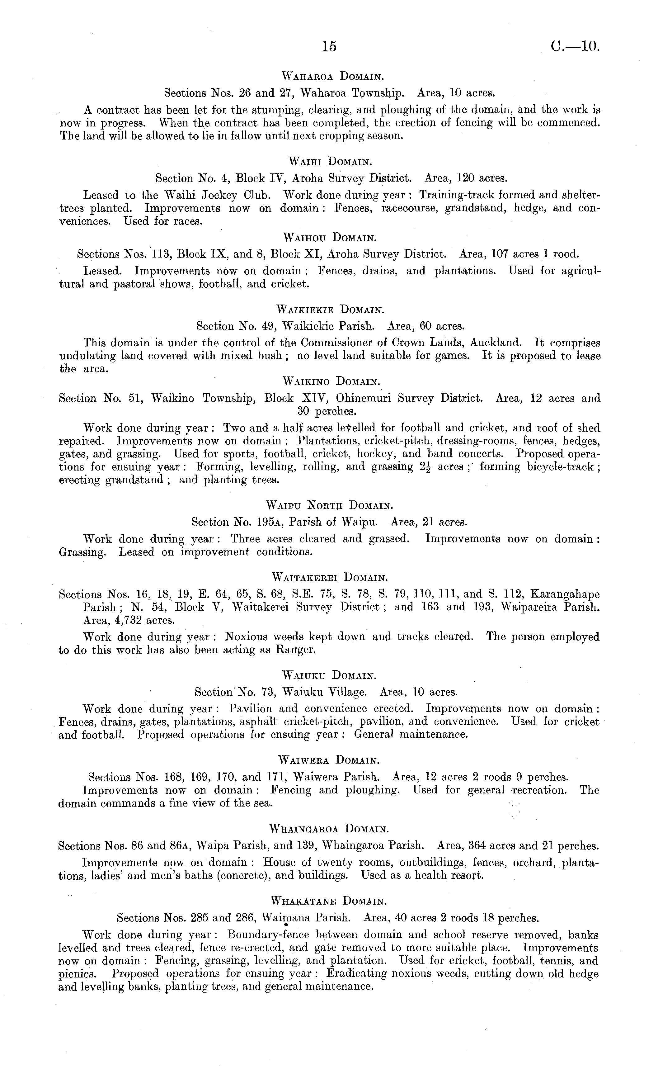 Waharoa Domain. Sections Nos. 26 and 27, Waharoa Township. Area, 10 acres. A contract has been let for the stumping, clearing, and ploughing of the domain, and the work is now in progress. When the contract has been completed, the erection of fencing will be commenced. The land will be allowed to lie in fallow until next cropping season. Waihi Domain. Section No. 4, Block IV, Aroha Survey District. Area, 120 acres. Leased to the Waihi Jockey Club. Work done during year : Training-track formed and sheltertrees planted. Improvements now on domain: Fences, racecourse, grandstand, hedge, and conveniences. Used for races. Waihou Domain. Sections Nos. 113, Block IX, and 8, Block XI, Aroha Survey District. Area, 107 acres 1 rood. Leased. Improvements now on domain : Fences, drains, and plantations. Used for agricultural and pastoral shows, football, and cricket. Waikiekie Domain. Section No. 49, Waikiekie Parish. Area, 60 acres. This domain is under the control of the Commissioner of Crown Lands, Auckland. It comprises undulating land covered with mixed bush ; no level land suitable for games. It is proposed to lease the area. Waikino Domain. Section No. 51, Waikino Township, Block XIV, Ohinemuri Survey District. Area, 12 acres and 30 perches. Work done during year : Two and a half acres levelled for football and cricket, and roof of shed repaired. Improvements now on domain : Plantations, cricket-pitch, dressing-rooms, fences, hedges, gates, and grassing. Used for sports, football, cricket, hockey, and band concerts. Proposed operations for ensuing year : Forming, levelling, rolling, and grassing 2J acres ; forming bicycle-track ; erecting grandstand ; and planting trees. Waipu North Domain. Section No. 195 a, Parish of Waipu. Area, 21 acres. Work done during year : Three acres cleared and grassed. Improvements now on domain : Grassing. Leased on improvement conditions. Waitakerei Domain. Sections Nos. 16, 18, 19, E. 64, 65, S. 68, S.E. 75, S. 78, S. 79, 110, 111, and S. 112, Karangahape Parish ; N. 54, Block V, Waitakerei Survey District; and 163 and 193, Waipareira Parish. Area, 4,732 acres. Work done during year : Noxious weeds kept down and tracks cleared. The person employed to do this work has also been acting as Ranger. Waiuku Domain. Section' No. 73, Waiuku Village. Area, 10 acres. Work done during year : Pavilion and convenience erected. Improvements now on domain : Fences, drains, gates, plantations, asphalt cricket-pitch, pavilion, and convenience. Used for cricket and football. Proposed operations for ensuing year : General maintenance. Waiwera Domain. Sections Nos. 168, 169, 170, and 171, Waiwera Parish. Area, 12 acres 2 roods 9 perches. Improvements now on domain : Fencing and ploughing. Used for general recreation. The domain commands a fine view of the sea. Whaingaroa Domain. Sections Nos. 86 and 86a, Waipa Parish, and 139, Whaingaroa Parish. Area, 364 acres and 21 perches. Improvements now on domain : House of twenty rooms, outbuildings, fences, orchard, plantations, ladies' and men's baths (concrete), and buildings. Used as a health resort. Whakatane Domain. Sections Nos. 285 and 286, Waimana Parish. Area, 40 acres 2 roods 18 perches. Work done during year : Boundary-fence between domain and school reserve removed, banks levelled and trees cleared, fence re-erected, and gate removed to more suitable place. Improvements now on domain : Fencing, grassing, levelling, and plantation. Used for cricket, football, tennis, and picnics. Proposed operations for ensuing year : Eradicating noxious weeds, cutting down old hedge and levelling banks, planting trees, and general maintenance.