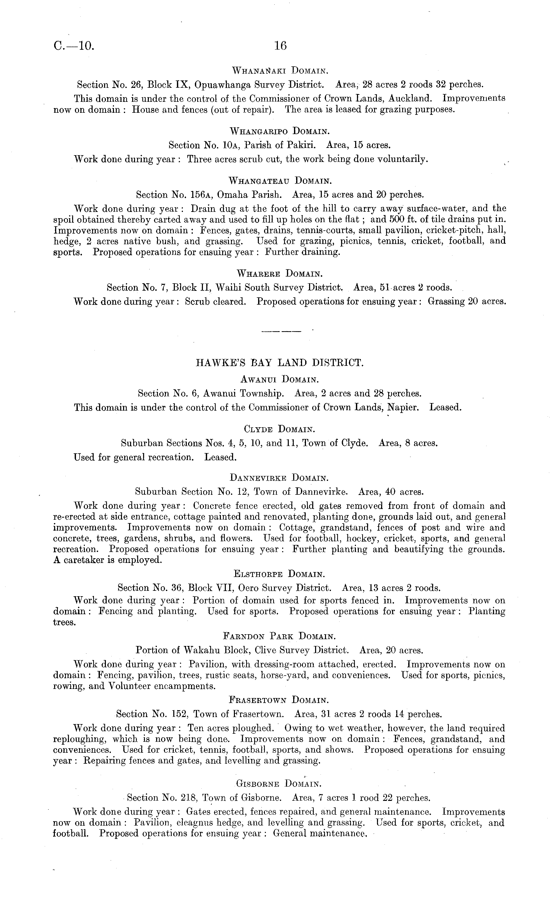 HAWKE'S BAY LAND DISTRICT. Awanui Domain. Section No. 6, Awanui Township. Area, 2 acres and 28 perches. This domain is under the control of the Commissioner of Crown Lands, Napier. Leased. Clyde Domain. Suburban Sections Nos. 4, 5, 10, and 11, Town of Clyde. Area, 8 acres. Used for general recreation. Leased. Dannevibke Domain. Suburban Section No. 12, Town of Dannevirke. Area, 40 acres. Work done during year : Concrete fence erected, old gates removed from front of domain and re-erected at side entrance, cottage painted and renovated, planting done, grounds laid out, and general improvements. Improvements now on domain : Cottage, grandstand, fences of post and wire and concrete, trees, gardens, shrubs, and flowers. Used for football, hockey, cricket, sports, and general recreation. Proposed operations for ensuing year : Further planting and beautifying the grounds. A caretaker is employed. Elsthorpe Domain. Section No. 36, Block VII, Oero Survey District. Area, 13 acres 2 roods. Work done during year : Portion of domain used for sports fenced in. Improvements now on domain : Fencing and planting. Used for sports. Proposed operations for ensuing year : Planting trees. Farndon Park Domain. Portion of Wakahu Block, Clive Survey District. Area, 20 acres. Work done during year : Pavilion, with dressing-room attached, erected. Improvements now on domain : Fencing, pavilion, trees, rustic seats, horse-yard, and conveniences. Used for sports, picnics, rowing, and Volunteer encampments. Frasertown Domain. Section No. 152, Town of Frasertown. Area, 31 acres 2 roods 14 perches. Work done during year : Ten acres ploughed. Owing to wet weather, however, the land required reploughing, which is now being done. Improvements now on domain : Fences, grandstand, and conveniences. Used for cricket, tennis, football, sports, and shows. Proposed operations for ensuing year : Repairing fences and gates, and levelling and grassing. Gisborne Domain. Section No. 218, Town of Gisborne. Area, 7 acres 1 rood 22 perches. Work done during year : Gates erected, fences repaired, and general maintenance. Improvements now on domain : Pavilion, eleagmis hedge, and levelling and grassing. Used for sports, cricket, and football. Proposed operations for ensuing year : General maintenance,