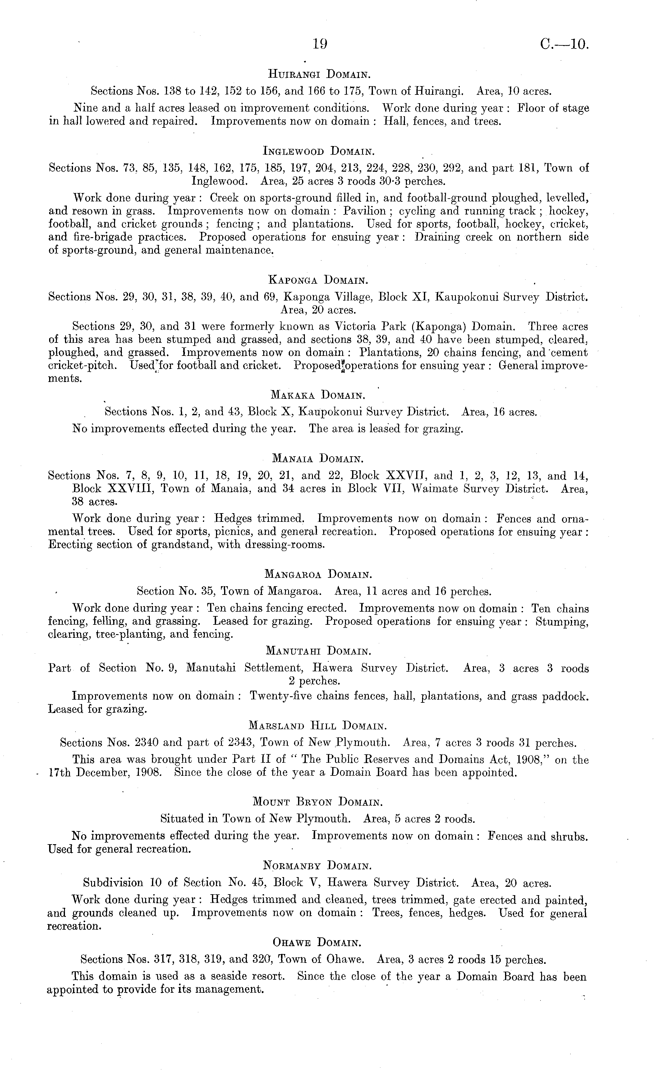 Huirangi Domain. Sections Nos. J3B to 142, 152 to 156, and 166 to 175, Town of Huirangi. Area, 10 acres. Nine and a half acres leased on improvement conditions. Work done during year : Floor of stage in haH lowered and repaired. Improvements now on domain : Hall, fences, and trees. Inglewood Domain. Sections Nos. 73, 85, 135, 148, 162, 175, 185, 197, 204, 213, 224, 228, 230, 292, and part 181, Town of Inglewood. Area, 25 acres 3 roods 30-3 perches. Work done during year : Creek on sports-ground filled in, and football-ground ploughed, levelled, and resown in grass. Improvements now on domain : Pavilion ; cycling and running track ; hockey, football, and cricket grounds ; fencing ; and plantations. Used for sports, football, hockey, cricket, and fire-brigade practices. Proposed operations for ensuing year : Draining creek on northern side of sports-ground, and general maintenance. Kaponga Domain. Sections Nos. 29, 30, 81, 38, 39, 40, and 69, Kaponga Village, Block XI, Kaupokonui Survey District. Area, 20 acres. Sections 29, 30, and 31 were formerly known as Victoria Park (Kaponga) Domain. Three acres of this area has been stumped and grassed, and sections 38, 39, and 40 have been stumped, cleared, ploughed, and grassed. Improvements now on domain : Plantations, 20 chains fencing, and 'cement cricket-pitch. Used'for football and cricket. Proposcd'operations for ensuing year : General improvements. Makaka Domain. Sections Nos. 1, 2, and 43, Block X, Kaupokonui Survey District. Area, 16 acres. No improvements effected during the year. The area is leased for grazing. Manaia Domain. Sections Nos. 7, 8, 9, 10, 11, 18, 19, 20, 21, and 22, Block XXVII, and 1, 2, 3, 12, 13, and 14, Block XXVIII, Town of Manaia, and 34 acres in Block VII, Waimato Survey District. Area, 38 acres. Work done during year : Hedges trimmed. Improvements now on domain : Fences and ornamental trees. Used for sports, picnics, and general recreation. Proposed operations for ensuing year : Erecting section of grandstand, with dressing-rooms. Mangaroa Domain. Section No. 35, Town of Mangaroa. Area, 11 acres and 16 perches. Work done during year : Ten chains fencing erected. Improvements now on domain : Ten chains fencing, felling, and grassing. Leased for grazing. Proposed operations for ensuing year : Stumping, clearing, tree-planting, and fencing. Manutahi Domain. Part of Section No. 9, Manutahi Settlement, Hawera Survey District. Area, 3 acres 3 roods 2 perches. Improvements now on domain : Twenty-five chains fences, hall, plantations, and grass paddock. Leased for grazing. Maesland Hill Domain. Sections Nos. 2340 and part of 2343, Town of New Plymouth. Area, 7 acres 3 roods 31 perches. This area was brought under Part II of " The Public Reserves and Domains Act, 1908," on the 17th December, 1908. Since the close of the year a Domain Board has been appointed. Mount Bryon Domain. Situated in Town of New Plymouth. Area, 5 acres 2 roods. No improvements effected during the year. Improvements now on domain : Fences and shrubs. Used for general recreation. Normanby Domain. Subdivision 10 of Section No. 45, Block V, Hawera Survey District. Area, 20 acres. Work done during year : Hedges trimmed and cleaned, trees trimmed, gate erected and painted, and grounds cleaned up. Improvements now on domain : Trees, fences, hedges. Used for general recreation. Ohawe Domain. Sections Nos. 317, 318, 319, and 320, Town of Ohawe. Area, 3 acres 2 roods 15 perches. This domain is used as a seaside resort. Since the close of the year a Domain Board has been appointed to provide for its management.