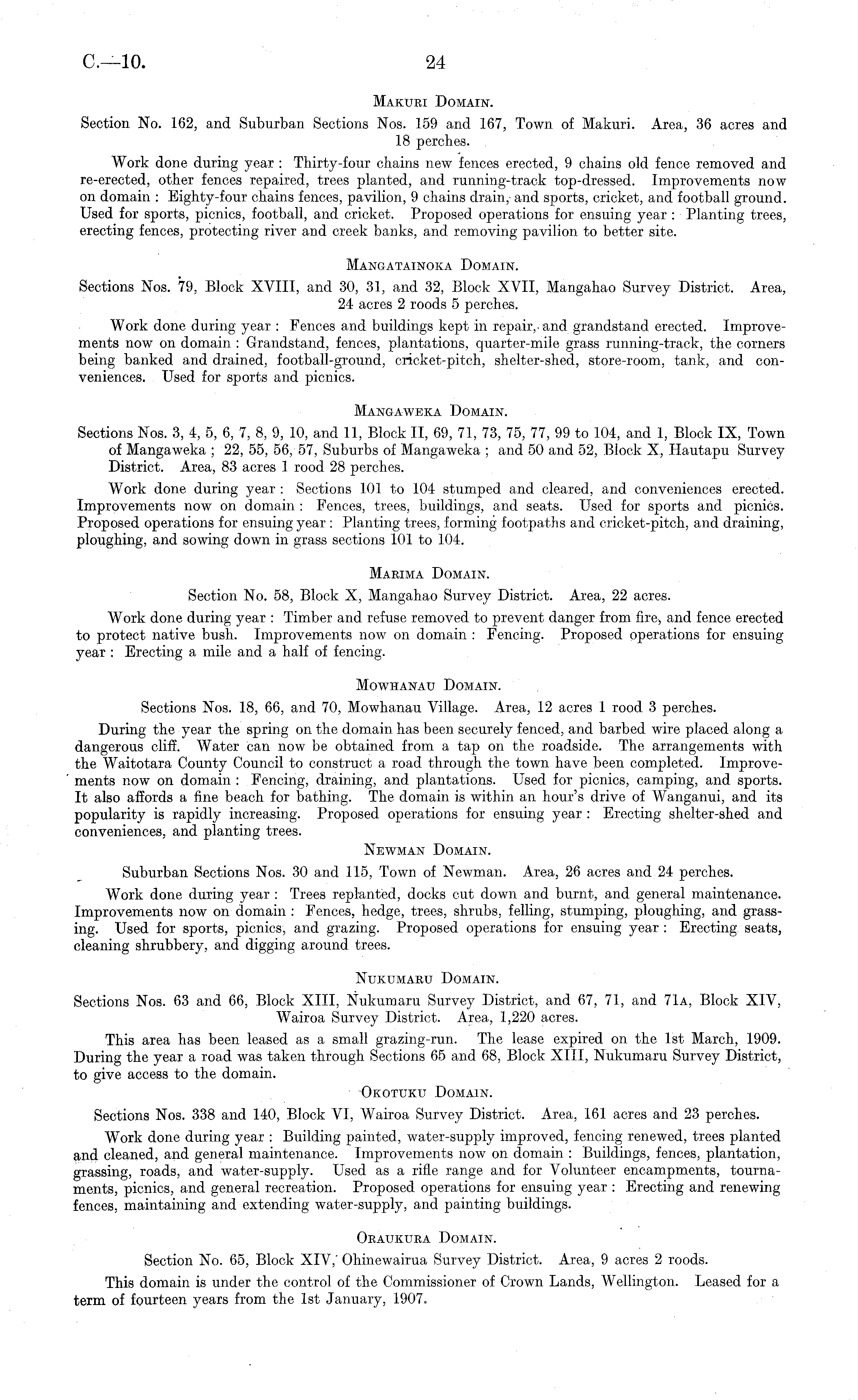 Makubi Domain. Section No. 162, and Suburban Sections Nos. 159 and 167, Town of Makuri. Area, 36 acres and 18 perches. Work done during year : Thirty-four chains new fences erected, 9 chains old fence removed and re-erected, other fences repaired, trees planted, and running-track top-dressed. Improvements now on domain : Eighty-four chains fences, pavilion, 9 chains drain, and sports, cricket, and football ground. Used for sports, picnics, football, and cricket. Proposed operations for ensuing year : Planting trees, erecting fences, protecting river and creek banks, and removing pavilion to better site. Mangatainoka Domain. Sections Nos. 79, Block XVIII, and 30, 31, and 32, Block XVII, Mangahao Survey District. Area, 24 acres 2 roods 5 perches. Work done during year : Fences and buildings kept in repair, and grandstand erected. Improvements now on domain : Grandstand, fences, plantations, quarter-mile grass running-track, the corners being banked and drained, football-ground, cricket-pitch, shelter-shed, store-room, tank, and conveniences. Used for sports and picnics. Mangawbka Domain. Sections Nos. 3, 4, 5, 6, 7, 8, 9, 10, and 11, Block 11, 69, 71, 73, 75, 77, 99 to 104, and 1, Block IX, Town of Mangaweka ; 22, 55, 56, 57, Suburbs of Mangaweka ; and 50 and 52, Block X, Hautapu Survey District. Area, 83 acres 1 rood 28 perches. Work done during year : Sections 101 to 104 stumped and cleared, and conveniences erected. Improvements now on domain : Fences, trees, buildings, and seats. Used for sports and picnics. Proposed operations for ensuing year : Planting trees, forming footpaths and cricket-pitch, and draining, ploughing, and sowing down in grass sections 101 to 104. Marima Domain. Section No. 58, Block X, Mangahao Survey District. Area, 22 acres. Work done during year : Timber and refuse removed to prevent danger from fire, and fence erected to protect native bush. Improvements now on domain : Fencing. Proposed operations for ensuing year : Erecting a mile and a half of fencing. Mowhanau Domain. Sections Nos. 18, 66, and 70, Mowhanau Village. Area, 12 acres 1 rood 3 perches. During the year the spring on the domain has been securely fenced, and barbed wire placed along a dangerous cliff. Water can now be obtained from a tap on the roadside. The arrangements with the Waitotara County Council to construct a road through the town have been completed. Improvements now on domain : Fencing, draining, and plantations. Used for picnics, camping, and sports. It also affords a fine beach for bathing. The domain is within an hour's drive of Wanganui, and its popularity is rapidly increasing. Proposed operations for ensuing year : Erecting shelter-shed and conveniences, and planting trees. Newman Domain. Suburban Sections Nos. 30 and 115, Town of Newman. Area, 26 acres and 24 perches. Work done during year : Trees replanted, docks cut down and burnt, and general maintenance. Improvements now on domain : Fences, hedge, trees, shrubs, felling, stumping, ploughing, and grassing. Used for sports, picnics, and grazing. Proposed operations for ensuing year : Erecting seats, cleaning shrubbery, and digging around trees. Nukumaru Domain. Sections Nos. 63 and 66, Block XIII, Nukumaru Survey District, and 67, 71, and 71a, Block XIV, Wairoa Survey District. Area, 1,220 acres. This area has been leased as a small grazing-run. The lease expired on the Ist March, 1909. During the year a road was taken through Sections 65 and 68, Block XIII, Nukumaru Survey District, to give access to the domain. Okotuku Domain. Sections Nos. 338 and 140, Block VI, Wairoa Survey District. Area, 161 acres and 23 perches. Work done during year : Building painted, water-supply improved, fencing renewed, trees planted and cleaned, and general maintenance. Improvements now on domain : Buildings, fences, plantation, grassing, roads, and water-supply. Used as a rifle range and for Volunteer encampments, tournaments, picnics, and general recreation. Proposed operations for ensuing year : Erecting and renewing fences, maintaining and extending water-supply, and painting buildings. Oraukuea Domain. Section No. 65, Block XIV,' Ohinewairua Survey District. Area, 9 acres 2 roods. This domain is under the control of the Commissioner of Crown Lands, Wellington. Leased for a term of fourteen years from the Ist January, 1907.