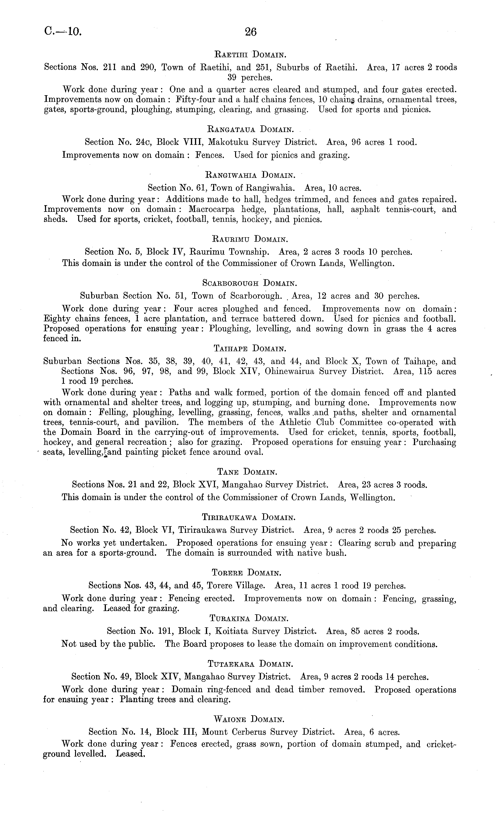 Raetihi Domain. Sections Nos. 211 and 290, Town of Raetihi, and 251, Suburbs of RaetiH. Area, 17 acres 2 roods 39 perches. Work done during year : One and a quarter acres cleared and stumped, and four gates erected. Improvements now on domain : Fifty-four and a half chains fences, 10 chaing drains, ornamental trees, gates, sports-ground, ploughing, stumping, clearing, and grassing. Used for sports and picnics. Rangataua Domain. Section No. 24c, Block VIII, Makotuku Survey District. Area, 96 acres 1 rood. Improvements now on domain : Fences. Used for picnics and grazing. Rangiwahia Domain. Section No. 61, Town of Rangiwahia. Area, 10 acres. Work done during year: Additions made to hall, hedges trimmed, and fences and gates repaired. Improvements now on domain : Macrocarpa hedge, plantations, hall, asphalt tennis-court, and sheds. Used for sports, cricket, football, tennis, hockey, and picnics. Raubimu Domain. Section No. 5, Block IV, Raurimu Township. Area, 2 acres 3 roods 10 perches. This domain is under the control of the Commissioner of Crown Lands, Wellington. ScABBOBOUGH DOMAIN. Suburban Section No. 51, Town of Scarborough. , Area, 12 acres and 30 perches. Work done during year : Four acres ploughed and fenced. Improvements now on domain: Eighty chains fences, 1 acre plantation, and terrace battered down. Used for picnics and football. Proposed operations for ensuing year : Ploughing, levelling, and sowing down in grass the 4 acres fenced in. Taihape Domain. Suburban Sections Nos. 35, 38, 39, 40, 41, 42, 43, and 44, and Block X, Town of Taihape, and Sections Nos. 96, 97, 98, and 99, Block XIV, Ohinewairua Survey District. Area, 115 acres 1 rood 19 perches. Work done during year : Paths and walk formed, portion of the domain fenced off and planted with ornamental and shelter trees, and logging up, stumping, and burning done. Improvements now on domain : Felling, ploughing, levelling, grassing, fences, walks .and paths, shelter and ornamental trees, tennis-court, and pavilion. The members of the Athletic Club Committee co-operated with the Domain Board in the carrying-out of improvements. Used for cricket, tennis, sports, football, hockey, and general recreation ; also for grazing. Proposed operations for ensuing year : Purchasing seats, levelling,[and painting picket fence around oval. Tane Domain. Sections Nos. 21 and 22, Block XVI, Mangahao Survey District. Area, 23 acres 3 roods. This domain is under the control of the Commissioner of Crown Lands, Wellington. TIEIKAUKAWA DOMAIN. Section No. 42, Block VI, Tiriraukawa Survey District. Area, 9 acres 2 roods 25 perches. No works yet undertaken. Proposed operations for ensuing year : Clearing scrub and preparing an area for a sports-ground. The domain is surrounded with native bush. Toeebe Domain. Sections Nos. 43, 44, and 45, Torere Village. Area, 11 acres 1 rood 19 perches. Work done during year : Fencing erected. Improvements now on domain : Fencing, grassing, and clearing. Leased for grazing. Turakina Domain. Section No. 191, Block I, Koitiata Survey District. Area, 85 acres 2 roods. Not used by the public. The Board proposes to lease the domain on improvement conditions. TUTAEKABA DOMAIN. Section No. 49, Block XIV, Mangahao Survey District. Area, 9 acres 2 roods 14 perches. Work done during year : Domain ring-fenced and dead timber removed. Proposed operations for ensuing year : Planting trees and clearing. Waione Domain. Section No. 14, Block 111-, Mount Cerberus Survey District. Area, 6 acres. Work done during year : Fences erected, grass sown, portion of domain stumped, and cricketground levelled. Leased.