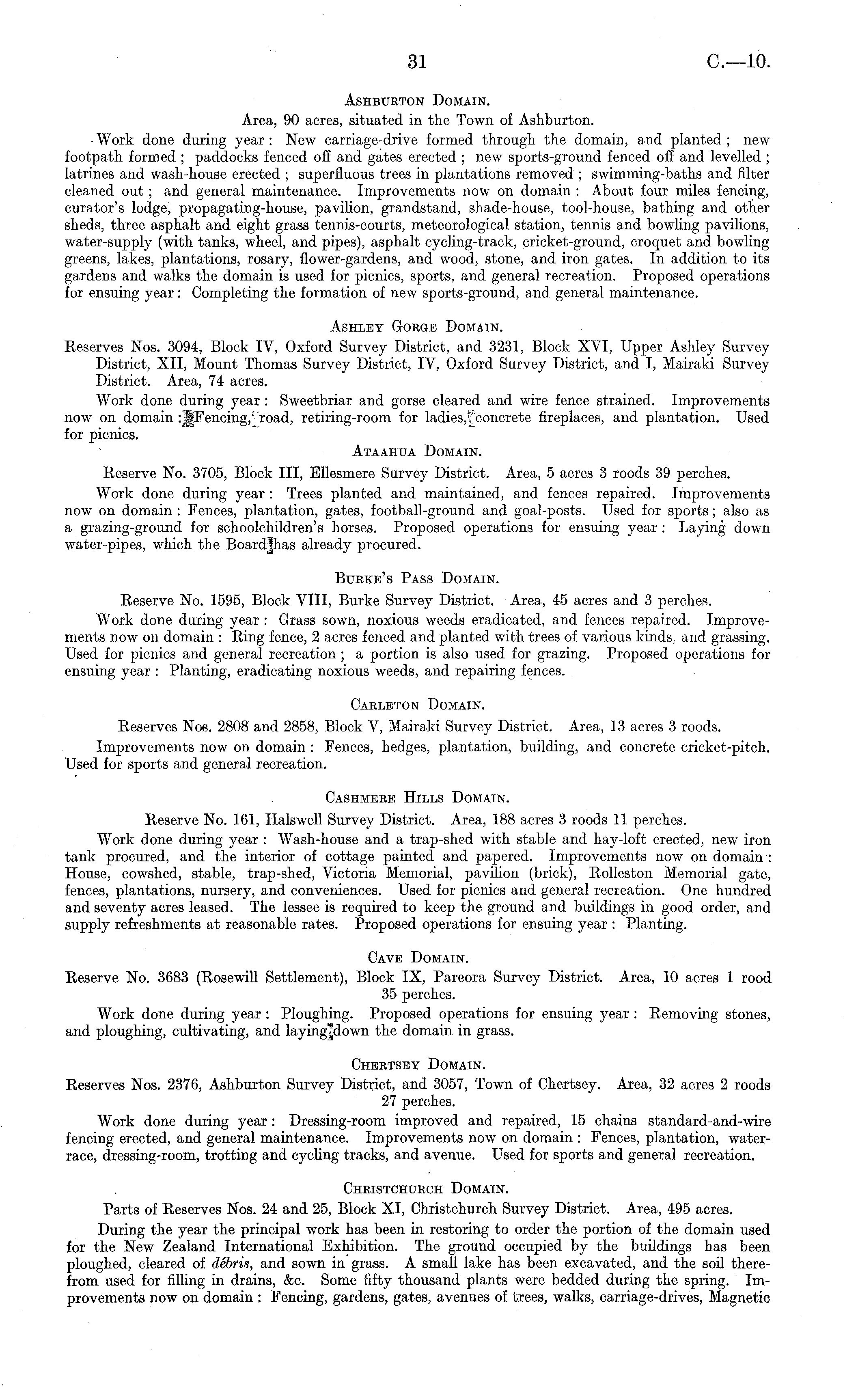 Ashbueton Domain. Area, 90 acres, situated in the Town of Ashburton. ■ Work done during year : New carriage-drive formed through the domain, and planted ; new footpath formed ; paddocks fenced off and gates erected ; new sports-ground fenced of! and levelled ; latrines and wash-house erected ; superfluous trees in plantations removed ; swimming-baths and filter cleaned out; and general maintenance. Improvements now on domain : About four miles fencing, curator's lodge, propagating-house, pavilion, grandstand, shade-house, tool-house, bathing and other sheds, three asphalt and eight grass tennis-courts, meteorological station, tennis and bowling pavilions, water-supply (with tanks, wheel, and pipes), asphalt cycling-track, cricket-ground, croquet and bowling greens, lakes, plantations, rosary, flower-gardens, and wood, stone, and iron gates. In addition to its gardens and walks the domain is used for picnics, sports, and general recreation. Proposed operations for ensuing year : Completing the formation of new sports-ground, and general maintenance. Ashley Gorge Domain. Reserves Nos. 3094, Block IV, Oxford Survey District, and 3231, Block XVI, Upper Ashley Survey District, XII, Mount Thomas Survey District, IV, Oxford Survey District, and I, Mairaki Survey District. Area, 74 acres. Work done during year : Sweetbriar and gorse cleared and wire fence strained. Improvements now on domain :J|Fencing,^road, retiring-room for ladies,fconcrete fireplaces, and plantation. Used for picnics. Ataahua Domain. Reserve No. 3705, Block 111, Ellesmere Survey District. Area, 5 acres 3 roods 39 perches. Work done during year : Trees planted and maintained, and fences repaired. Improvements now on domain : Fences, plantation, gates, football-ground and goal-posts. Used for sports; also as a grazing-ground for schoolchildren's horses. Proposed operations for ensuing year : Laying down water-pipes, which the Board|has already procured. Bueke's Pass Domain. Reserve No. 1595, Block VIII, Burke Survey District. Area, 45 acres and 3 perches. Work done during year : Grass sown, noxious weeds eradicated, and fences repaired. Improvements now on domain : Ring fence, 2 acres fenced and planted with trees of various kinds, and grassing. Used for picnics and general recreation ; a portion is also used for grazing. Proposed operations for ensuing year : Planting, eradicating noxious weeds, and repairing fences. Cableton Domain. Reserves Nob. 2808 and 2858, Block V, Mairaki Survey District. Area, 13 acres 3 roods. Improvements now on domain : Fences, hedges, plantation, building, and concrete cricket-pitch. Used for sports and general recreation. Cashmeee Hills Domain. Reserve No. 161, Halswell Survey District. Area, 188 acres 3 roods 11 perches. Work done during year : Wash-house and a trap-shed with stable and hay-loft erected, new iron tank procured, and the interior of cottage painted and papered. Improvements now on domain : House, cowshed, stable, trap-shed, Victoria Memorial, pavilion (brick), Rolleston Memorial gate, fences, plantations, nursery, and conveniences. Used for picnics and general recreation. One hundred and seventy acres leased. The lessee is required to keep the ground and buildings in good order, and supply refreshments at reasonable rates. Proposed operations for ensuing year : Planting. Cave Domain. Reserve No. 3683 (Rosewill Settlement), Block IX, Pareora Survey District. Area, 10 acres 1 rood 35 perches. Work done during year : Ploughing. Proposed operations for ensuing year : Removing stones, and ploughing, cultivating, and laying?down the domain in grass. Chertsey Domain. Reserves Nos. 2376, Ashburton Survey District, and 3057, Town of Chertsey. Area, 32 acres 2 roods 27 perches. Work done during year : Dressing-room improved and repaired, 15 chains standard-and-wire fencing erected, and general maintenance. Improvements now on domain : Fences, plantation, waterrace, dressing-room, trotting and cycling tracks, and avenue. Used for sports and general recreation. Cheistchdrch Domain. Parts of Reserves Nos. 24 and 25, Block XI, Christchurch Survey District. Area, 495 acres. During the year the principal work has been in restoring to order the portion of the domain used for the New Zealand International Exhibition. The ground occupied by the buildings has been ploughed, cleared of debris, and sown in grass. A small lake has been excavated, and the soil therefrom used for filling in drains, &c. Some fifty thousand plants were bedded during the spring. Improvements now on domain : Fencing, gardens, gates, avenues of trees, walks, carriage-drives, Magnetic