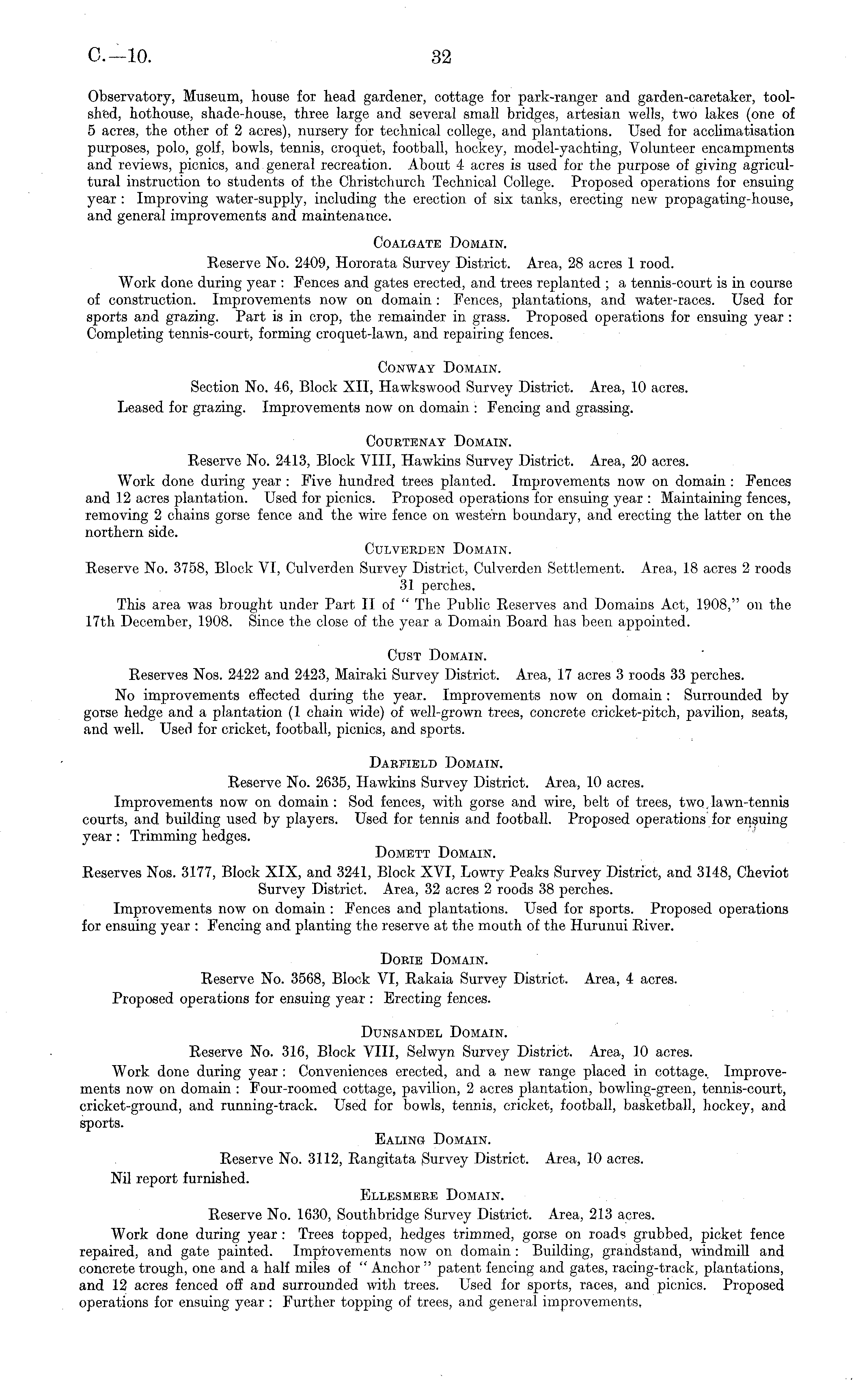 Observatory, Museum, house for head gardener, cottage for park-ranger and garden-caretaker, toolsh'ed, hothouse, shade-house, three large and several small bridges, artesian wells, two lakes (one of 5 acres, the other of 2 acres), nursery for technical college, and plantations. Used for acclimatisation purposes, polo, golf, bowls, tennis, croquet, football, hockey, model-yachting, Volunteer encampments and reviews, picnics, and. general recreation. About 4 acres is used for the purpose of giving agricultural instruction to students of the Christchurch Technical College. Proposed operations for ensuing year : Improving water-supply, including the erection of six tanks, erecting new propagating-house, and general improvements and maintenance. Coalgate Domain. Reserve No. 2409, Hororata Survey District. Area, 28 acres 1 rood. Work done during year : Fences and gates erected, and trees replanted ; a tennis-court is in course of construction. Improvements now on domain : Fences, plantations, and water-races. Used for sports and grazing. Part is in crop, the remainder in grass. Proposed operations for ensuing year : Completing tennis-court, forming croquet-lawn, and repairing fences. Conway Domain. Section No. 46, Block XII, Hawkswood Survey District. Area, 10 acres. Leased for grazing. Improvements now on domain : Fencing and grassing. Courtenay Domain. Reserve No. 2413, Block VIII, Hawkins Survey District. Area, 20 acres. Work done during year : Five hundred trees planted. Improvements now on domain : Fences and 12 acres plantation. Used for picnics. Proposed operations for ensuing year : Maintaining fences, removing 2 chains gorse fence and the wire fence on western boundary, and erecting the latter on the northern side. Culveeden Domain. Reserve No. 3758, Block VI, Culverden Survey District, Culverden Settlement. Area, 18 acres 2 roods 31 perches. This area was brought under Part II of " The Public Reserves and Domains Act, 1908," on the 17th December, 1908. Since the close of the year a Domain Board has been appointed. Cust Domain. Reserves Nos. 2422 and 2423, Mairaki Survey District. Area, 17 acres 3 roods 33 perches. No improvements effected during the year. Improvements now on domain : Surrounded by gorse hedge and a plantation (1 chain wide) of well-grown trees, concrete cricket-pitch, pavilion, seats, and well. Used for cricket, football, picnics, and sports. Darfield Domain. Reserve No. 2635, Hawkins Survey District. Area, 10 acres. Improvements now on domain : Sod fences, with gorse and wire, belt of trees, two, lawn-tennis courts, and building used by players. Used for tennis and football. Proposed operations for ensuing year : Trimming hedges. Domett Domain. Reserves Nos. 3177, Block XIX, and 3241, Block XVI, Lowry Peaks Survey District, and 3148, Cheviot Survey District. Area, 32 acres 2 roods 38 perches. Improvements now on domain : Fences and plantations. Used for sports. Proposed operations for ensuing year : Fencing and planting the reserve at the mouth of the Hurunui River. Doric Domain. Reserve No. 3568, Block VI, Rakaia Survey District. Area, 4 acres. Proposed operations for ensuing year : Erecting fences. DUNSANDEL DOMAIN. Reserve No. 316, Block VIII, Selwyn Survey District. Area, 10 acres. Work done during year : Conveniences erected, and a new range placed in cottage.. Improvements now on domain : Four-roomed cottage, pavilion, 2 acres plantation, bowling-green, tennis-court, cricket-ground, and running-track. Used for bowls, tennis, cricket, football, basketball, hockey, and sports. Ealing Domain. Reserve No. 3112, Rangitata Survey District. Area, 10 acres. Nil report furnished. Ellesmere Domain. Reserve No. 1630, Southbridge Survey District. Area, 213 acres. Work done during year : Trees topped, hedges trimmed, gorse on roads grubbed, picket fence repaired, and gate painted. Improvements now on domain : Building, grandstand, windmill and concrete trough, one and a half miles of " Anchor " patent fencing and gates, racing-track, plantations, and 12 acres fenced off and surrounded with trees. Used for sports, races, and picnics. Proposed operations for ensuing year : Further topping of trees, and general improvements,