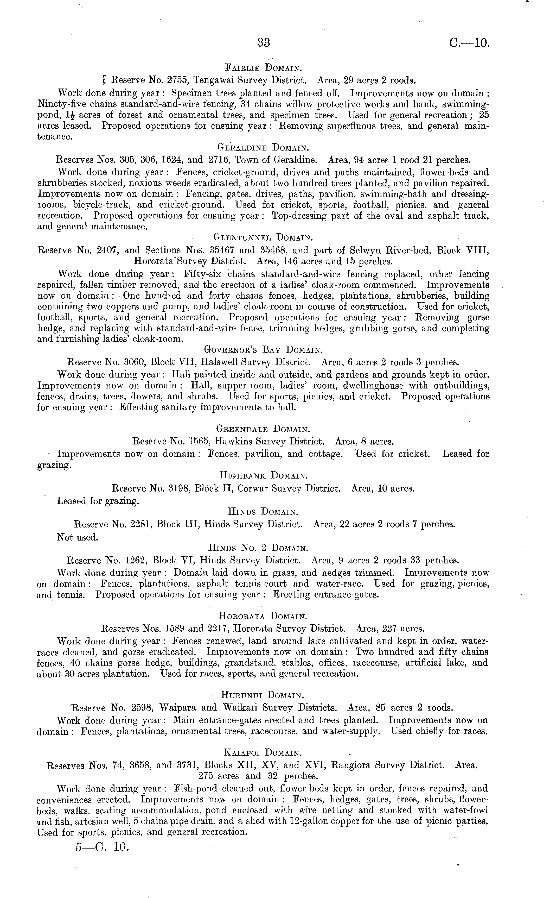 Fairlie Domain. I Eeserve No. 2755, Tengawai Survey District. Area, 29 acres 2 roods. Work done during year : Specimen trees planted and fenced off. Improvements now on domain : Ninety-five chains standard-and-wire fencing, 34 chains willow protective works and bank, swimmingpond, 1J acres of forest and ornamental trees, and specimen trees. Used for general recreation; 25 acres leased. Proposed operations for ensuing year; Kemoving superfluous trees, and general maintenance. Geraldine Domatn. Reserves Nos. 305, 306, 1624, and 2716, Town of Geraldine. Area, 94 acres 1 rood 21 perches. Work done during year : Fences, cricket-ground, drives and paths maintained, flower-beds and shrubberies stocked, noxious weeds eradicated, about two hundred trees planted, and pavilion repaired. Improvements now on domain : Fencing, gates, drives, paths, pavilion, swimming-bath and dressingrooms, bicycle-track, and cricket-ground. Used for cricket, sports, football, picnics, and general recreation. Proposed operations for ensuing year : Top-dressing part of the oval and asphalt track, and general maintenance. Glentunnel Domain. Reserve No. 2407, and Sections Nos. 35467 and 35468, and part of Selwyn River-bed, Block VIII, Hororata'Survey District. Area, 146 acres and 15 perches. Work done during year: Fifty-six chains standard-and-wire fencing replaced, other fencing repaired, fallen timber removed, and the erection of a ladies' cloak-room commenced. Improvements now on domain : One hundred and forty chains fences, hedges, plantations, shrubberies, building containing two coppers and pump, and ladies' cloak-room in course of construction. Used for cricket, football, sports, and general recreation. Proposed operations for ensuing year: Removing gorse hedge, and replacing with standard-and-wire fence, trimming hedges, grubbing gorse, and completing and furnishing ladies' cloak-room. Governor's Bay Domain. Reserve No. 3060, Block VII, Halswell Survey District. Area, 6 acres 2 roods 3 perches. Work done during year : Hall painted inside and outside, and gardens and grounds kept in order. Improvements now on domain : Hall, supper-room, ladies' room, dwellinghouse with outbuildings, fences, drains, trees, flowers, and shrubs. Used for sports, picnics, and cricket. Proposed operations for ensuing year : Effecting sanitary improvements to hall. Greendale Domain. Reserve No. 1565, Hawkins Survey District. Area, 8 acres. Improvements now on domain : Fences, pavilion, and cottage. Used for cricket. Leased for grazing. HiGtHBANK Domain. Reserve No. 3198, Block 11, Corwar Survey District. Area, 10 acres. Leased for grazing. Hinds Domain. Reserve No. 2281, Block 111, Hinds Survey District. Area, 22 acres 2 roods 7 perches. Not used. Hinds No. 2 Domain. Reserve No. 1262, Block VI, Hinds Survey District. Area, 9 acres 2 roods 33 perches. Work done during year : Domain laid down in grass, and hedges trimmed. Improvements now on domain : Fences, plantations, asphalt tennis-court and water-race. Used for grazing, picnics, and tennis. Proposed operations for ensuing year : Erecting entrance-gates. Hororata Domain. Reserves Nos. 1589 and 2217, Hororata Survey District. Area, 227 acres. Work done during year : Fences renewed, land around lake cultivated and kept in order, waterraces cleaned, and gorse eradicated. Improvements now on domain : Two hundred and fifty chains fences, 40 chains gorse hedge, buildings, grandstand, stables, offices, racecourse, artificial lake, and about 30 acres plantation. Used for races, sports, and general recreation. Hurunui Domain. Reserve No. 2598, Waipara and Waikari Survey Districts. Area, 85 acres 2 roods. Work done during year : Main entrance-gates erected and trees planted. Improvements now on domain : Fences, plantations, ornamental trees, racecourse, and water-supply. Used chiefly for races. Kaiapoi Domain. Reserves Nos. 74, 3658, and 3731, Blocks XII, XV, and XVI, Rangiora Survey District. Area, 275 acres and 32 perches. Work done during year : Fish-pond cleaned out, flower-beds kept in order, fences repaired, and conveniences erected. Improvements no.w on domain : Fences, hedges, gates, trees, shrubs, flowerbeds, walks, seating accommodation, pond enclosed with wire netting and stocked with water-fowl and fish, artesian well, 5 chains pipe drain, and a shed with 12-gallon copper for the use of picnic parties. Used for sports, picnics, and general recreation.