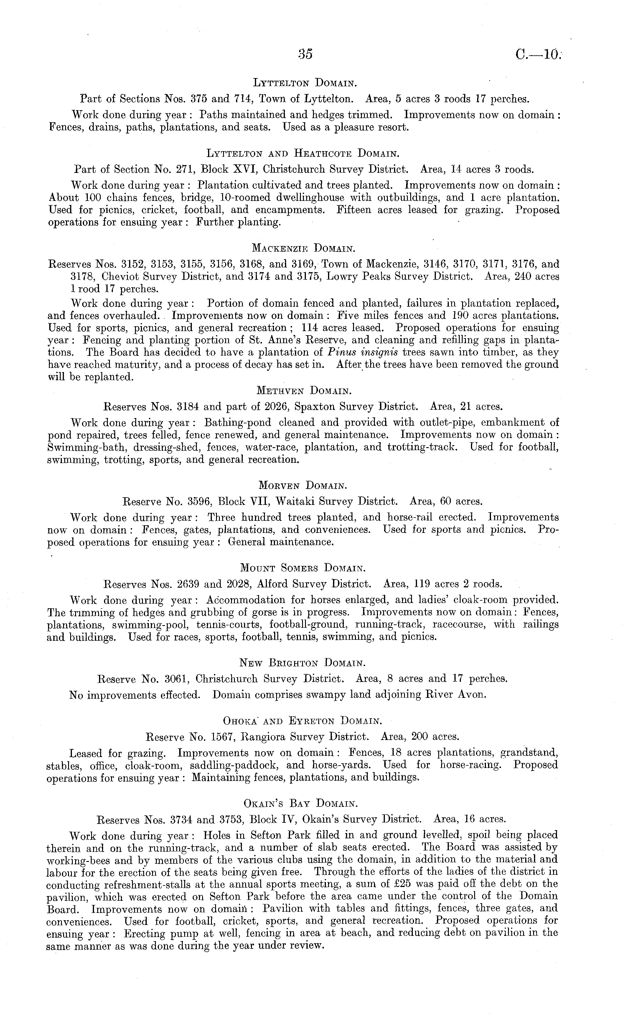 Lyttelton Domain. Part of Sections Nos. 375 and 714, Town of Lyttelton. Area, 5 acres 3 roods 17 perches. Work done during year : Paths maintained and hedges trimmed. Improvements now on domain : Fences, drains, paths, plantations, and seats. Used as a pleasure resort. Lyttelton and Heathcote Domain. Part of Section No. 271, Block XVI, Christchurch Survey District. Area, 14 acres 3 roods. Work done during year : Plantation cultivated and trees planted. Improvements now on domain : About 100 chains fences, bridge, 10-roomed dwellinghouse with outbuildings, and 1 acre plantation. Used for picnics, cricket, football, and encampments. Fifteen acres leased for grazing. Proposed operations for ensuing year : Further planting. Mackenzie Domain. Reserves Nos. 3152, 3153, 3155, 3156, 3168, and 3169, Town of Mackenzie, 3146, 3170, 3171, 3176, and 3178, Cheviot Survey District, and 3174 and 3175, Lowry Peaks Survey District. Area, 240 acres 1 rood 17 perches. Work done during year : Portion of domain fenced and planted, failures in plantation replaced, and fences overhauled. . Improvements now on domain : Five miles fences and 190 acres plantations. Used for sports, picnics, and general recreation ; 114 acres leased. Proposed operations for ensuing year : Fencing and planting portion of St. Anne's Reserve, and cleaning and refilling gaps in plantations. The Board has decided to have a plantation of Pinus insignis trees sawn into timber, as they have reached maturity, and a process of decay has set in. After the trees have been removed the ground will be replanted. Methven Domain. Reserves Nos. 3184 and part of 2026, Spaxton Survey District. Area, 21 acres. Work done during year : Bathing-pond cleaned and provided with outlet-pipe, embankment of pond repaired, trees felled, fence renewed, and general maintenance. Improvements now on domain : Swimming-bath, dressing-shed, fences, water-race, plantation, and trotting-track. Used for football, swimming, trotting, sports, and general recreation. Morven Domain. Reserve No. 3596, Block VII, Waitaki Survey District. Area, 60 acres. Work done during year : Three hundred trees planted, and horse-rail erected. Improvements now on domain : Fences, gates, plantations, and conveniences. Used for sports and picnics. Proposed operations for ensuing year : General maintenance. Mount Somers Domain. Reserves Nos. 2639 and 2028, Alford Survey District. Area, 119 acres 2 roods. Work done during year : Accommodation for horses enlarged, and ladies' cloak-room provided. The trimming of hedges and grubbing of gorse is in progress. Improvements now on domain: Fences, plantations, swimming-pool, tennis-courts, football-ground, running-track, racecourse, with railings and buildings. Used for races, sports, football, tennis, swimming, and picnics. New Brighton Domain. Reserve No. 3061, Christchurch Survey District. Area, 8 acres and 17 perches. No improvements effected. Domain comprises swampy land adjoining River Avon. Ohoka and Eyketon Domain. Reserve No. 1567, Rangiora Survey District. Area, 200 acres. Leased for grazing. Improvements now on domain : Fences, 18 acres plantations, grandstand, stables, office, cloak-room, saddling-paddock, and horse-yards. Used for horse-racing. Proposed operations for ensuing year : Maintaining fences, plantations, and buildings. Okain's Bay Domain. Reserves Nos. 3734 and 3753, Block IV, Okain's Survey District. Area, 16 acres. Work done during year : Holes in Sefton Park filled in and ground levelled, spoil being placed therein and on the running-track, and a number of slab seats erected. The Board was assisted by working-bees and by members of the various clubs using the domain, in addition to the material and labour for the erection of the seats being given free. Through the efforts of the ladies of the district in conducting refreshment-stalls at the annual sports meeting, a sum of £25 was paid off the debt on the pavilion, which was erected on Sefton Park before the area came under the control of the Domain Board. Improvements now on domain : Pavilion with tables and fittings, fences, three gates, and conveniences. Used for football, cricket, sports, and general recreation. Proposed operations for ensuing year : Erecting pump at well, fencing in area at beach, and reducing debt on pavilion in the same manner as was done during the year under review.