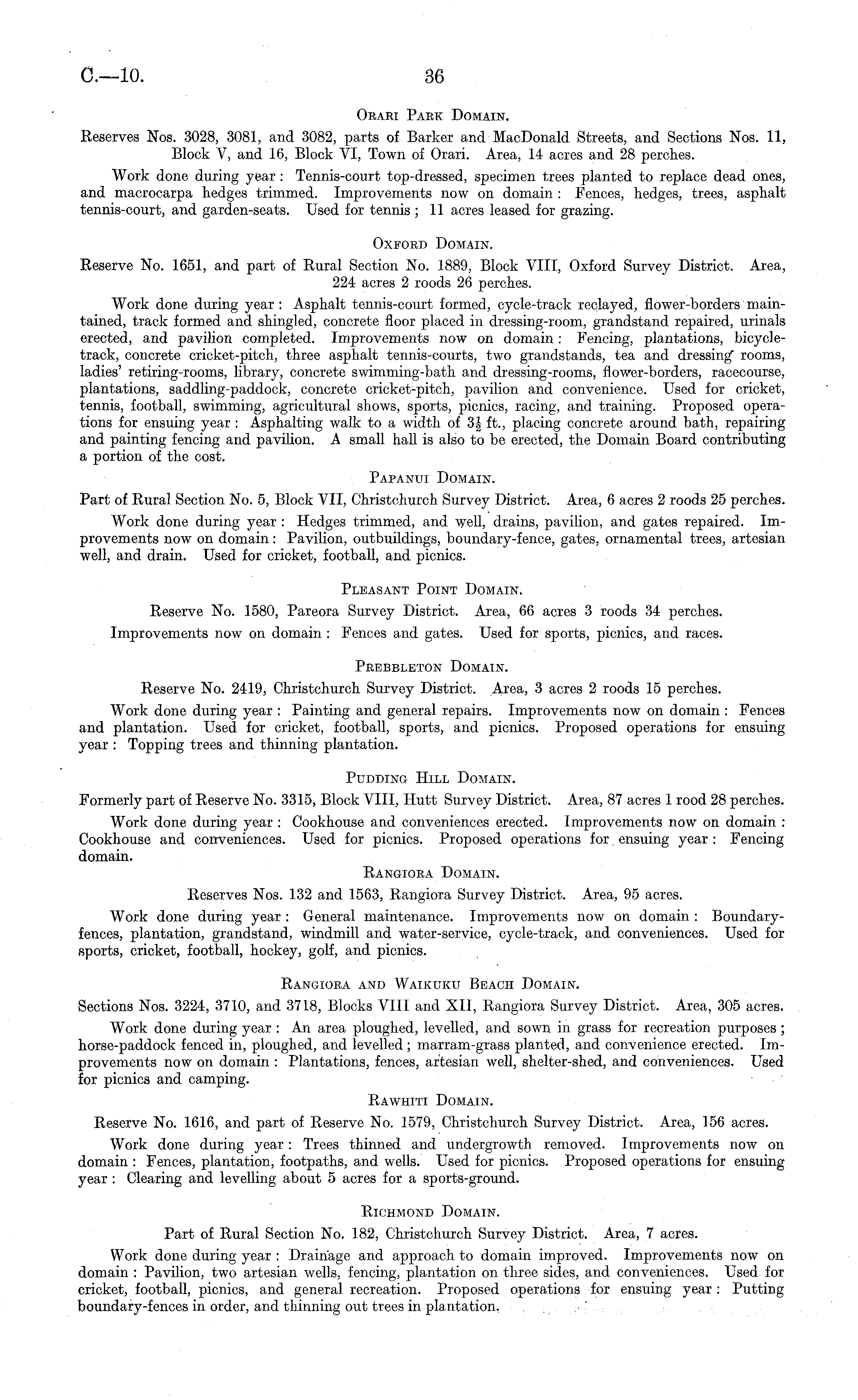 Oeari Park Domain. Reserves Nos. 3028, 3081, and 3082, parts of Barker and Mac Donald Streets, and Sections Nos. 11, Block V, and 16, Block VI, Town of Orari. Area, 14 acres and 28 perches. Work done during year : Tennis-court top-dressed, specimen trees planted to replace dead ones, and macrocarpa hedges trimmed. Improvements now on domain : Fences, hedges, trees, asphalt tennis-court, and garden-seats. Used for tennis ; 11 acres leased for grazing. Oxford Domain. Reserve No. 1651, and part of Rural Section No. 1889, Block VIII, Oxford Survey District. Area, 224 acres 2 roods 26 perches. Work done during year : Asphalt tennis-court formed, cycle-track reclayed, flower-borders maintained, track formed and shingled, concrete floor placed in dressing-room, grandstand repaired, urinals erected, and pavilion completed. Improvements now on domain: Fencing, plantations, bicycletrack, concrete cricket-pitch, three asphalt tennis-courts, two grandstands, tea and dressing" rooms, ladies' retiring-rooms, library, concrete swimming-bath and dressing-rooms, flower-borders, racecourse, plantations, saddling-paddock, concrete cricket-pitch, pavilion and convenience. Used for cricket, tennis, football, swimming, agricultural shows, sports, picnics, racing, and training. Proposed operations for ensuing year : Asphalting walk to a width of 3 J ft., placing concrete around bath, repairing and painting fencing and pavilion. A small hall is also to be erected, the Domain Board contributing a portion of the cost. Papanui Domain. Part of Rural Section No. 5, Block VII, Christchurch Survey District. Area, 6 acres 2 roods 25 perches. Work done during year : Hedges trimmed, and well, drains, pavilion, and gates repaired. Improvements now on domain : Pavilion, outbuildings, boundary-fence, gates, ornamental trees, artesian well, and drain. Used for cricket, football, and picnics. Pleasant Point Domain. Reserve No. 1580, Pareora Survey District. Area, 66 acres 3 roods 34 perches. Improvements now on domain : Fences and gates. Used for sports, picnics, and races. Peebbleton Domain. Reserve No. 2419, Christchurch Survey District. Area, 3 acres 2 roods 15 perches. Work done during year : Painting and general repairs. Improvements now on domain : Fences and plantation. Used for cricket, football, sports, and picnics. Proposed operations for ensuing year : Topping trees and thinning plantation. Pudding Hill Domain. Formerly part of Reserve No. 3315, Block VIII, Hutt Survey District. Area, 87 acres 1 rood 28 perches. Work done during year : Cookhouse and conveniences erected. Improvements now on domain : Cookhouse and conveniences. Used for picnics. Proposed operations for ensuing year: Fencing domain. Rangioea Domain. Reserves Nos. 132 and 1563, Rangiora Survey District. Area, 95 acres. Work done during year : General maintenance. Improvements now on domain : Boundaryfences, plantation, grandstand, windmill and water-service, cycle-track, and conveniences. Used for sports, cricket, football, hockey, golf, and picnics. Rangiora and Waikuku Beach Domain. Sections Nos. 3224, 3710, and 3718, Blocks VIII and XII, Rangiora Survey District. Area, 305 acres. Work done during year : An area ploughed, levelled, and sown in grass for recreation purposes ; horse-paddock fenced in, ploughed, and levelled; marram-grass planted, and convenience erected. Improvements now on domain : Plantations, fences, artesian well, shelter-shed, and conveniences. Used for picnics and camping. Rawhiti Domain. Reserve No. 1616, and part of Reserve No. 1579, Christchurch Survey District. Area, 156 acres. Work done during year: Trees thinned and undergrowth removed. Improvements now on domain : Fences, plantation, footpaths, and wells. Used for picnics. Proposed operations for ensuing year : Clearing and levelling about 5 acres for a sports-ground. Richmond Domain. Part of Rural Section No. 182, Christchurch Survey District. Area, 7 acres. Work done during year : Drainage and approach to domain improved. Improvements now on domain : Pavilion, two artesian wells, fencing, plantation on three sides, and conveniences. Used for cricket, football, picnics, and general recreation. Proposed operations for ensuing year : Putting boundary-fences in order, and thinning out trees in plantation.