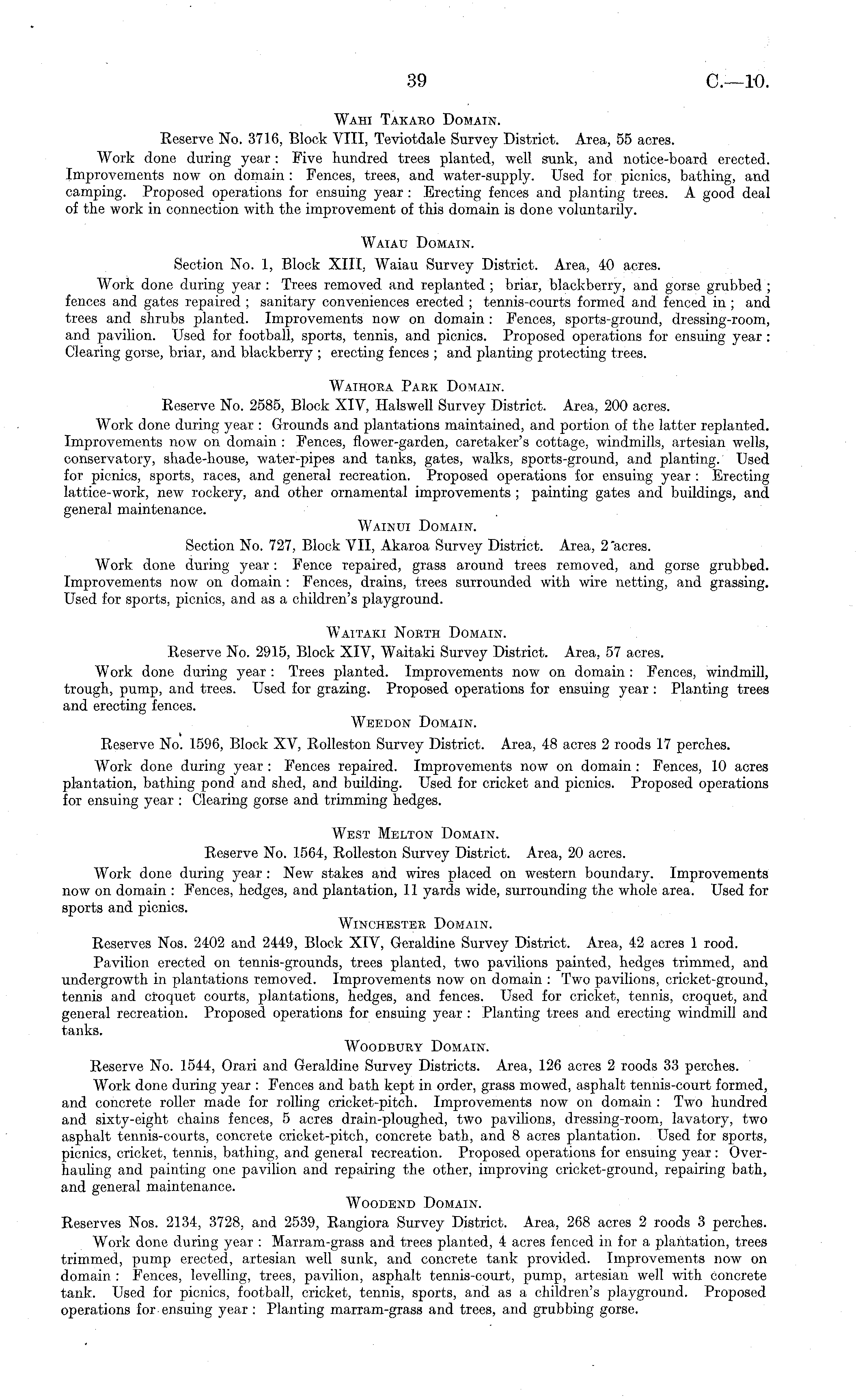 Wahi Takaeo Domain. Reserve No. 3716, Block VIII, Teviotdale Survey District. Area, 55 acres. Work done during year : Five hundred trees planted, well sunk, and notice-board erected. Improvements now on domain : Fences, trees, and water-supply. Used for picnics, bathing, and camping. Proposed operations for ensuing year : Erecting fences and planting trees. A good deal of the work in connection with, the improvement of this domain is done voluntarily. Waiau Domain. Section No. 1, Block XIII, Waiau Survey District. Area, 40 acres. Work done during year : Trees removed and replanted ; briar, blackberry, and gorse grubbed ; fences and gates repaired ; sanitary conveniences erected ; tennis-courts formed and fenced in ; and trees and shrubs planted. Improvements now on domain : Fences, sports-ground, dressing-room, and pavilion. Used for football, sports, tennis, and picnics. Proposed operations for ensuing year : Clearing gorse, briar, and blackberry ; erecting fences ; and planting protecting trees. Waihora Park Domain. Reserve No. 2585, Block XIV, Halswell Survey District. Area, 200 acres. Work done during year : Grounds and plantations maintained, and portion of the latter replanted. Improvements now on domain : Fences, flower-garden, caretaker's cottage, windmills, artesian wells, conservatory, shade-house, water-pipes and tanks, gates, walks, sports-ground, and planting. Used for picnics, sports, races, and general recreation. Proposed operations for ensuing year : Erecting lattice-work, new rockery, and other ornamental improvements ; painting gates and buildings, and general maintenance. Wainui Domain. Section No. 727, Block VII, Akaroa Survey District. Area, 2 "acres. Work done during year : Fence repaired, grass around trees removed, and gorse grubbed. Improvements now on domain : Fences, drains, trees surrounded with wire netting, and grassing. Used for sports, picnics, and as a children's playground. Waitaki North Domain. Reserve No. 2915, Block XIV, Waitaki Survey District. Area, 57 acres. Work done during year : Trees planted. Improvements now on domain : Fences, windmill, trough, pump, and trees. Used for grazing. Proposed operations for ensuing year : Planting trees and erecting fences. Wbedon Domain. Reserve No. 1596, Block XV, Rolleston Survey District. Area, 48 acres 2 roods 17 perches. Work done during year : Fences repaired. Improvements now on domain : Fences, 10 acres plantation, bathing pond and shed, and building. Used for cricket and picnics. Proposed operations for ensuing year : Clearing gorse and trimming hedges. West Melton Domain. Reserve No. 1564, Rolleston Survey District. Area, 20 acres. Work done during year : New stakes and wires placed on western boundary. Improvements now on domain : Fences, hedges, and plantation, 11 yards wide, surrounding the whole area. Used for sports and picnics. Winchester Domain. Reserves Nos. 2402 and 2449, Block XIV, G-eraldine Survey District. Area, 42 acres 1 rood. Pavilion erected on tennis-grounds, trees planted, two pavilions painted, hedges trimmed, and undergrowth in plantations removed. Improvements now on domain : Two pavilions, cricket-ground, tennis and croquet courts, plantations, hedges, and fences. Used for cricket, tennis, croquet, and general recreation. Proposed operations for ensuing year : Planting trees and erecting windmill and tanks. Woodbury Domain. Reserve No. 1544, Orari and Geraldine Survey Districts. Area, 126 acres 2 roods 33 perches. Work done during year : Fences and bath kept in order, grass mowed, asphalt tennis-court formed, and concrete roller made for rolling cricket-pitch. Improvements now on domain : Two hundred and sixty-eight chains fences, 5 acres drain-ploughed, two pavilions, dressing-room, lavatory, two asphalt tennis-courts, concrete cricket-pitch, concrete bath, and 8 acres plantation. Used for sports, picnics, cricket, tennis, bathing, and general recreation. Proposed operations for ensuing year: Overhauling and painting one pavilion and repairing the other, improving cricket-ground, repairing bath, and general maintenance. Woodend Domain. Reserves Nos. 2134, 3728, and 2539, Rangiora Survey District. Area, 268 acres 2 roods 3 perches. Work done during year : Marram-grass and trees planted, 4 acres fenced in for a plantation, trees trimmed, pump erected, artesian well sunk, and concrete tank provided. Improvements now on domain : Fences, levelling, trees, pavilion, asphalt tennis-court, pump, artesian well with concrete tank. Used for picnics, football, cricket, tennis, sports, and as a children's playground. Proposed operations for ensuing year : Planting marram-grass and trees, and grubbing gorse.