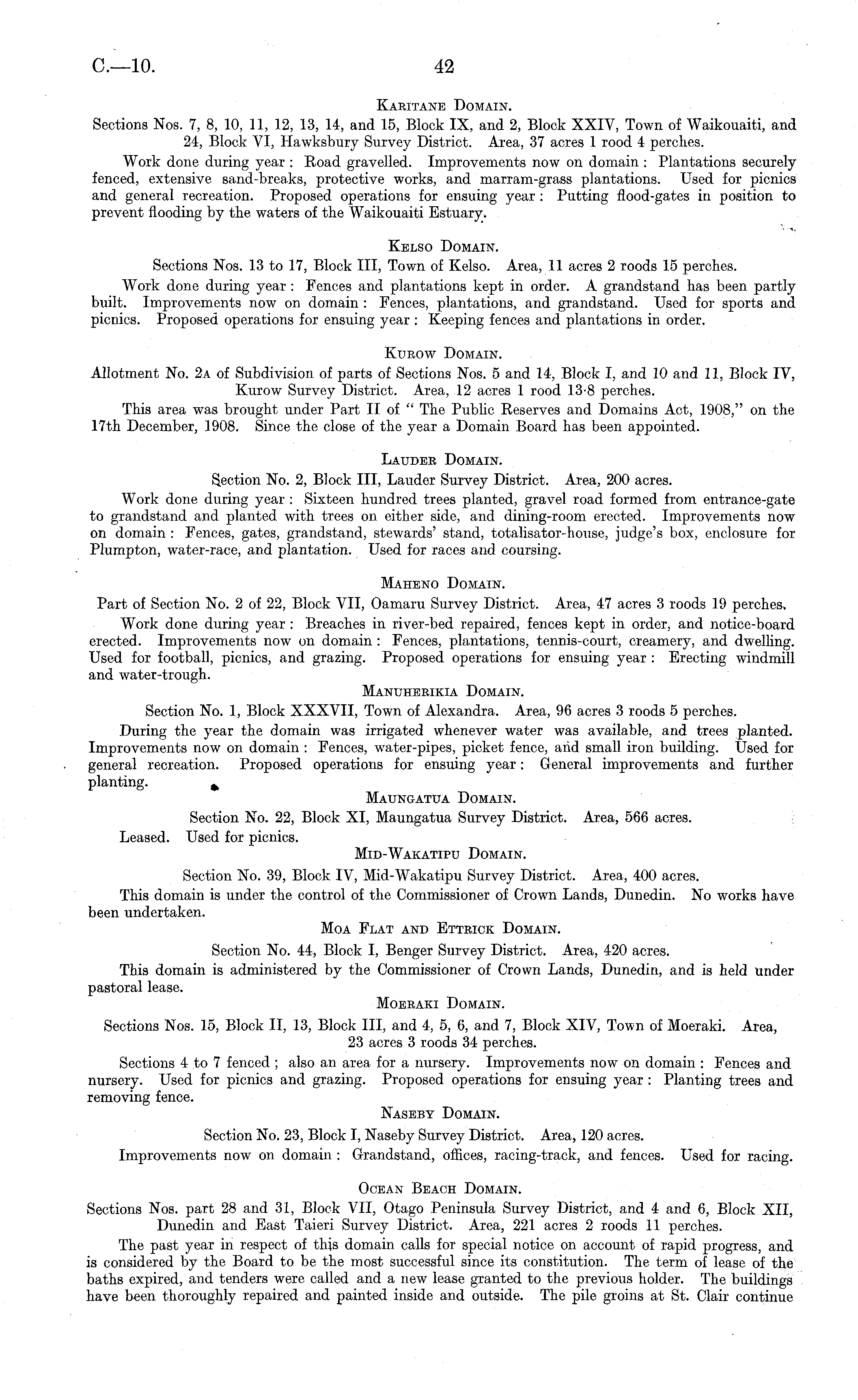 Kaeitane Domain. Sections Nos. 7, 8, 10, 11, 12, 13, 14, and 15, Block IX, and 2, Block XXIV, Town of Waikouaiti, and 24, Block VI, Hawksbury Survey District. Area, 37 acres 1 rood 4 perches. Work done during year : Eoad gravelled. Improvements now on domain : Plantations securely fenced, extensive sand-breaks, protective works, and marram-grass plantations. Used for picnics and general recreation. Proposed operations for ensuing year : Putting flood-gates in position to prevent flooding by the waters of the Waikouaiti Estuary. Kelso Domain. Sections Nos. 13 to 17, Block 111, Town of Kelso. Area, 11 acres 2 roods 15 perches. Work done during year : Fences and plantations kept in order. A grandstand has been partly built. Improvements now on domain : Fences, plantations, and grandstand. Used for sports and picnics. Proposed operations for ensuing year : Keeping fences and plantations in order. Kueow Domain. Allotment No. 2a of Subdivision of parts of Sections Nos. 5 and 14, Block I, and 10 and 11, Block IV, Kurow Survey District. Area, 12 acres 1 rood 138 perches. This area was brought under Part II of " The Public Keserves and Domains Act, 1908," on the 17th December, 1908. Since the close of the year a Domain Board has been appointed. Lauder Domain. Section No. 2, Block 111, Lauder Survey District. Area, 200 acres. Work done during year : Sixteen hundred trees planted, gravel road formed from entrance-gate to grandstand and planted with trees on either side, and dining-room erected. Improvements now on domain : Fences, gates, grandstand, stewards' stand, totalisator-house, judge's box, enclosure for Plumpton, water-race, and plantation. Used for races and coursing. Maheno Domain. Part of Section No. 2of 22, Block VII, Oamaru Survey District. Area, 47 acres 3 roods 19 perches. Work done during year : Breaches in river-bed repaired, fences kept in order, and notice-board erected. Improvements now on domain : Fences, plantations, tennis-court, creamery, and dwelling. Used for football, picnics, and grazing. Proposed operations for ensuing year : Erecting windmill and water-trough. Manuherikia Domain. Section No. 1, Block XXXVII, Town of Alexandra. Area, 96 acres 3 roods 5 perches. During the year the domain was irrigated whenever water was available, and trees planted. Improvements now on domain : Fences, water-pipes, picket fence, and small iron building. Used for general recreation. Proposed operations for ensuing year: General improvements and further planting. Maungatua Domain. Section No. 22, Block XI, Maungatua Survey District. Area, 566 acres. Leased. Used for picnics. Mid-Wakatipu Domain. Section No. 39, Block IV, Mid-Wakatipu Survey District. Area, 400 acres. This domain is under the control of the Commissioner of Crown Lands, Dunedin. No works have been undertaken. Moa Flat and Ettrick Domain. Section No. 44, Block I, Benger Survey District. Area, 420 acres. This domain is administered by the Commissioner of Crown Lands, Dunedin, and is held under pastoral lease. Moeraki Domain. Sections Nos. 15, Block 11, 13, Block 111, and 4, 5, 6, and 7, Block XIV, Town of Moeraki. Area, 23 acres 3 roods 34 perches. Sections 4to 7 fenced ; also an area for a nursery. Improvements now on domain : Fences and nursery. Used for picnics and grazing. Proposed operations for ensuing year : Planting trees and removing fence. Naseby Domain. Section No. 23, Block I, Naseby Survey District. Area, 120 acres. Improvements now on domain : Grandstand, offices, racing-track, and fences. Used for racing. Ocean Beach Domain. Sections Nos. part 28 and 31, Block VII, Otago Peninsula Survey District, and 4 and 6, Block XII, Dunedin and East Taieri Survey District. Area, 221 acres 2 roods 11 perches. The past year in respect of this domain calls for special notice on account of rapid progress, and is considered by the Board to be the most successful since its constitution. The term of lease of the baths expired, and tenders were called and a new lease granted to the previous holder. The buildings have been thoroughly repaired and painted inside and outside. The pile groins at St. Clair continue