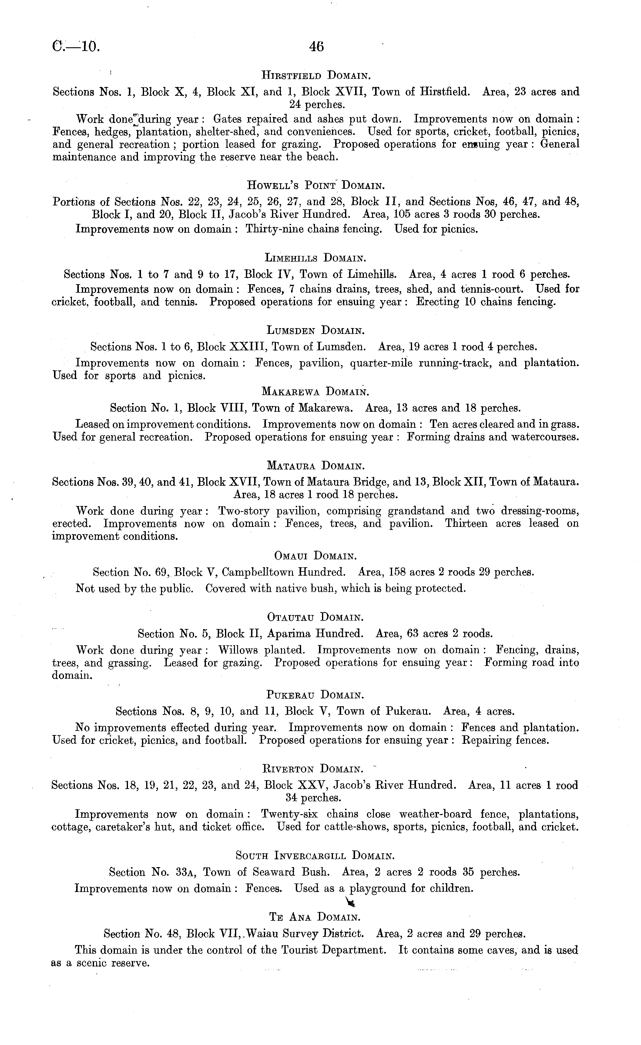 HiESTFiBLD Domain. Sections Nos. 1, Block X, 4, Block XI, and 1, Block XVII, Town of Hirstfield. Area, 23 acres and 24 perches. Work donejluring year : Gates repaired and ashes put down. Improvements now on domain : Fences, hedges, plantation, shelter-shed, and conveniences. Used for sports, cricket, football, picnics, and general recreation ; portion leased for grazing. Proposed operations for ensuing year : General maintenance and improving the reserve near the beach. Howell's Point Domain. Portions of Sections Nos. 22, 23, 24, 25, 26, 27, and 28, Block 11, and Sections Nos, 46, 47, and 48, Block I, and 20, Block 11, Jacob's Eiver Hundred. Area, 105 acres 3 roods 30 perches. Improvements now on domain : Thirty-nine chains fencing. Used for picnics. Limehills Domain. Sections Nos. Ito 7 and 9to 17, Block IV, Town of Limehills. Area, 4 acres 1 rood 6 perches. Improvements now on domain : Fences, 7 chains drains, trees, shed, and tennis-court. Used for cricket, football, and tennis. Proposed operations for ensuing year : Erecting 10 chains fencing. Lumsden Domain. Sections Nos. Ito 6, Block XXIII, Town of Lumsden. Area, 19 acres 1 rood 4 perches. Improvements now on domain : Fences, pavilion, quarter-mile running-track, and plantation. Used for sports and picnics. Makaeewa Domain. Section No. 1, Block VIII, Town of Makarewa. Area, 13 acres and 18 perches. Leased on improvement conditions. Improvements now on domain : Ten acres cleared and in grass. Used for general recreation. Proposed operations for ensuing year : Forming drains and watercourses. Matauea Domain. Sections Nos. 39,40, and 41, Block XVII, Town of Mataura Bridge, and 13, Block XII, Town of Mataura. Area, 18 acres 1 rood 18 perches. Work done during year : Two-story pavilion, comprising grandstand and two dressing-rooms, erected. Improvements now on domain: Fences, trees, and pavilion. Thirteen acres leased on improvement conditions. Omaui Domain. Section No. 69, Block V, Campbelltown Hundred. Area, 158 acres 2 roods 29 perches. Not used by the public. Covered with native bush, which is being protected. Otautau Domain. Section No. 5, Block 11, Aparima Hundred. Area, 63 acres 2 roods. Work done during year : Willows planted. Improvements now on domain : Fencing, drains, trees, and grassing. Leased for grazing. Proposed operations for ensuing year: Forming road into domain. Pukeeau Domain. Sections Nos. 8, 9, 10, and 11, Block V, Town of Pukerau. Area, 4 acres. No improvements effected during year. Improvements now on domain : Fences and plantation. Used for cricket, picnics, and football. Proposed operations for ensuing year : Repairing fences. Riveeton Domain. Sections Nos. 18, 19, 21, 22, 23, and 24, Block XXV, Jacob's River Hundred. Area, 11 acres 1 rood 34 perches. Improvements now on domain: Twenty-six chains close weather-board fence, plantations, cottage, caretaker's hut, and ticket office. Used for cattle-shows, sports, picnics, football, and cricket. South Inveecargill Domain. Section No. 33a, Town of Seaward Bush. Area, 2 acres 2 roods 35 perches. Improvements now on domain : Fences. Used as a playground for children. V Te Ana Domain. Section No. 48, Block VII, .Waiau Survey District. Area, 2 acres and 29 perches. This domain is under the control of the Tourist Department. It contains some caves, and is used as a scenic reserve.