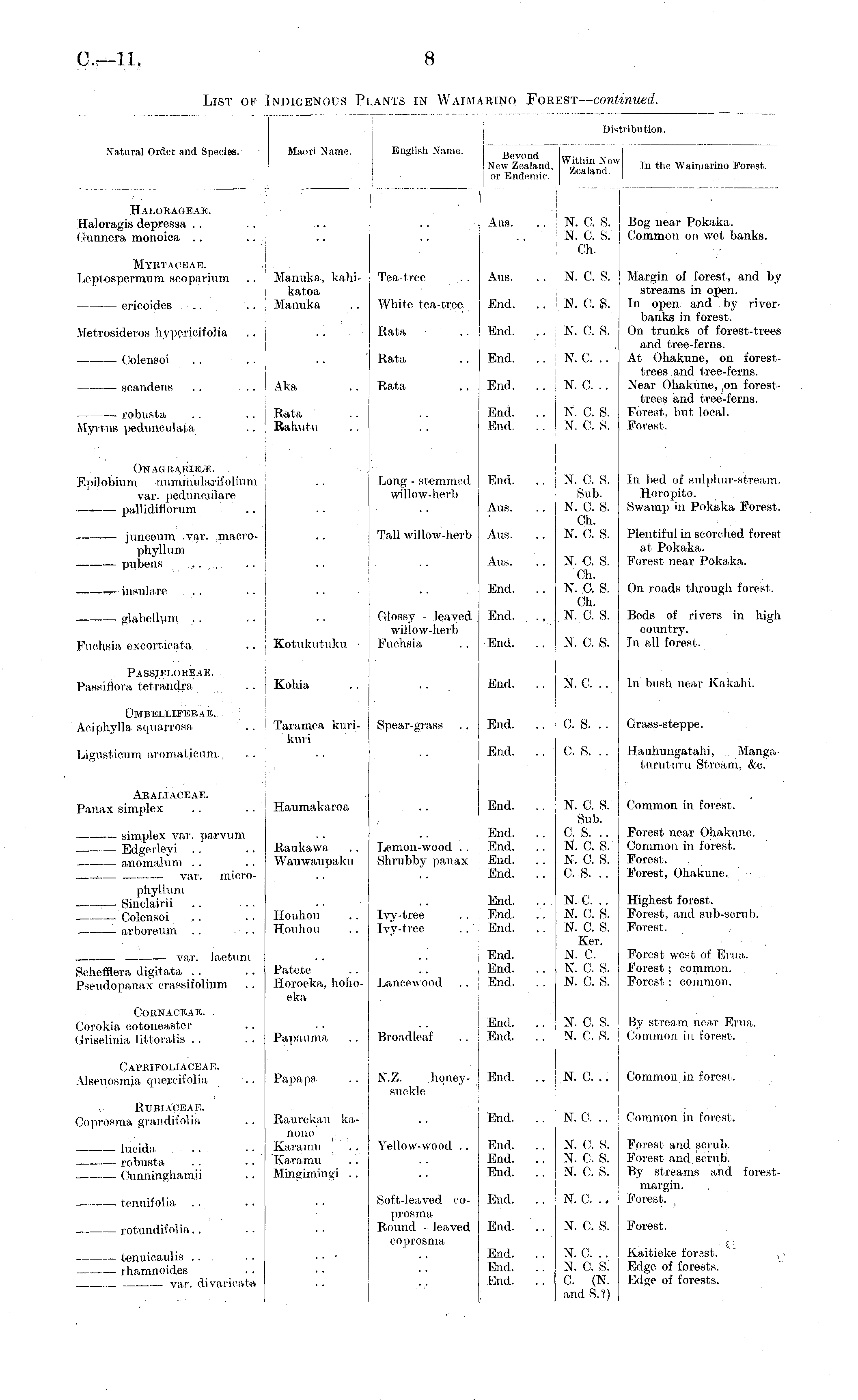 Diil Natural Order and Species. Maori Name. English Name, Bevond New Zealand. W |J££,S eW or Endemic iea l aIM - ■ribution. In the Waimarino Forest. Hai.orageae. Haloragis depressa .. .. .. ... • Aus. .. N. C. 8. Gunnera monoica .. .. .. .. .. N. C. 8. Ch. Bog near Pokaka. Common on wet banks. Myrtaceae. Leptospermum scoparium .. Manuka, kahi- ! Tea-tree .. Aus. .. N. C. S. katoa ericoides .. .. Manuka . . White tea-tree End. .. N. C. 8. Margin of forest, and by streams in open. In open and by riverbanks in forest. On trunks of forest-trees and tree-ferns. At Ohakune, on foresttrees and tree-ferns. Near Ohakune, ,on foresttrees and tree-ferns. Forest, but local. Forest. Metrosideros hypericifolia ., I .. .', • Rata . . End. .. N. C. 8. Colensoi .. ' ■ • • • Rata ■ • End. ■ • N. C. .. scandens .. .. I Aka .. Rata .. End. .. N. C. .. robiista .. .. j Rata .. .. End. .. N. C. S. Myrtus pedunculata .. ' Rahutu ... .. End. .. J N. 0. S. ■..■'.•• i in bed of sulphur-stream, Horopito. Swamp in Pokaka Forest. 1 ■ . OnaghaRIE/E. Epilobium niimmularifolium [ .. hong - stemmed End. . . N. C. S. var. pedunculare willow-herb Sub. —- pallidiflorum .. .. .. Aus. .. N. C. S. Ch. juneeiim var. macro- .. Tall willow-herb Aus. .. N. C. S. phyllum pubens j .. . . Aus. .. N. C. S. Ch. insulare .. .. I .. . . End. .. N. C, 8. Ch. glabellvm .. .. . . Glossy - leaved End. ... N. C. 8. willow-herb Fuchsia excorticata .. Kotukuluku Fuchsia . . End. . . N. C. S. Plentiful in scorched forest at Pokaka. Forest near Pokaka. On roads through forest. Beds of livers in high country. In all forest. Passjfj.oreae. Passiflora tetrandra .. j Kohia . . .. End. . . N. C. .. In bush near Kakahi. Umbelliferae. Aciphylla squarrosa . .1 Taramea kuri- Spear-grass .. End. .. C. S. .. kuri Grass-steppe. Ligusticum aronraticunr . . . . ■ ■ End. . . G. S. .,. Hauhungatahi, Mangaturuturii Stream, Ate. Araliaceae. j Panax simplex .. . . Haumakaroa .. End. .. N. C. S. Sub. simplex var. parvum .. . • End. .. C. S. .. Edgeileyi . . .. Raukawa . . Lemon-wood . . End. .. N. C. S. anomalum . . . . Wauwaupaku Shrubby panax End. .. N. C. 8. var. micro- .. • • End. .. C. S. .. phyllum Sinclairii .. .. .. • • End. .. , N. C. . . Colensoi .. . . Houhou .. Ivy-tree .. End. . . N. C. S. arboreum .. .. Houhou . . Ivy-tree ..' End. .. N. C. 8. Ker. var. laetum .. • • End. N. C. Schefflera digitata .. .. Patete .. ... End. .. N. C. S. Pseudopanax crassifolium .. Horoeka. holro- Lancewood .. ' End. .. N. 0. 8. eka Common in forest. Forest near Ohakune. Common in forest. Forest. Forest, Ohakune. Highest forest. Forest, and sub-scrub. Forest. Forest west of Erua. Forest; common. Forest; common. Cornaoeae. Corokia cotoneaster .. .. • • | End. .. N. C. S. Griselinia littoralis .. .. Papauma .. Broadleaf .. End. .. N. C. S. | By stream near Erua. Common in forest. Caprifoltaceae. j Alseuosmia qurrcifolia :.. Papapa .. N.Z. .honey- ; End. .. N. C. .. suckle Common in forest. Rubtaceae. Co|irosma grandifolia .. Raurekau ka- .. End. .. N. C. .. nono lucida .. • • Karamu ' .. Yellow-wood .. End. .. N. C. S. robusta . . .. Karamu .. . . End. .. N. C. S. Cunninghamii .. Mingimingi .. . . End. .. N. C. 8. Common in forest. Forest and scrub. Forest and scrub. By streams and forestmargin. Forest. tenuifolia .. .. • • Soft-leaved co- End. .. N. C. . . prosma rotundifolia.. .. .. Round - leaved End. .. N. C. S. Forest. coprosma tenuicaulis . . .. .. • • • End. .. N. C. .. ihamnoides .. • • • • End. .. N. C. S. var. divaricata .. .. End. .. C. (N. andS.?) Kaitieke forest. Edge of forests. Edge of forests.