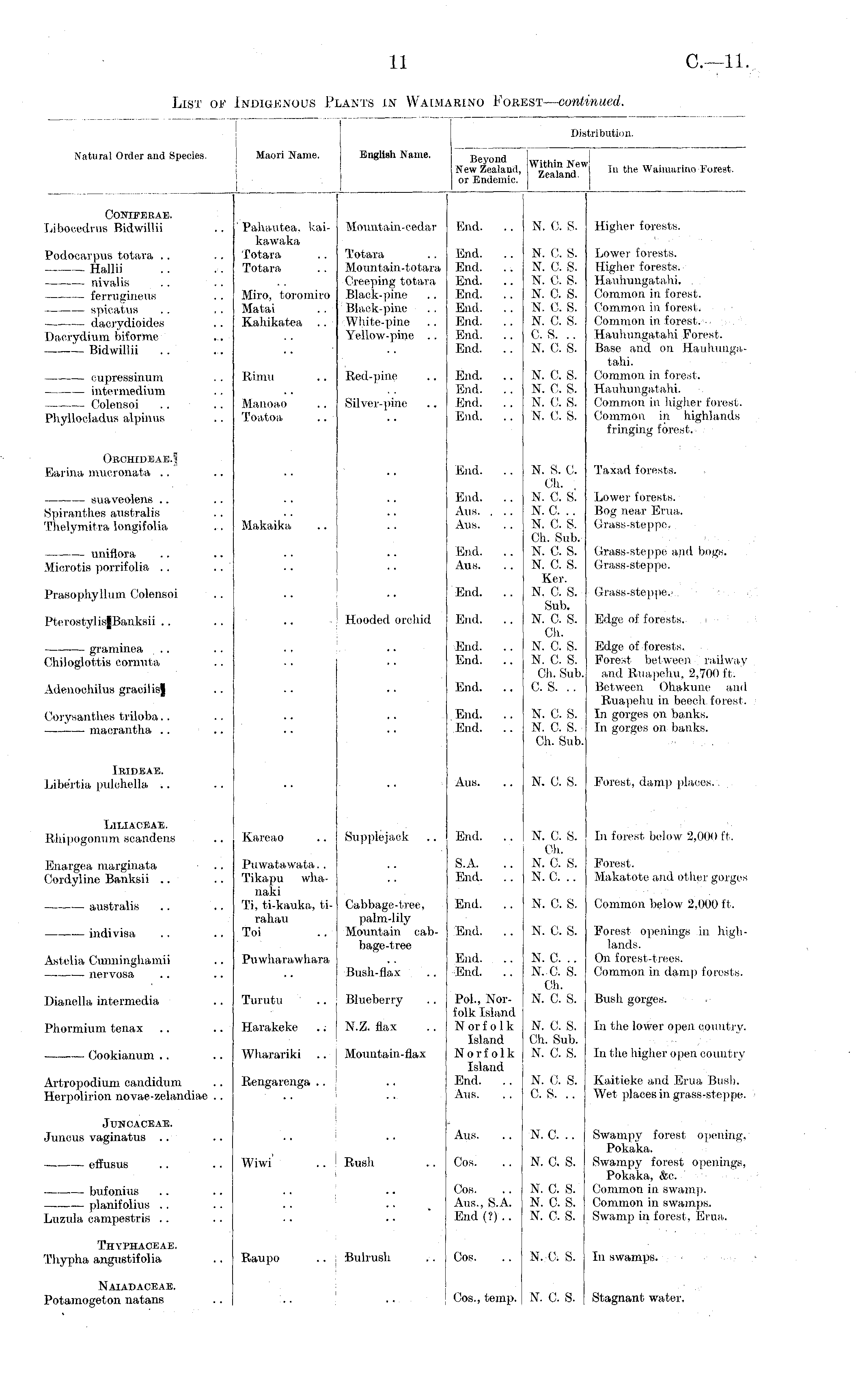 Natural Order and Species. ... i Maori Name. English Name. Di Beyond wit , h i n N( ,. New Zealand, or Endemic. Zealand - Dis itribution, J i r In the Wiihmmno i'urest. COKIFERAE. Libocedrus Bidwillii End. .. N. C. 8. Higher forests. Podooarpus totara .. Hallii nivalis ferruginous spicatus dacrydioides Dacrydium biforme Bidwillii Pahautea. kaikawaka Totara Totara Mountain-cedar Totara Mountain-totara Creeping totara Black-pine Black-pine White-pine Yellow-pine .. End. .. End. . . End. .. End. End. .. End. .. End. .. End. .. N. C. 8. N. C. S. N. C. S. N. C. S. N. C. S. N. C. 8. c. s. .. N. C. S. Lower- forests. Higher forests. Hauhungatahi. Common in forest. Common in forest. Common in forest. Hauhungatahi Forest. Base and on Hauhungatahi. Miro, toromiro Matai Kahikatea cupressinum intermedium Colensoi Phyllocladus alpinus Rimu Manoao Toatoa Red-pine Silver-pine End. End. .. End. . . End. .. N. C. S. N. C. S. N. C. S. N. C. S. Common in forest. Hauhungatahi. Common in higher forest. Common in highlands fringing forest. ()rchideae.5 Earina mucronata .. End. N. 8. C. Ch. N. C. S. N. C. .. N. C. S. Ch. Sub. N. C. S. N. 0. S. Ker. N. C. S. Sub. n. a s. Ch. n. a s. n. a s. Ch. Sub. as. .. Taxad forests. suaveolens Spiranthes australis Thelymitra longifolia Makaika End. .. Aus. . .. Aus. Lower forests. Bog near Erua. Grass-steppe. uniflora Microtis porrifolia End. Aus. Grass-steppe' and bogs. Grass-steppe. Prasophyllum Colensoi End. .. Grass-steppe.. PterostylisfBanksii .. Hooded orchid End. .. Edge of forests. . i •■ graminea Chiloglottis cornuta End. .. End. Edge of forests. Forest between railway and Ruapchu, 2,700 ft. ' Between Ohakune ami Ruapehu in beech forest. In gorges on banks. In gorges on banks. Adenochilus gracilis] End. .. Corysantb.es triloba.. macrantha End. End. .. n. a s. n. a s. Ch. Sub. IIUDEAE. Libe'rtia pulehella .. Aus. n. a 8. Forest, damp places. LlEIAOEAE. Rhipogonum scandens Kar-eao Kar-eao Supplejack End. .. n. a s. Ch. n. a s. n. a .. In forest below 2,001) ft. Enargea marginata Cordyline Banksii .. australis Puwatawata.. Tikapu whauaki Ti, ti-kauka, tirahau Toi Puwatu Tikapu uaki Ti, ti-k rahai Toi r»„...r..., iawat u v i kauki HI ita.. whata, ti- Cabbage-tree, palm-lily Mountain cab-bage-tree .i....... 1 S.A. End. .. End. .. n. a s. Forest. Makatote and other gorges Common below 2,000 ft. indivisa End. n. a s. Forest openings in highlands. On forest-trees. Common in damp forests. Astelia Cunninghamii nervosa Puwharawhara Puwhai trawl 'hara Bush-flax End. End. .. n. a .. n. a s. Ch. n. a s. Dianella intermedia Turutu Turutu Blueberry Pol., Norfolk Island N or f o1k Island Norfolk Island End. Aus. Bush gorges. Phormium tenax Harakeke .; Harake eke .: | N.Z. flax n. a 8. Ch. Sub. n. a s. In the lower open country. Cookianum .. Wharariki Wharar n'iki .. I Mountain-flax In the higher open country Artropodium candidum Herpolirion novae-zelandiae .. Rengarenga .. Rengar rengi ;a .. j N. (.!. S. as. .. Kaitieke and Erua Bush. Wet places in grass-steppe-. l Jtjncaceae. Juncus vaginatus .. Aus. n. a .. Swampy forest opening. Pokaka. Swampy forest openings, Pokaka, Ate. Common in swamp. Common in swamps. Swamp in forest, Erua. effusus Wiwi .. ! Rush Cos. n. a s. bufonius planif olius Luzula campestris Cos. Aus., S.A. End (?) .. n. a s. n. a s. n. a s. Thyphaceae. Thypha angustifolia Raupo Bulrush Cos. n. a s. In swamps. Naiadaceae. Potamogeton natans Cos., temp. n. a s. Stagnant water.