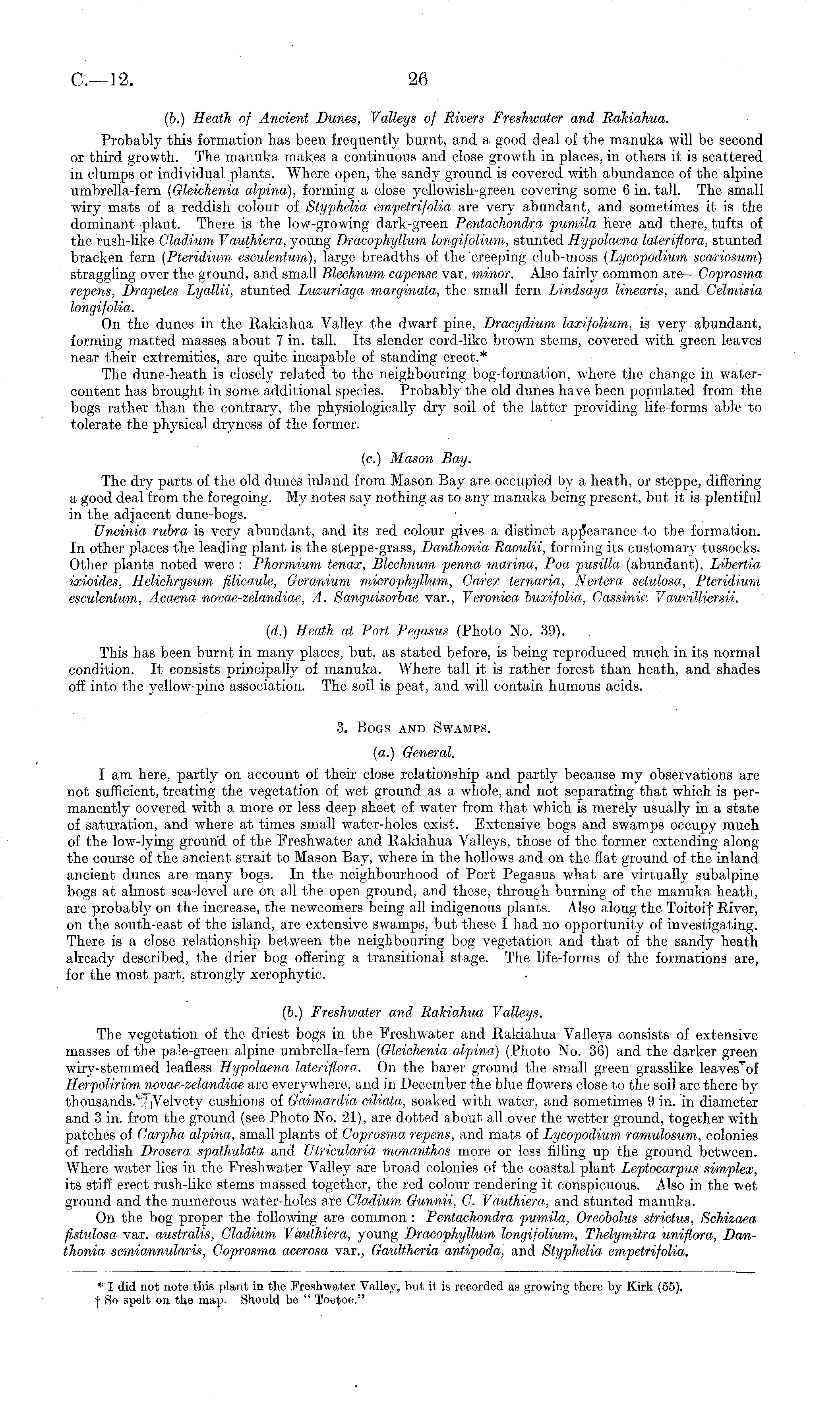 (b.) Heath of Ancient Dunes, Valleys of Rivers Freshwater and Rakiahua. Probably this formation has been frequently burnt, and a good deal of the manuka will be second or third growth. The manuka makes a continuous and close growth in places, in others it is scattered in clumps or individual plants. Where open, the sandy ground is covered with abundance of the alpine umbrella-fern (Gleichenia alpina), forming a close yellowish-green covering some 6 in. tall. The small wiry mats of a reddish colour of Styphelia empetrifolia are very abundant, and sometimes it is the dominant plant. There is the low-growing dark-green Pentachondra pumila here and there, tufts of the rush-like Cladium Vauthiera, young Dracophyllum longifolium, stunted Hypolaena lateriflora, stunted bracken fern (Pteridium esculentum), large breadths of the creeping club-moss (Lycopodium scariosum) straggling over the ground, and small Blechnum capense var. minor. Also fairly common are — Coprosma repens, Drapetes Lyallii, stunted Luzuriaga marginata, the small fern Lindsaya linearis, and Gelmisia longifolia. On the dunes in the Rakiahua Valley the dwarf pine, Dracydium laxifolium, is very abundant, forming matted masses about 7 in. tall. Its slender cord-like brown stems, covered with green leaves near their extremities, are quite incapable of standing erect.* The dune-heath is closely related to the neighbouring bog-formation, where the change in watercontent has brought in some additional species. Probably the old dunes have been populated from the bogs rather than the contrary, the physiologically dry soil of the latter providing life-forms able to tolerate the physical dryness of the former. (c.) Mason Bay. The dry parts of the old dunes inland from Mason Bay are occupied by a heath, or steppe, differing a good deal from the foregoing. My notes say nothing as to any manuka being present, but it is plentiful in the adjacent dune-bogs. Uncinia rubra is very abundant, and its red colour gives a distinct appearance to the formation. In other places the leading plant is the steppe-grass, Danthonia Raoulii, forming its customary tussocks. Other plants noted were : Phormium tenax, Blechnum penna marina, Poa pusilla (abundant), Libertia ixioides, Ilelichrysum, filicaule, Geranium microphyllum, Carex ternaria, Nertera setulosa, Pteridium esculentum, Acaena novae-zelandiae, A. Sanguisorbae var., Veronica buxifolia, Cassinic Vauvilliersii. (d.) Heath at Port Pegasus (Photo No. 39). This has been burnt in many places, but, as stated before, is being reproduced much in its normal condition. It consists principally of manuka. Where tall it is rather forest than heath, and shades off into the yellow-pine association. The soil is peat, and will contain humous acids. 3. Bogs and Swamps. (a.) General. I am here, partly on account of their close relationship and partly because my observations are not sufficient, treating the vegetation of wet ground as a whole, and not separating that which is permanently covered with a more or less deep sheet of water from that which is merely usually in a state of saturation, and where at times small water-holes exist. Extensive bogs and swamps occupy much of the low-lying ground of the Freshwater and Rakiahua Valleys, those of the former extending along the course of the ancient strait to Mason Bay, where in the hollows and on the flat ground of the inland ancient dunes are many bogs. In the neighbourhood of Port Pegasus what are virtually subalpine bogs at almost sea-level are on all the open ground, and these, through burning of the manuka heath, are probably on the increase, the newcomers being all indigenous plants. Also along the Toitoif River, on the south-east of the island, are extensive swamps, but these I had no opportunity of investigating. There is a close relationship between the neighbouring bog vegetation and that of the sandy heath already described, the drier bog offering a transitional stage. The life-forms of the formations are, for the most part, strongly xerophytic. (b.) Freshwater and Rakiahua Valleys. The vegetation of the driest bogs in the Freshwater and Rakiahua Valleys consists of extensive masses of the pale-green alpine umbrella-fern (Gleichenia alpina) (Photo No. 36) and the darker green wiry-stemmed leafless Hypolaena lateriflora. On the barer ground the small green grasslike leaves*of Herpolirion novae-zelandiae are everywhere, and in December the blue flowers close to the. soil are there by thousands."" Velvety cushions of Gaimardia ciliata, soaked with water, and sometimes 9 in. in diameter and 3 in. from the ground (see Photo No. 21), are dotted about all over the wetter ground, together with patches of Garpha alpina, small plants of Coprosma repens, and mats of Lycopodium ramulosum, colonies of reddish Drosera spathulata and Utricularia monanthos more or less filling up the ground between. Where water lies in the Freshwater Valley are broad colonies of the coastal plant Leptocarpus simplex, its stiff erect rush-like stems massed together, the red colour rendering it conspicuous. Also in the wet ground and the numerous water-holes are Cladium Gunnii, C. Vauthiera, and stunted manuka. On the bog proper the following are common : Pentachondra pumila, Oreobolus strictus, Schizaea fistulosa var. australis, Cladium Vauthiera, young Dracophyllum longifolium,, Thelymitra uniflora, Danthonia semiannularis, Coprosma acerosa var., Gaultheria antipoda, and Styphelia empetrifolia.