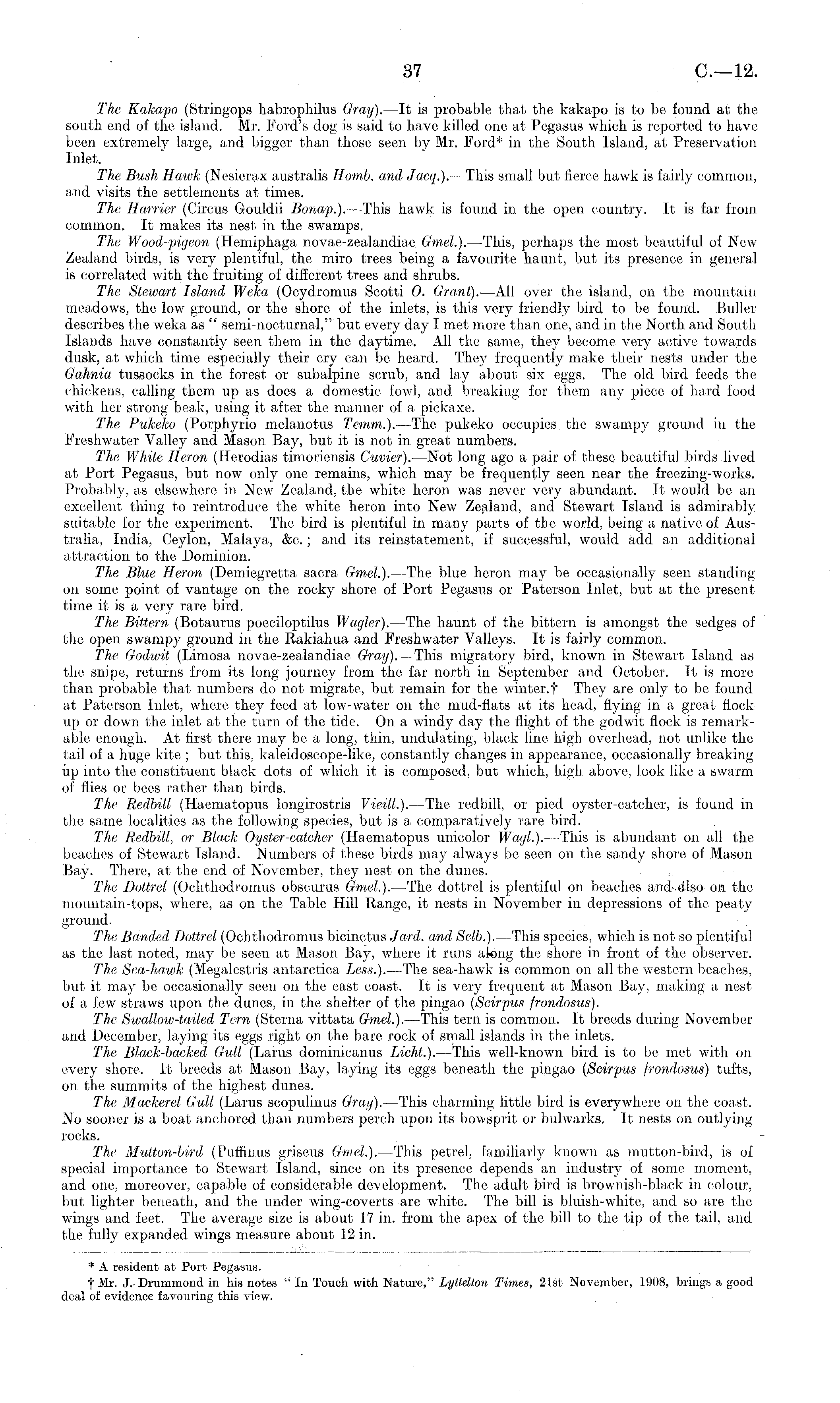 * A resident at Port Pegasus. t Mr. J.. Drummond in his notes " In Touch with Nature," Lyttelton Times, 21st November, 1908, brings a good deal of evidence favouring this view.
