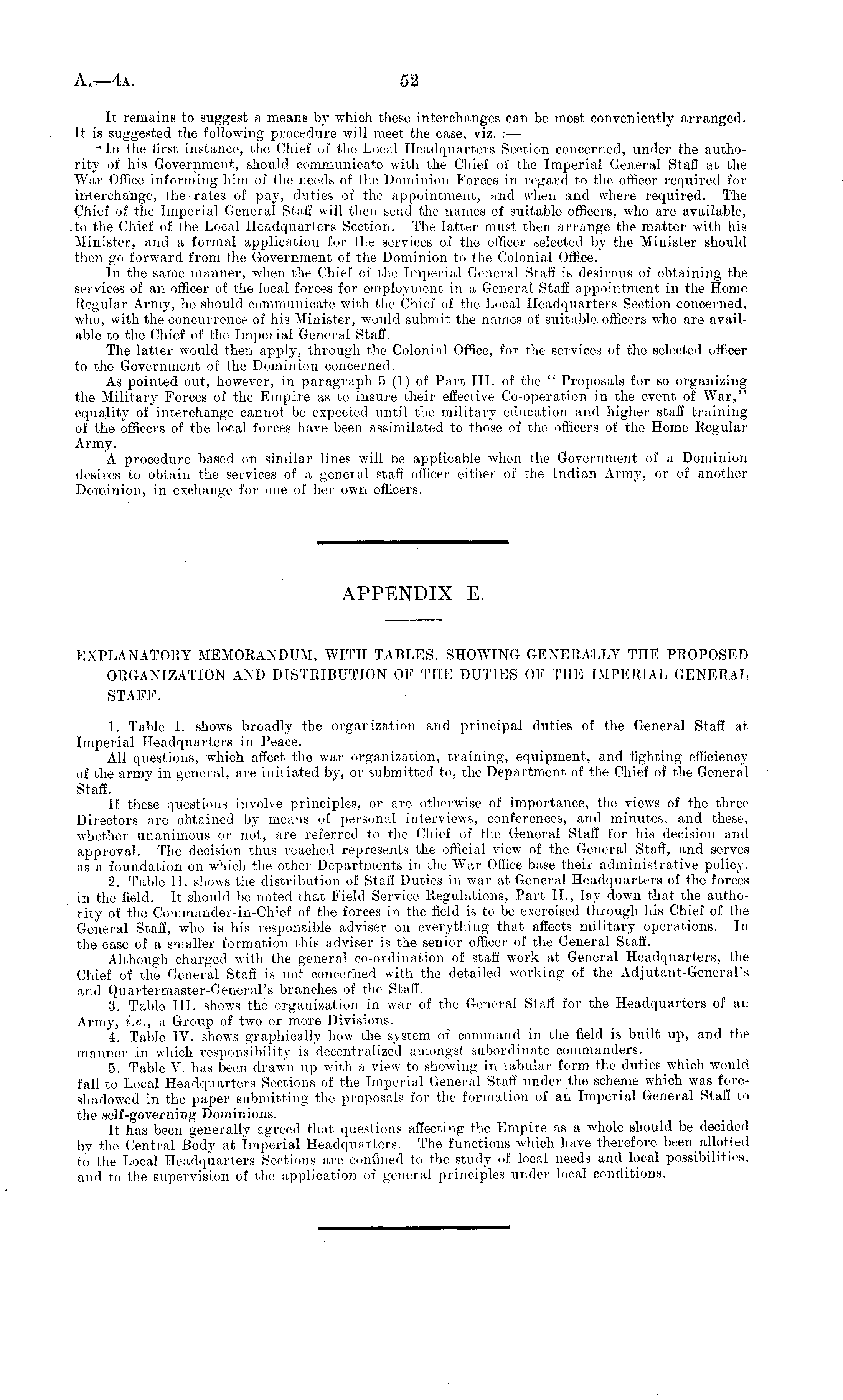 It remains to suggest a means by which these interchanges can be most conveniently arranged. It is suggested the following procedure will meet the case, viz. :— "In the first instance, the Chief of the Local Headquarters Section concerned, under the authority of his Government, should communicate with the Chief of the Imperial General Staff at the War Office informing him of the needs of the Dominion Forces in regard to the officer required for interchange, the rates of pay, duties of the appointment, and when and where required. The Chief of the Imperial General Staff will then send the names of suitable officers, who are available, to the Chief of the Local Headquarters Section. The latter must then arrange the matter with his Minister, and a formal application for the services of the officer selected by the Minister should then go forward from the Government of the Dominion to the Colonial Office. In the same manner, when the Chief of the Imperial General Staff is desirous of obtaining the services of an officer of the local forces for employment in a General Staff appointment in the Home Regular Army, he should communicate with the Chief of the Local Headquarters Section concerned, who, with the concurrence of his Minister, would submit the names of suitable officers who are available to the Chief of the Imperial General Staff. The latter would then apply, through the Colonial Office, for the services of the selected officer to the Government of the Dominion concerned. As pointed out, however, in paragraph 5 (1) of Part 111. of the " Proposals for so organizing the Military Forces of the Empire as to insure their effective Co-operation in the event of War," equality of interchange cannot be expected until the military education and higher staff training of the officers of the local forces have been assimilated to those of the officers of the Home Regular Army. A procedure based on similar lines will be applicable when the Government of a Dominion desires to obtain the services of a general staff officer either of the Indian Army, or of another Dominion, in exchange for one of her own officers.