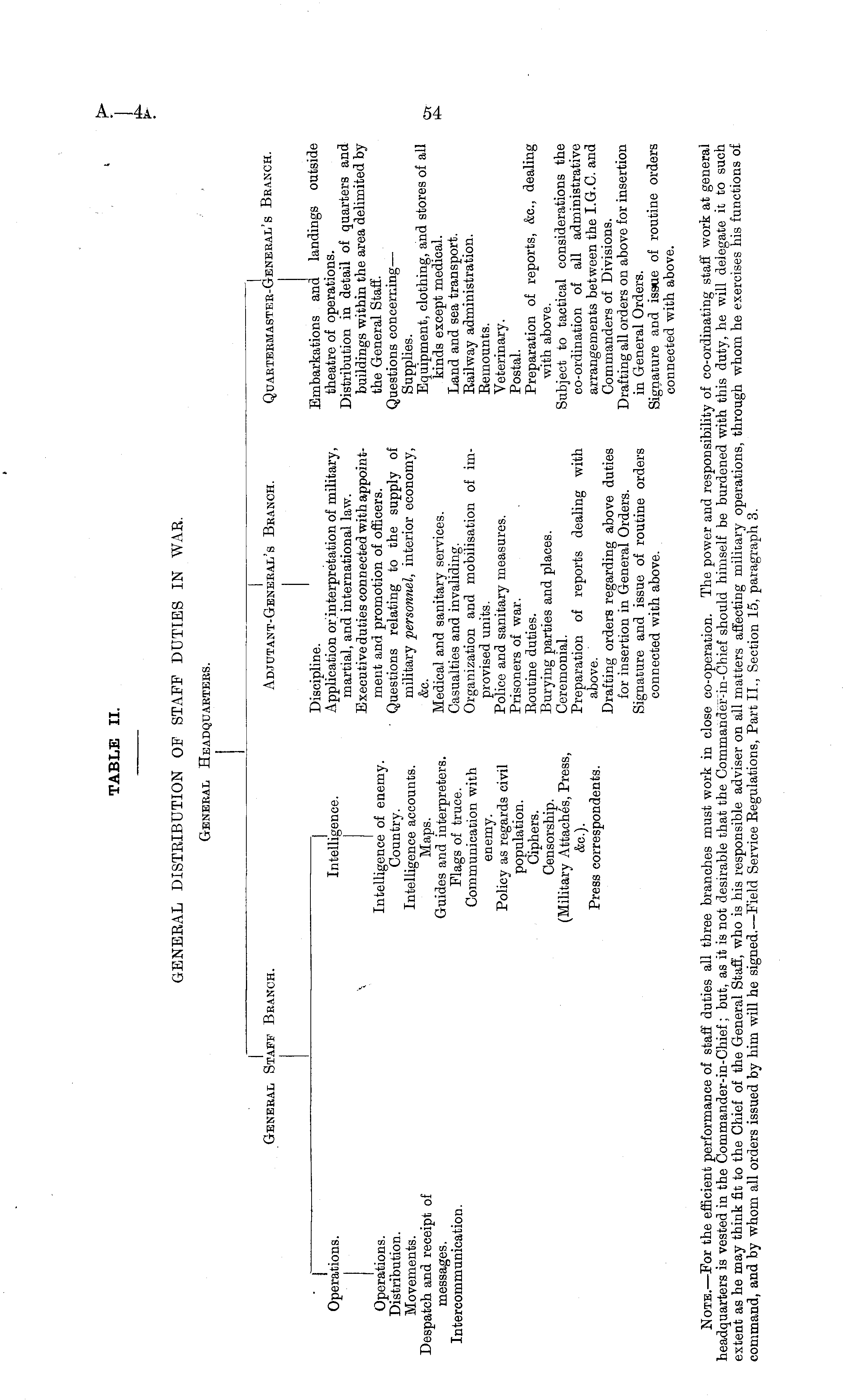 GENERAL DISTRIBUTION OF STAFF DUTIES IN WAR. Genebal Headquaetees. Geneeal Staff Branch. Adjutant-Genebal's Beanch. Quakteemastee-Genebal's Beanch. • j' J Discipline. Embarkations and landings outside Operations. Intelligence. Application or interpretation of military, theatre of operations. martial, and international law. Distribution in detail of quarters and \ Executive duties connected with appoint- buildings within the area delimited by Operations. Intelligence of enemy. ment and promotion of officers. the General Staff. Distribution. Country. ' Questions relating to the supply of Questions concerning—■ Movements. Intelligence accounts. military personnel, interior economy, Supplies. Despatch and receipt of Maps. &c. Equipment, clothing, and stores of all messages. Guides and interpreters. Medical and sanitary services. kinds except medical. Intercommunication. Flags of truce. Casualties and invaliding. Land and sea transport. Communication with Organization and mobilisation of im- Railway administration. enemy. provised units. Remounts. Policy as regards civil Police and sanitary measures. , Veterinary, population. Prisoners of war. . Postal. Ciphers. Routine duties. Preparation of reports, &c, dealing Censorship. Burying parties and places. with above. (Military Attaches, Press, Ceremonial. Subject to tactical considerations the &c). Preparation of reports dealing with co-ordination of all administrative Press correspondents. above. arrangements between the I.G.C. and Drafting orders regarding above duties Commanders of Divisions. for insertion in General Orders. Drafting all orders on above for insertion Signature and issue of routine orders in General Orders. connected with above. Signature and issue of routine orders connected with above. Note.—For the efficient performance of staff duties all three branches must work in close co-operation. The power and responsibility of co-ordinating staff work at general headquarters is vested in the Commander-in-Chief; but, as it is not desirable that the Commahdef : in-Chief should himself be burdened with this duty, he will delegate it to such extent as he may think fit to the Chief of the General Staff, who is his responsible adviser on all matters affecting military operations, through whom he exercises his functions o£ command, and by whom all orders issued by him will he signed.— Field Service Regulations, Part 11., Section 15, paragraph 3.