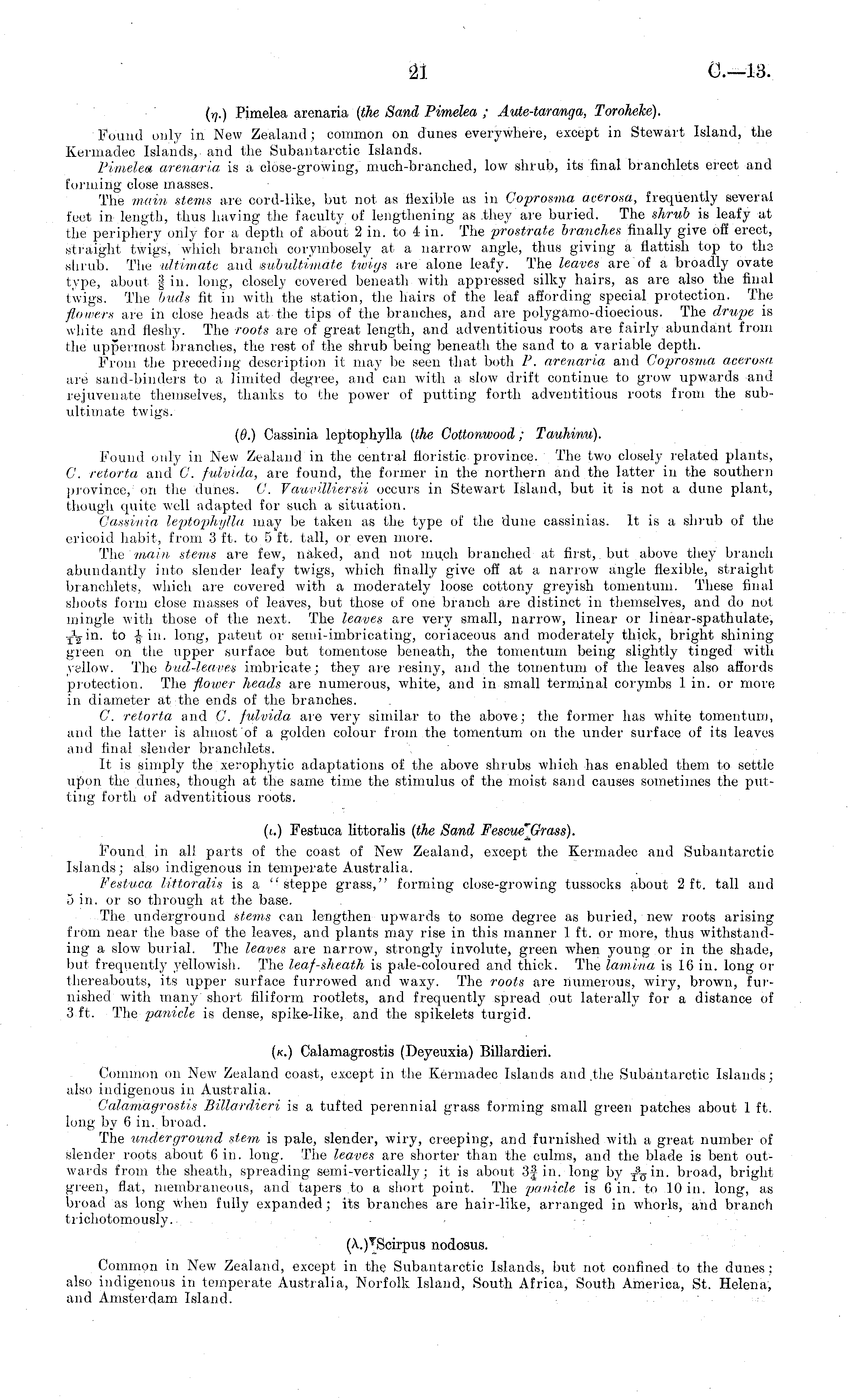 (■>].) Pimelea arenaria (the Sand Pimelea ; Aute-taranga, Toroheke). Found only in New Zealand; common on dunes everywhere, except in Stewart Island, the Kermadec Islands, and the Subantaretic Islands. Pimelea, arenaria is a close-growing, much-branched, low shrub, its final branchlets erect and forming close masses. The main stems are cord-like, but not as flexible as in Coprosma acerosa, frequently several feet in length, thus having the faculty of lengthening as they are buried. The shrub is leafy at the periphery only for a depth of about 2 in. to 4 in. The prostrate branches finally give off erect, straight twigs, which branch corymbosely at a narrow angle, thus giving a flatfish top to ths shrub. The ultimate and subultimate twigs are alone leafy. The leaves are of a broadly ovate type, about % in. long, closely covered beneath with appressed silky hairs, as are also_ the final twigs. The buds fit in with the station, the hairs of the leaf affording special protection. The flowers arc in close heads at the tips of the branches, and are polygamo-dioecious. The drupe is white and fleshy. The roots are of great length, and adventitious roots are fairly abundant from the uppermost branches, the rest of the shrub being beneath the sand to a variable depth. From the preceding description it may be seen that both P. arenaria and Coprosma acerosa. are' sand-binders to a limited degree, and can with a slow drift continue to grow upwards and rejuvenate themselves, thanks to the power of putting forth adventitious roots from the subultimate twigs. (6.) Cassinia leptophylla (the Cottonwood ; Tauhinu). Found only in New Zealand in the central floristic province. The two closely related plants, C. retorta and C. fulvida, are found, the former in the northern and the latter in the southern province, on the dunes. C. Vauvilliersii occurs in Stewart Island, but it is not a dune plant, though quite well adapted for such a situation. Cassinia leptophylla may be taken as the type of the dune cassinias. It is a shrub of the cricoid habit, from 3 ft. to 5 ft. tall, or even more. The main stems are few, naked, and not much branched at first, but above they branch abundantly into slender leafy twig's, which finally give off at a narrow angle flexible, straight branchlets, which are covered with a moderately loose cottony greyish tonientuni. These final shoots form close masses of leaves, but those of one branch are distinct in themselves, and do not mingle with those of the next. The leaves are very small, narrow, linear or linear-spathulate, ■ r h/in. to -| in. long, patent or semi-imbricating, coriaceous and moderately thick, bright shining green on the upper surface but tomentose beneath, the tonientum being slightly tinged with yellow. The bud-leaves imbricate; they are resiny, and the tomentum of the leaves also affords protection. The flower heads are numerous, white, and in small terminal corymbs 1 in. or more in diameter at the ends of the branches. C. retorta and C. fulvida are very similar to the above; the former has white tomentum, and the latter is almost of a golden colour from the tomentum on the under surface of its leaves and final slender branchlets. It is simply the xerophytic adaptations of the above shrubs which has enabled them to settle upon the dunes, though at the same time the stimulus of the moist sand causes sometimes the putting forth of adventitious roots. (i.) Festuca littoralis (the Sand Fescue'Jjtrass). Found in all parts of the coast of New Zealand, except the Kermadec and Subantaretic Islands; also indigenous in temperate Australia. Festuca littoralis is a "steppe grass," forming close-growing tussocks about 2ft. tall and 5 in. or so through at the base. The underground stems can lengthen upwards to some degree as buried, new roots arising from near the base of the leaves, and plants may rise in this manner 1 ft. or more, thus withstanding a slow burial. The leaves are narrow, strongly involute, green when young or in the shade, but frequently yellowish. The leaf-sheath is pale-coloured and thick. The lamina is 16 in. long or thereabouts, its upper surface furrowed and waxy. The roots are numerous, wiry, brown, furnished with many short filiform rootlets, and frequently spread out laterally for a distance of 3 ft. The panicle is dense, spike-like, and the spikelets turgid. (k.) Calamagrostis (Deyeuxia) Billardieri. Common on New Zealand coast, except in the Kermadec Islands and the Subantaretic Islands; also indigenous in Australia. Calamagrostis Billardieri is a tufted perennial grass forming small green patches about 1 ft. long by 6 in. broad. The tmderground stem is pale, slender, wiry, creeping, and furnished with a great number of slender roots about 6 in. long. The leaves are shorter than the culms, and the blade is bent outwards from the sheath, spreading semi-vertically; it is about 3|- in. long by broad, bright green, flat, membraneous, and tapers to a short point. The panicle is 6 in. to 10 in. long, as broad as long when fully expanded; its branches are hair-like, arranged in whorls, and branch trichotomously. nodosus. Common in New Zealand, except in the Subantaretic Islands, but not confined to the dunes; also indigenous in temperate Australia, Norfolk Island, South Africa, South America, St. Helena, and Amsterdam Island.