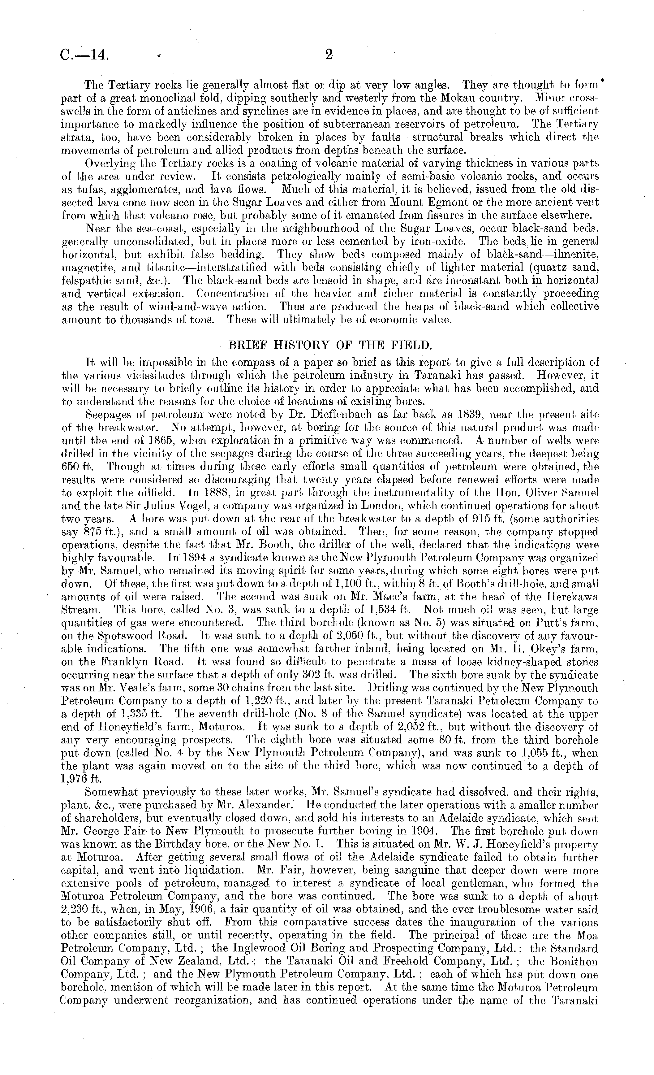 The Tertiary rooks lie generally almost flat or dip at very low angles. They are thought to form part of a great monoclinal fold, dipping southerly and westerly from the Mokau country. Minor crossswells in the form of anticlines and synclines are in evidence in places, and are thought to be of sufficient importance to markedly influence the position of subterranean reservoirs of petroleum. The Tertiary strata, too, have been considerably broken in places by faults — structural breaks which direct the, movements of petroleum and allied products from depths beneath the surface. Overlying the Tertiary rocks is a coating of volcanic material of varying thickness in various parts of the area under review. It consists petrologically mainly of semi-basic volcanic rocks, and occurs as tufas, agglomerates, and lava flows. Much of this material, it is believed, issued from the old dis sected lava cone now seen in the Sugar Loaves and either from Mount Egmont or the more ancient vent from which that volcano rose, but probably some of it emanated from fissures in the surface elsewhere. Near the sea-coast, especially in the neighbourhood of the Sugar Loaves, occur black-sand beds, generally unconsolidated, but in places more or less cemented by iron-oxide. The beds lie in general horizontal, but exhibit false bedding. They show beds composed mainly of black-sand—ilmenite, magnetite, and titanite—interstratified with beds consisting chiefly of lighter material (quartz sand, felspathic sand, &c). The black-sand beds are lensoid in shape, and are inconstant both in horizontal and vertical extension. Concentration of the heavier and richer material is constantly proceeding as the result of wind-and-wave action. Thus are produced the heaps of black-sand which collective amount to thousands of tons. These will ultimately be of economic value. BRIEF HISTORY OF THE FIELD. It will be impossible in the compass of a paper so brief as this report to give a full description of the various vicissitudes through which the petroleum industry in Taranaki has passed. However, it will be necessary to briefly outline its history in order to appreciate what has been accomplished, and to understand the reasons for the choice of locations of existing bores. Seepages of petroleum were noted by Dr. Dieffenbach as far back as 1839, near the present site of the breakwater. No attempt, however, at boring for the source of this natural product was made until the end of 1865, when exploration in a primitive way was commenced. A number of wells were drilled in the vicinity of the seepages during the course of the three succeeding years, the deepest being 650 ft. Though at times during these early efforts small quantities of petroleum were obtained, the results were considered so discouraging that twenty years elapsed before renewed efforts were made to exploit the oilfield. In 1888, in great part through the instrumentality of the Hon. Oliver Samuel and the late Sir Julius Vogel, a company was organized in London, which continued operations for about two years. A bore was put down at the rear of the breakwater to a depth of 915 ft. (some authorities say 875 ft.), and a small amount of oil was obtained. Then, for some reason, the company stopped operations, despite the fact that Mr. Booth, the driller of the well, declared that the indications were highly favourable. In 1894 a syndicate known as the New Ptymouth Petroleum Company was organized by Mr. Samuel, who remained its moving spirit for some years,during which some eight bores were put down. Of these, the first was put down to a depth of 1,100 ft., within 8 ft. of Booth's drill-hole, and small amounts of oil were raised. The second was sunk on Mr. Mace's farm, at the head of the Herekawa Stream. This bore, called No. 3, was sunk to a depth of 1,534 ft. Not much oi! was seen, but large quantities of gas were encountered. The third borehole (known as No. 5) was situated on Putt's farm, on the Spotswood Road. It was sunk to a depth of 2,050 ft., but without the discovery of any favourable indications. The fifth one was somewhat farther inland, being located on Mr. H. Okey's farm, on the Franklyn Road. It was found so difficult to penetrate a mass of loose kidney-shaped stones occurring near the surface that a depth of only 302 ft. was drilled. The sixth bore sunk by the syndicate was on Mr. Veale's farm, some 30 chains from the last site. Drilling was continued by the New Plymouth Petroleum Company to a depth of 1,220 ft., and later by the present Taranaki Petroleum Company to a depth of 1,335 ft. The seventh drill-hole (No. Bof the Samuel syndicate) was located at the upper end of Honeyfield's farm, Moturoa. It was sunk to a depth of 2,052 ft., but without the discovery of any very encouraging prospects. The eighth bore was situated some 80 ft. from the third borehole put down (called No. 4 by the New Plymouth Petroleum Company), and was sunk to 1,055 ft., when the plant was again moved on to the site of the third bore, which was now continued to a depth of 1,976 ft. Somewhat previously to these later works, Mr. Samuel's syndicate had dissolved, and their rights, plant, &c, were purchased by Mr. Alexander. He conducted the later operations with a smaller number of shareholders, but eventually closed down, and sold his interests to an Adelaide syndicate, which sent Mr. George Fair to New Plymouth to prosecute further boring in 1904. The first borehole put down was known as the Birthday bore, or the New No. 1. This is situated on Mr. W. J. Honeyfield's property at Moturoa. After getting several small flows of oil the Adelaide syndicate failed to obtain further capital, and went into liquidation. Mr. Fair, however, being sanguine that deeper down were more extensive pools of petroleum, managed to interest a syndicate of local gentleman, who formed the Moturoa Petroleum Company, and the bore was continued. The bore was sunk to a depth of about 2,230 ft., when, in May, 1906, a 