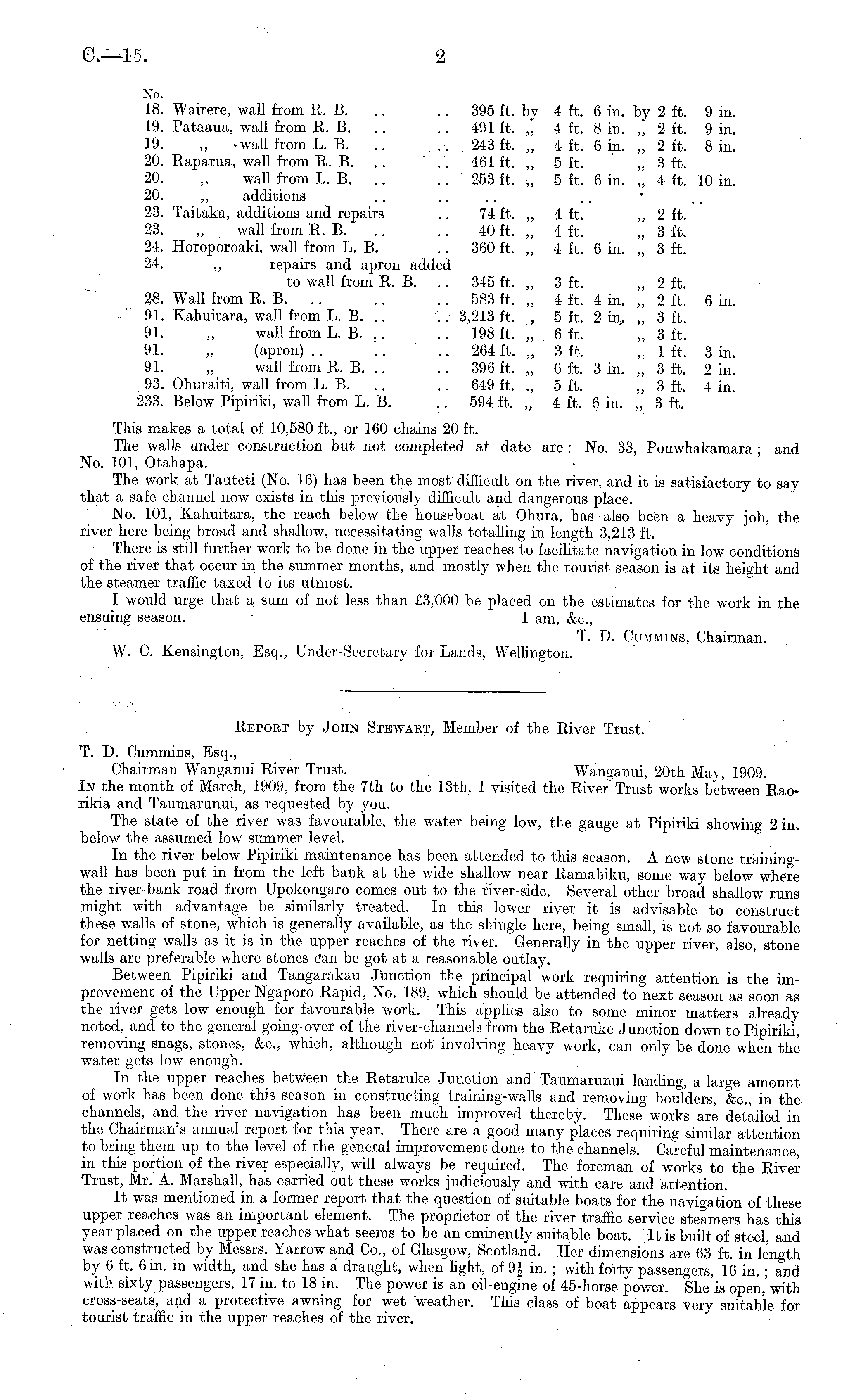 Report by John Stewart, Member of the River Trust. T. D. Cummins, Esq., Chairman Wanganui River Trust. Wanganui, 20th May, 1909. In the month of March, 1909, from the 7th to the 13th. I visited the River Trust works between Raorikia and Taumarunui, as requested by you. The state of the river was favourable, the water being low, the gauge at Pipiriki showing 2 in. below the assumed low summer level. In the river below Pipiriki maintenance has been attended to this season. A new stone trainingwall has been put in from the left bank at the wide shallow near Ramahiku, some way below where the river-bank road from Upokongaro comes out to the river-side. Several other broad shallow runs might with advantage be similarly treated. In this lower river it is advisable to construct these walls of stone, which is generally available, as the shingle here, being small, is not so favourable for netting walls as it is in the upper reaches of the river. Generally in the upper river, also, stone walls are preferable where stones Can be got at a reasonable outlay. Between Pipiriki and Tangarakau Junction the principal work requiring attention is the improvement of the Upper Ngaporo Rapid, No. 189, which should be attended to next season as soon as the river gets low enough for favourable work. This applies also to some minor matters already noted, and to the general going-over of the river-channels from the Retaruke Junction down to Pipiriki, removing snags, stones, &c, which, although not involving heavy work, can only be done when the water gets low enough. In the upper reaches between the Retaruke Junction and Taumarunui landing, a large amount of work has been done this season in constructing training-walls and removing boulders, &c., in the channels, and the river navigation has been much improved thereby. These works are detailed in the Chairman's annual report for this year. There are a good many places requiring similar attention to bring them up to the level of the general improvement done to the channels. Careful maintenance, in this portion of the river especially, will always be required. The foreman of works to the River Trust, Mr. A. Marshall, has carried out these works judiciously and with care and attention. It was mentioned in a former report that the question of suitable boats for the navigation of these upper reaches was an important element. The proprietor of the river traffic service steamers has this year placed on the upper reaches what seems to be an eminently suitable boat. It is built of steel, and was constructed by Messrs. Yarrow and Co., of Glasgow, Scotland. Her dimensions are 63 ft. in length by 6 ft. 6 in. in width, and she has a draught, when fight, of 9J in. ; with forty passengers, 16 in. ; and with sixty passengers, 17 in. to 18 in. The power is an oil-engine of 45-horse power. She'is open,'with cross-seats, and a protective awning for wet weather. This class of boat appears very suitable for tourist traffic in the upper reaches of the river.