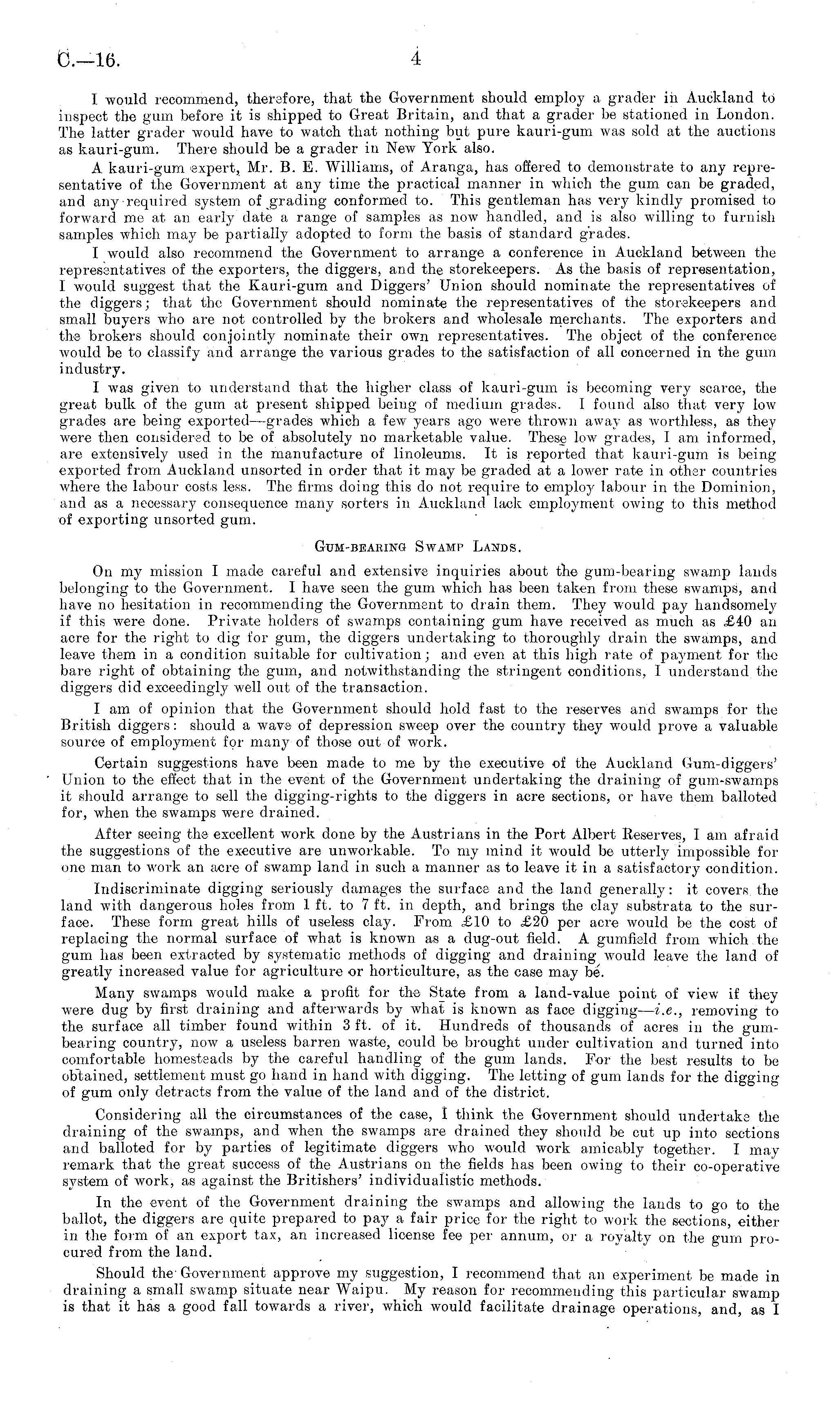1 would recommend, therefore, that the Government should employ a grader in Auckland to inspect the gum before it is shipped to Great Britain, and that a grader be stationed in London. The latter grader would have to watch that nothing but pure kauri-gum was sold at the auctions as kauri-gum. There should be a grader in New York also. A kauri-gum expert, Mr. B. E. Williams, of Aranga, has offered to demonstrate to any representative of the Government at any time the practical manner in which the gum can be graded, and any-required system of grading conformed to. This gentleman has very kindly promised to forward me at an early date a range of samples as now handled, and is also willing to furnish samples which may be partially adopted to form the basis of standard grades. I would also recommend the Government to arrange a conference in Auckland between the representatives of the exporters, the diggers, and the storekeepers. As the basis of representation, I would suggest that the Kauri-gum and Diggers' Union should nominate the representatives of the diggers; that the Government should nominate the representatives of the storekeepers and small buyers who are not controlled by the brokers and wholesale merchants. The exporters and the brokers should conjointly nominate their own representatives. The object of the conference would be to classify and arrange the various grades to the satisfaction of all concerned in the gum industry. I was given to understand that the higher class of kauri-gum is becoming very scarce, the great bulk of the gum at present shipped being of medium grades. I found also that very low grades are being exported —grades which a few years ago were thrown away as worthless, as they were then considered to be of absolutely no marketable value. These low grades, I am informed, are extensively used in the manufacture of linoleums. It is reported that kauri-gum is being exported from Auckland unsorted in order that it may be graded at a lower rate in other countries where the labour costs less. The firms doing this do not require to employ labour in the Dominion, and as a necessary consequence many sorters in Auckland lack employment owing to this method of exporting unsorted gum. Gum-bearing Swamp Lands. On my mission I made careful and extensive inquiries about the gum-bearing swamp lands belonging to the Government. I have seen the gum which has been taken from these swamps, and have no hesitation in recommending the Government to drain them. They would pay handsomely if this were done. Private holders of swamps containing gum have received as much as £40 an acre for the right to dig for gum, the diggers undertaking to thoroughly drain the swamps, and leave them in a condition suitable for cultivation ; and even at this high rate of payment for the bare right of obtaining the gum, and notwithstanding the stringent conditions, I understand the diggers did exceedingly well out of the transaction. I am of opinion that the Government should hold fast to the reserves and swamps for the British diggers: should a wave of depression sweep over the country they would prove a valuable source of employment for many of those out of work. Certain suggestions have been made to me by the executive of the Auckland Gum-diggers' Union to the effect that in the event of the Government undertaking the draining of gum-swamps it should arrange to sell the digging-rights to the diggers in acre sections, or have them balloted for, when the swamps were drained. After seeing the excellent work done by the Austrians in the Port Albert Reserves, 1 am afraid the suggestions of the executive are unworkable. To my mind it would be utterly impossible for one man to work an acre of swamp land in such a manner as to leave it in a satisfactory condition. Indiscriminate digging seriously damages the surface and the land generally: it covers the land with dangerous holes from 1 ft. to 7 ft. in depth, and brings the clay substrata to the surface. These form great hills of useless clay. From £10 to £20 per acre would be the cost of replacing the normal surface of what is known as a dug-out field. A gumfield from which the gum has been extracted by systematic methods of digging and draining would leave the land of greatly increased value for agriculture or horticulture, as the case may be. Many swamps would make a profit for the State from a land-value point of view if they were dug by first draining and afterwards by what is known as face digging— i.e., removing to the surface all timber found within 3 ft. of it. Hundreds of thousands of acres in the gumbearing country, now a useless barren waste, could be brought under cultivation and turned into comfortable homesteads by the careful handling of the gum lands. For the best results to be obtained, settlement must go hand in hand with digging. The letting of gum lands for the digging of gum only detracts from the value of the land and of the district. Considering all the circumstances of the case, I think the Government should undertake the draining of the swamps, and when the swamps are drained they should be cut up into sections and balloted for by parties of legitimate diggers who would work amicably together. I may remark that the great success of the Austrians on the fields has been owing to their co-operative system of work, as against the Britishers' individualistic methods. In the event of the Government draining the swamps and allowing the lands to go to the ballot, the diggers are quite prepared to pay a fair price for the right to work the sections, either in the form of an export tax, an increased license fee per annum, or a royalty on the gum procured from the land. Should the- Government approve my suggestion, I recommend that an experiment be made in draining a small swamp situate near Waipu. My reason for recommending this particular swamp is that it has a good fall towards a river, which would facilitate drainage operations, and, as 