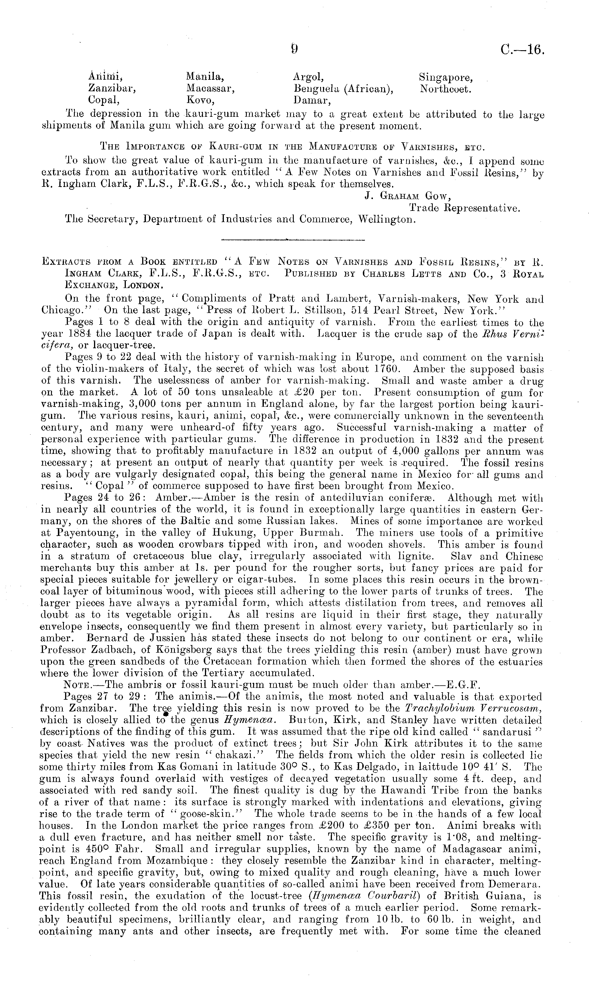 Ariiini, Manila, Argol, Singapore, Zanzibar, Macassar, Benguela (African), Northcoet. Copal, Kovo, Damar, The depression in the kauri-gum market may to a great extent be attributed to the large shipments of Manila gum which are going forward at the present moment. The Importance of Kauri-gum in the Manufacture of Varnishes, etc. To show the great value of kauri-gum in the manufacture of varnishes, &c, I append some extracts from an authoritative work entitled "A Few Notes on Varnishes and Fossil Resins," by R. Ingham Clark, F.L.S., F.R.G.S., &c, which speak for themselves. J. Graham Gow, Trade Representative. The Secretary, Department of Industries and Commerce, Wellington.