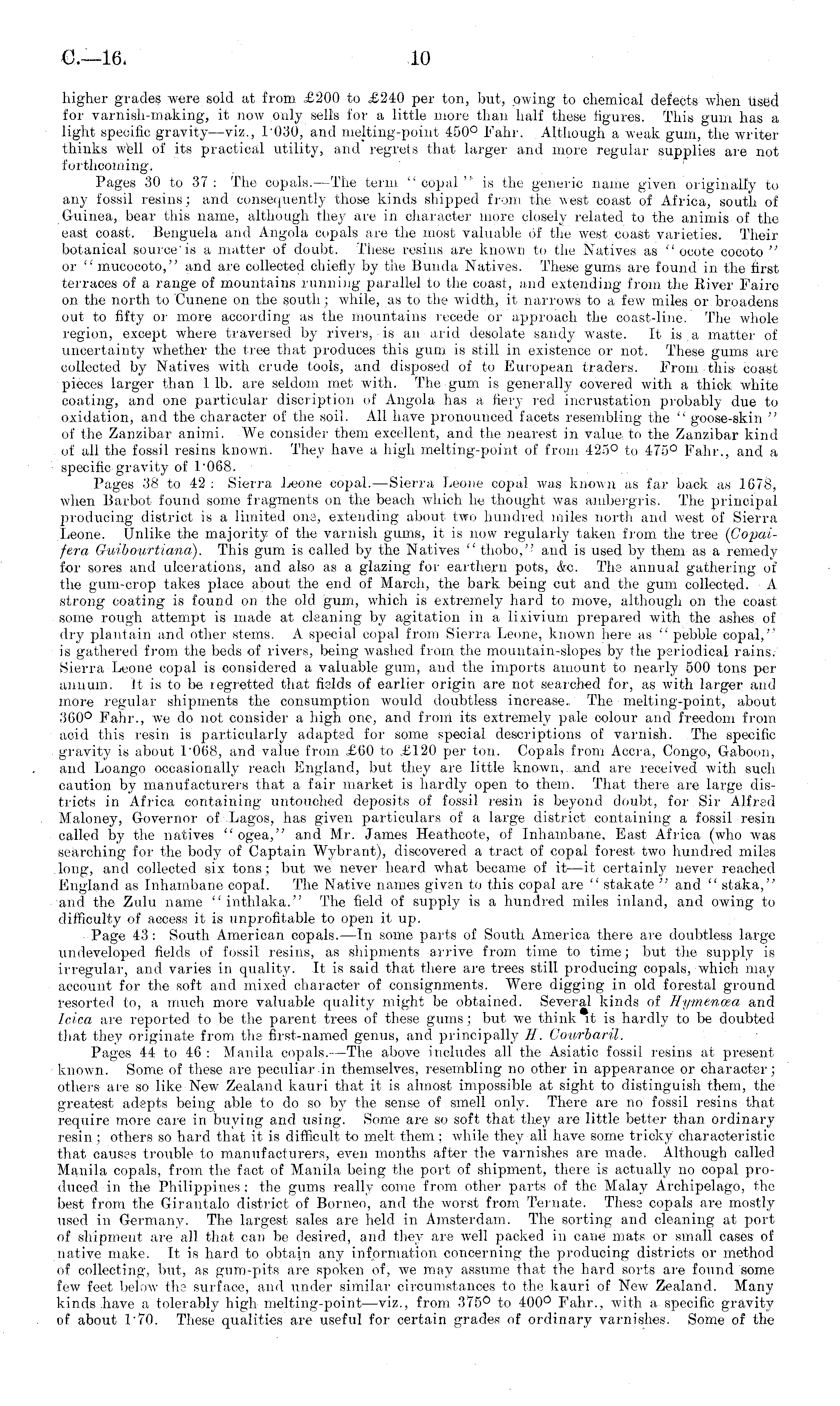 higher grades were sold at from £200 to £240 per ton, but, owing to chemical defects when Used for varnish-making, it now only sells for a little more than half these figures. This gum has a light specific gravity —viz., LO3O, and melting-point 450° Fahr. Although a weak gum, the writer thinks well of its practical utility, and regrets that larger and more regular supplies are not forthcoming. Pages 30 to 37: The copals.—The term "copal" is the generic name given originally to an)' fossil resins; and consequently those kinds shipped from the west coast of Africa, south of Guinea, bear this name, although they are in character more closely related to the animis of the east coast. Benguela and Angola copals are the most valuable of the west coast varieties. Their botanical source'is a matter of doubt. These resins are known to the Natives as " ocote cocoto " or " mucocoto," and are collected chiefly by the Bunda Natives. These gums are found in the first terraces of a range of mountains running parallel to the coast, and extending from the River Faire on the north to Cunene on the south; while, as to the width, it narrows to a few miles or broadens out to fifty or more according as the mountains recede or approach the coast-line. The whole region, except where traversed by rivers, is an arid desolate sandy waste. It is a matter of uncertainty whether the tree that produces this gum is still in existence or not. These gums arc collected by Natives with crude tools, and disposed of to European traders. From this coast pieces larger than 1 lb. are seldom met with. The gum is generally covered with a thick white coating, and one particular discription of Angola has a fiery red incrustation probably due to oxidation, and the character of the soil. All have pronounced facets resembling the " goose-skin " of the Zanzibar animi. We consider them excellent, and the nearest in value to the Zanzibar kind of all the fossil resins known. They have a high melting-point of from 425° to 175° Fahr., and a specific gravity of I'o6B. Pages 38 to 42 : Sierra Leone copal.—Sierra Leone copal was known as far back as 1678, when Barbot found some fragments on the beach which he thought was ambergris. The principal producing district is a limited one, extending about two hundred miles north and west of Sierra Leone. Unlike the majority of the varnish gums, it is now regularly taken from the tree (Copaifera Guibourtiana). This gum is called by the Natives " thobo," and is used by them as a remedy for sores and ulcerations, and also as a glazing for earthern pots, Arc. The annual gathering of the gum-crop takes place about the end of March, the bark being cut and the gum collected. A strong coating is found on the old gum, which is extremely hard to move, although on the coast some rough attempt is made at cleaning by agitation in a lixivium prepared with the ashes of dry plantain and other stems. A special copal from Sierra Leone, known here as " pebble copal," is gathered from the beds of rivers, being washed from the mountain-slopes by the periodical rains. Sierra, Leone copal is considered a valuable gum, and the imports amount to nearly 500 tons per annum. It is to be regretted that fields of earlier origin are not searched for, as with larger and more regular shipments the consumption would doubtless increase. The melting-point, about 360° Fahr., we do not consider a high one, and from its extremely pale colour and freedom from acid this resin is particularly adapted for some special descriptions of varnish. The specific gravity is about 1-068; and value from £60 to £120 per ton. Copals from Accra, Congo, Gaboon, and Loango occasionally reach England, but they are little known, and are received with sucli caution by manufacturers that a fair market is hardly open to them. That there are large districts in Africa containing untouched deposits of fossil resin is beyond doubt, for Sir Alfred Malonoy, Governor of Lagos, lias given particulars of a large district containing a fossil resin called by the natives " ogea," and Mr. James Heathcote, of Inhambane, East Africa (who was searching for the body of Captain Wybrant), discovered a tract of copal forest two hundred miles long, and collected six tons; but we never heard what became of it —it certainly never reached England as Inhambane copal. The Native names given to this copal are " stakate " and " staka," and the Zulu name " inthlaka." The field of supply is a hundred miles inland, and owing to difficulty of access it is unprofitable to open it up. Page 43 : South American copals.—ln some parts of South America there are doubtless large undeveloped fields of fossil resins, as shipments arrive from time to time; but the supply is irregular, and varies in quality. It is said that there are trees still producing copals, which may account for the soft and mixed character of consignments. Were digging in old forestal ground resorted to, a much more valuable quality might be obtained. Several kinds of Hymencea and leica are reported to be the parent trees of these gums; but we think it is hardly to be doubted that they originate from the first-named genus, and principally //. Courbaril. Pages 44 to 46 : Manila copals.—The above includes all the Asiatic fossil resins at present known. Some of these are peculiar in themselves, resembling no other in appearance or character; Others are so like New Zealand kauri that it is almost impossible at sight to distinguish them, the greatest adepts being able to do so by the sense of smell only. There are no fossil resins that require more care in buying and using. Some are so soft that th.ey are little better than ordinary resin ; others so hard that it is difficult to melt them ; while they all have some trick)' characteristic that causes trouble to manufacturers, even months after the varnishes are made. Although called Manila, copals, from the fact of Manila being the port of shipment, there is actually no