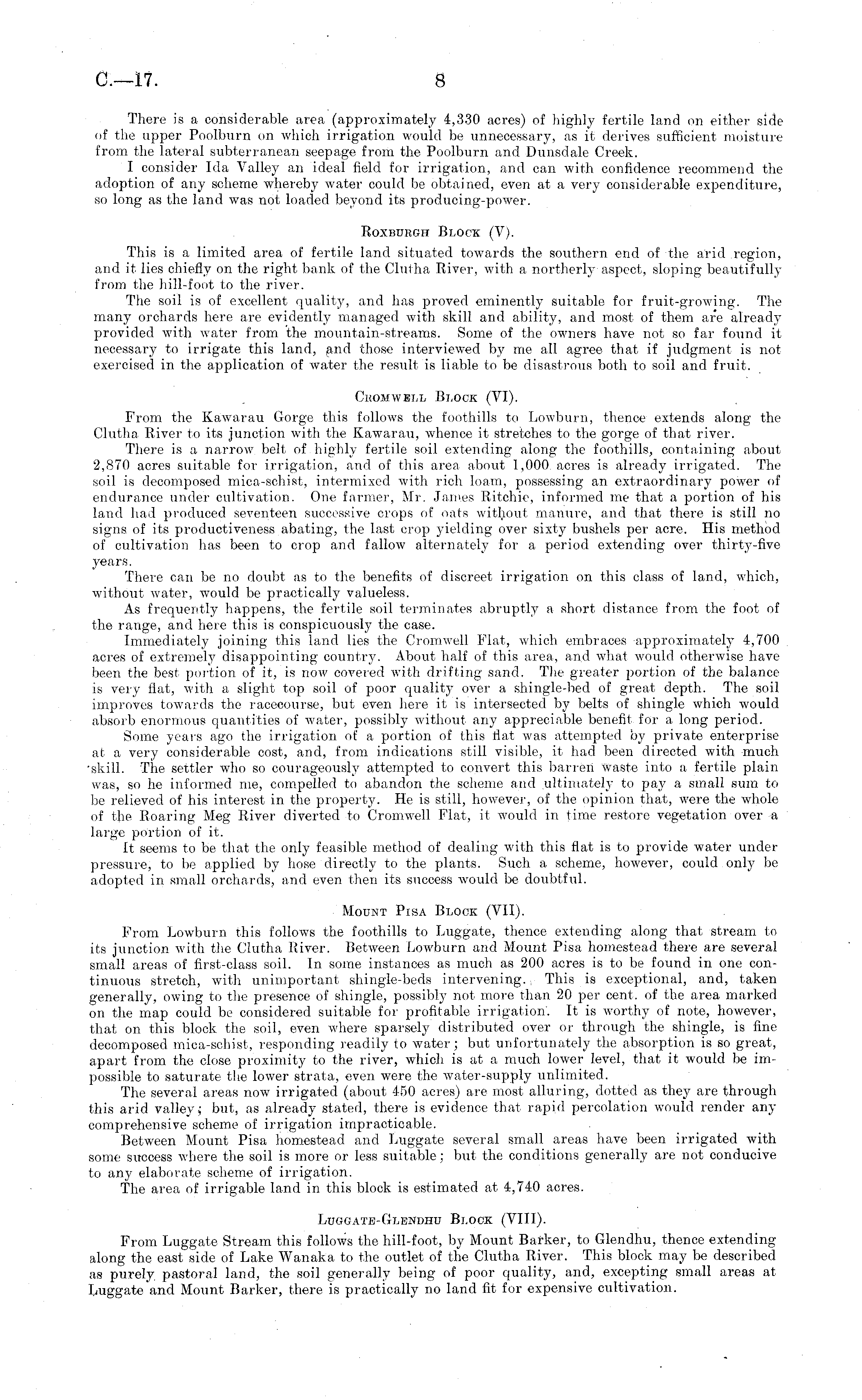 There is a considerable area (approximately 4,330 acres) of highly fertile land on either side of the upper Poolburn on which irrigation would bo unnecessary, as it derives sufficient moisture from the lateral subterranean seepage from the Poolburn and Dunsdale Creek. I consider Ida Valley an ideal field for irrigation, and can with confidence recommend the adoption of any scheme whereby water could be obtained, even at a very considerable expenditure, so long as the land was not loaded beyond its producing-power. Roxburgh Block (V). This is a, limited area of fertile land situated towards the southern end of the arid region, and it lies chiefly on the right bank of the Clutha River, with a northerly aspect, sloping beautifully from the hill-foot to the river. The soil is of excellent quality, and has proved eminently suitable for- fruit-growing. The many orchards here are evidently managed with skill and ability, and most of them are alreadyprovided with water from the mountain-streams. Some of the owners have not so far found it necessary to irrigate this land, and those interviewed by me all agree that if judgment is not exercised in the application of water the result is liable to be disastrous both to soil and fruit. Cromwell Block (VI). From the Kawarau Gorge this follows the foothills to Lowburn, thence extends along the Clutha River to its junction with the Kawarau, whence it stretches to the gorge of that river. There is a narrow belt of highly fertile soil extending along the foothills, containing about 2,870 acres suitable for irrigation, and of this area about 1,000 acres is already irrigated. The soil is decomposed mica-schist, intermixed with rich loam, possessing an extraordinary power of endurance under cultivation. One farmer, Mr. James Ritchie, informed me that a portion of his land had produced seventeen successive crops of oats without manure, and that there is still no signs of its productiveness abating, the last crop yielding over sixty bushels per acre. His method of cultivation has been to crop and fallow alternately for a period extending over thirty-five years. There can be no doubt as to the benefits of discreet irrigation on this class of land, which, without water, would be practically valueless. As frequent!}- happens, the fertile soil terminates abruptly a short distance from the foot of the range, and here this is conspicuously the case. Immediately joining this land lies the Cromwell Flat, which embraces approximately 4,700 acres of extremely disappointing country. About half of this area, and what would otherwise have been the best portion of it, is now covered with drifting sand. The greater portion of the balance is vury flat, with a slight top soil of poor quality over a shingle-bed of great depth. The soil improves towards the racecourse, but even here it is intersected by belts of shingle which would absorb enormous quantities of water, possibly without any appreciable benefit for a long period. Some years ago (he irrigation of a portion of this flat was attempted by private enterprise at a very considerable cost, and, from indications still visible, it had been directed with much 'skill. The settler who so courageously attempted to convert this barren waste into a fertile plain was, so he informed me, compelled to abandon the scheme and ultimately to pay a small sum to be relieved of his interest in the property. He is still, however, of the opinion that, were the whole of the Roaring Meg River diverted to Cronnvoll Flat, it would in time restore vegetation over a large portion of it. ft seems to be that the only feasible method of dealing with this flat is to provide water under pressure, to be applied by hose directly to the plants. Such a scheme, however, could only be adopted in small orchards, and even then its success would be doubtful. Mount Pisa Block (VII). From Lowburn this follows the foothills to Luggate, thence extending along that stream to its junction with the Clutha River. Between Lowburn and Mount Pisa homestead there are several small areas of first-class soil. In some instances as much as 200 acres is to be found in one continuous stretch, with unimportant shingle-beds intervening. This is exceptional, and, taken generally, owing to the presence of shingle, possibly not more than 20 per cent, of the area marked on the map could be considered suitable for profitable irrigation. It is worthy of note, however, that on this block the soil, even where sparsely distributed over or through the shingle, is fine decomposed mica-schist, responding readily to water; but unfortunately the absorption is so great, apart from the close proximity to the river, which is at a much lower level, that it would be impossible to saturate the lower strata, even were the water-supply unlimited. The several areas now irrigated (about 450 acres) are most alluring, dotted as they are through this arid valley; but, as already stated, there is evidence that rapid percolation would render any comprehensive scheme of irrigation impracticable. Between Mount Pisa homestead and Luggate several small areas have been irrigated with some success where the soil is more or less suitable ; but the conditions generally- are not conducive to any elaborate scheme of irrigation. The area of irrigable land in this block is estimated at 4,740 acres. Luggate-Glendhu Block (VIII). From Luggate Stream this follows the hill-foot, by Mount Barker, to Glendhu, thence extending along the east side of Lake Wanaka to the outlet of the Clutha River. This block may be described as purely, pastoral land, the soil generally being of poor quality, and, excepting small areas at Luggate and Mount Barker, there is practically no land fit for expensive cultivation.