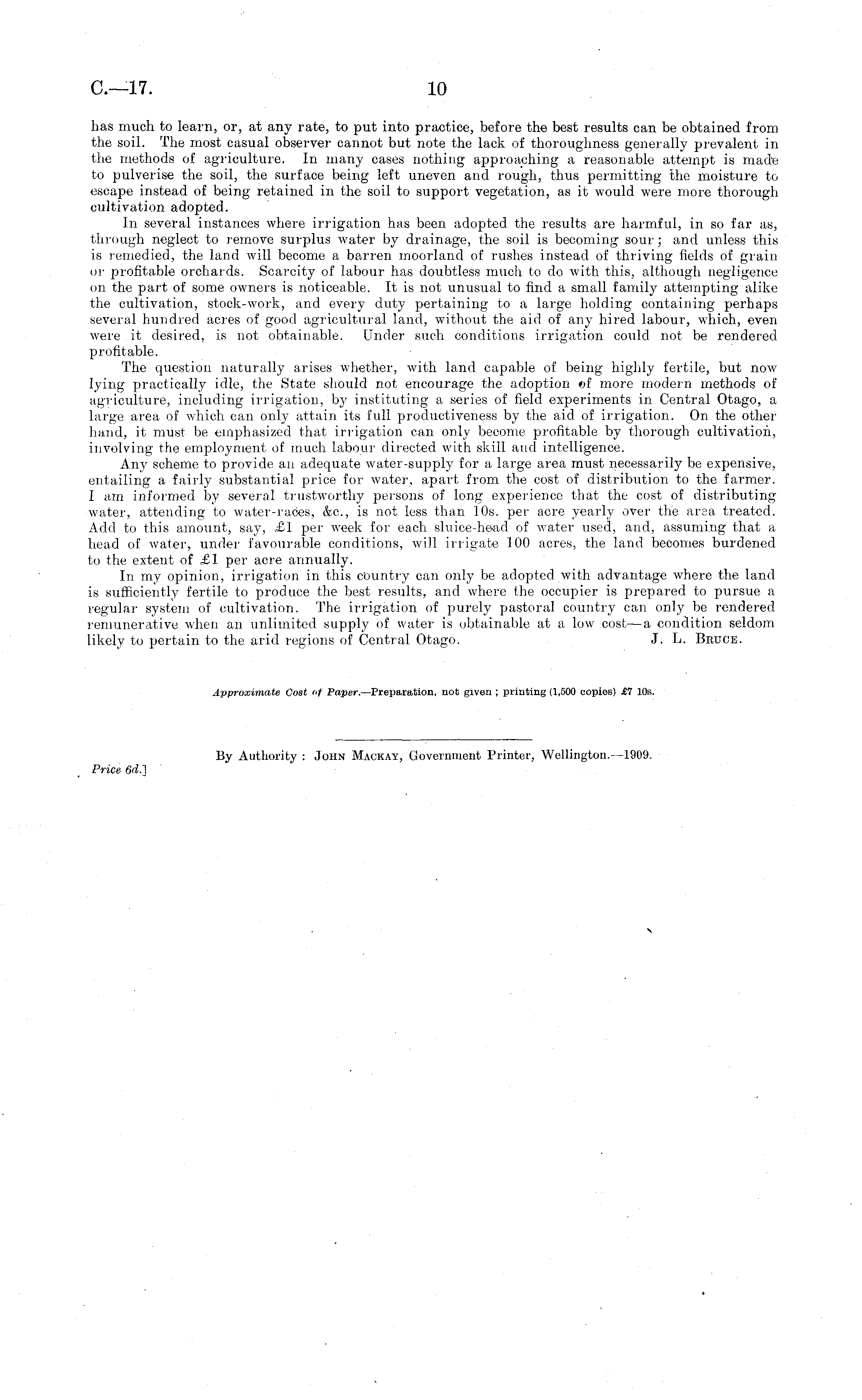 has much to learn, or, at any rate, to put into practice, before the best results can be obtained from the soil. The most casual observer cannot but note the lack of thoroughness generally prevalent in the methods of agriculture. In many cases nothing approaching a reasonable attempt is made to pulverise the soil, the surface being left uneven and rough, thus permitting the moisture to escape instead of being retained in the soil to support vegetation, as it would were more thorough cultivation adopted. In several instances where irrigation has been adopted the results are harmful, in so far as, through neglect to remove surplus water by drainage, the soil is becoming sour; and unless this is remedied, the land will become a barren moorland of rushes instead of thriving fields of grain or profitable orchards. Scarcity of labour has doubtless much to do with this, although negligence on the part of some owners is noticeable. It is not unusual to find a small family attempting alike the cultivation, stock-work, and every duty pertaining to a large holding containing perhaps several hundred acres of good agricultural land, without the aid of any hired labour, which, even were it desired, is not obtainable. Under such conditions irrigation could not be rendered profitable. The question naturally arises whether, with land capable of being highly fertile, but now lying practically idle, the State should not encourage the adoption of more modern methods of agriculture, including irrigation, by instituting a series of field experiments in Central Otago, a large area of which can only attain its full productiveness by the aid of irrigation. On the other hand, it must be emphasized that irrigation can only become profitable by thorough cultivation, involving the employment of much labour directed with skill and intelligence. Any scheme to provide an adequate water-supply for a large area must necessarily be expensive, entailing a fairly substantial price for water, apart from the cost of distribution to the farmer. I am informed by several trustworthy persons of long experience that the cost of distributingwater, attending to water-races, &c, is not less than 10s. per acre yearly over the area treated. Add to this amount, say, £1 per week for each sluice-head of water used, and, assuming that a head of water, under favourable conditions, will irrigate 100 acres, the land becomes burdened to the extent of £1 per acre annually. hi my opinion, irrigation in this country can only be adopted with advantage where the land is sufficiently fertile to produce the best results, and where the occupier is prepared to pursue a regular system of cultivation. The irrigation of purely pastoral country can only be rendered remunerative when an unlimited supply of water is obtainable at a low cost —a condition seldom likely to pertain to the arid regions of Central Otago. J. L. Bruce.