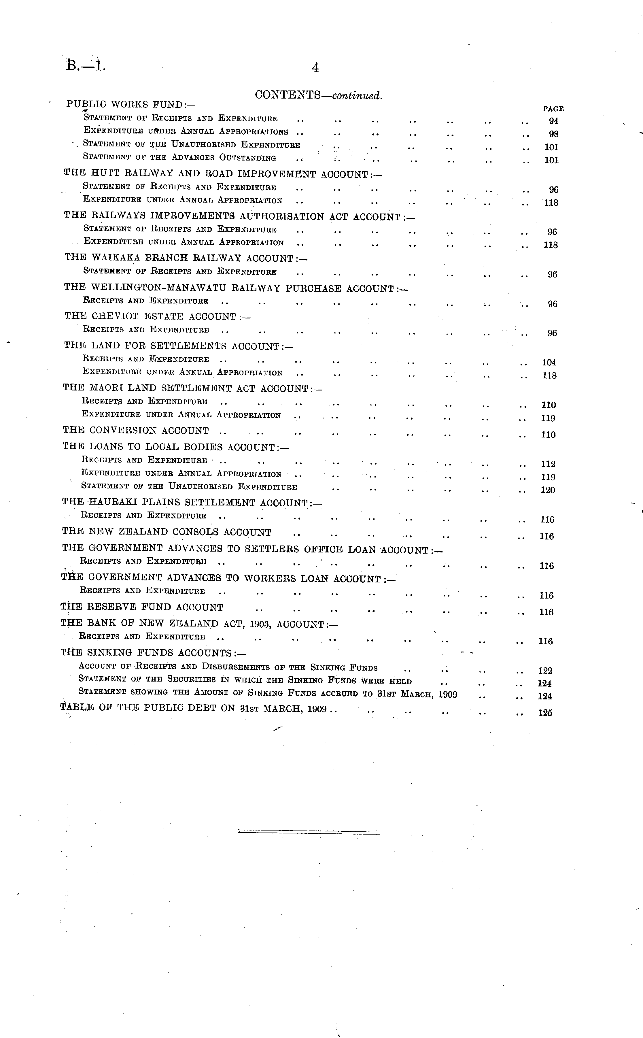 CONTENTS— continued. PUBLIC WORKS FUND:— pAGE Statement of Receipts and Expenditure .. .. .. .. ~ 94. Expenditure under Annual Appropriations .. .. .. .. .. 93 Statement of the Unauthorised Expenditure .. .. .. .. 101 Statement of the Advances Outstanding .. ~ .. ~ .. 101 THE HUTT RAILWAY AND ROAD IMPROVEMENT ACCOUNT:— Statement of Receipts and Expenditure .. .. .. .. ~ .. gg Expenditure under Annual Appropriation .. .. .. .. .. Hg THE RAILWAYS IMPROVEMENTS AUTHORISATION ACT ACCOUNT:— Statement of Receipts and Expenditure .. .. .. .. ~ gg . Expenditure under Annual Appropriation .. .. .. ~ .. .. ..318 THE WAIKAKA BRANCH RAILWAY ACCOUNT :— Statement of Receipts and Expenditure .. .. .. .. .. gg THE WELLINGTON-MANAWATU RAILWAY PURCHASE ACCOUNT :— Receipts and Expenditure .. .. .. .. ~ ~ gg THE CHEVIOT ESTATE ACCOUNT :— Receipts and Expenditure .. .. .. .. .. ~ _ _ gg THE LAND FOR SETTLEMENTS ACCOUNT:— Receipts and Expenditure .. .. .. .. .. ~ 104 Expenditure under Annual Appropriation .. .. .. ~ .. Hg THE MAORI LAND SETTLEMENT ACT ACCOUNT:— Receipts and Expenditure .. .. .. .. .. ~ __ HO Expenditure under Annual Appropriation .. .. .. ~ .. Hg THE CONVERSION ACCOUNT .. .. .. .. , _ uo THE LOANS TO LOCAL BODIES ACCOUNT :— Receipts and Expenditure .. .. .. .. ■ ~ ~ . ~ „ Expenditure under Annual Appropriation .. .. .. ~ ~ Hg Statement of the Unauthorised Expenditure .. .. .. .. 1 20 THE HAURAKI PLAINS SETTLEMENT ACCOUNT:— Receipts and Expenditure ...... 11c • * • • •• .. lib THE NEW ZEALAND CONSOLS ACCOUNT .. .. .. .. .. .. U6 THE GOVERNMENT ADVANCES TO SETTLERS OFFICE LOAN ACCOUNT :— Receipts and Expenditure ...... ~„ lib THE GOVERNMENT ADVANCES TO WORKERS LOAN ACCOUNT :— Receipts and Expenditure ...... ~„ *" ' • • • •• .. lib THE RESERVE FUND ACCOUNT .... ~e • • ',• .. .. lib THE BANK OF NEW ZEALAND ACT, 1903, ACCOUNT :— Receipts and Expenditure .... ~ „ ■ •• •■ •• •. .. lib THE SINKING FUNDS ACCOUNTS :— Account of Receipts and Disbursements of the Sinking Funds .. .. 129 Statement of the Securities in which the Sinking Funds were held .. .. !24 Statement showing the Amount of Sinking Funds accrued to 31st March, 1909 .. 124 TABLE OF THE PUBLIC DEBT ON 31st MARCH, 1909 .. .. IQfi