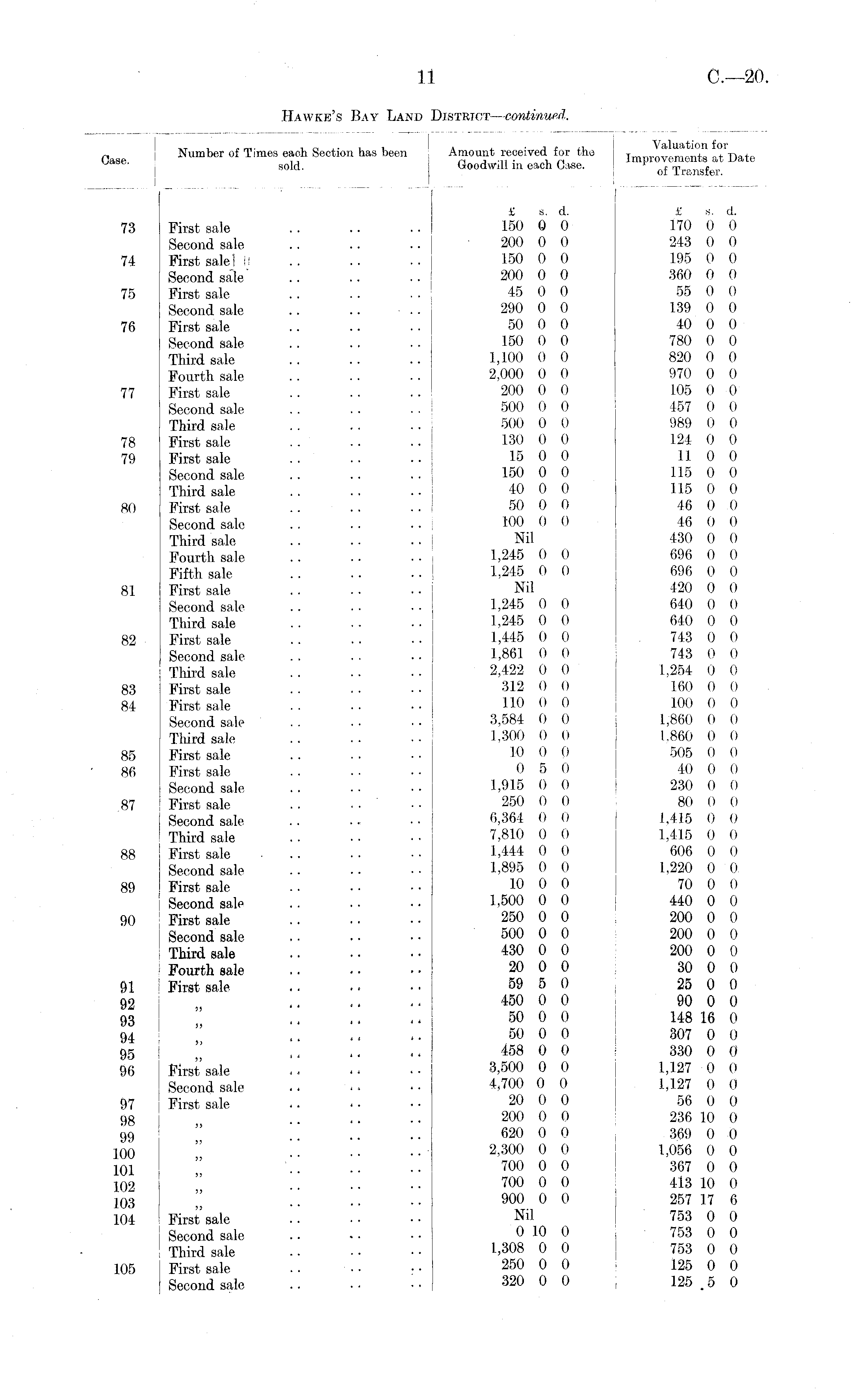 lase. Number of Times each Section has been sold. . Amount received for the Goodwill in each Case. valuation tor Improvements at Dat of Transfer. 73 74 75 76 77 78 79 80 81 82 83 84 85 86 First sale Second sale First sale | fl Second sale First sale Second sale First sale Second sale Third sale Fourth sale First sale Second sale Third sale First sale First sale Second sale Third sale First sale Second sale Third sale Fourth sale Fifth sale First sale .. Second sale Third sale First sale Second sale. Third sale First sale First sale Second salo Third sale First sale First sale Second sale First sale Second sale Third sale First sale Second sale First sale Second sale First sale Second sale Third sale Fourth sale First sale £ s. d. 150 0 0 200 0 0 150 0 0 200 0 0 45 0 0 290 0 0 50 0 0 150 0 0 1,100 0 0 2,000 0 0 200 0 0 500 0 0 500 0 0 130 0 0 15 0 0 150 0 0 40 0 0 50 0 0 100 0 0 Nil 1,245 0 0 1,245 0 0 Nil 1,245 0 0 1,245 0 0 1,445 0 0 1,861 0 0 2,422 0 0 312 0 0 110 0 0 3,584 0 O 1.300 0 0 10 0 0 0 5 0 1.915 0 0 250 0 0 6,364 0 0 7.810 0 0 1,444 0 0 1,895 0 0 10 0 0 1,500 0 0 250 0 0 500 0 0 430 0 0 20 0 0 59 5 0 450 0 0 50 0 0 50 0 0 458 0 0 3,500 0 0 4,700 0 0 20 0 0 200 0 0 620 0 0 2,300 0 0 700 0 0 700 0 0 900 0 0 Nil 0 10 0 1,308 0 0 250 0 0 320 0 0 i i £ s. d. 170 0 0 243 0 0 195 0 0 360 0 0 55 0 0 139 0 0 40 0 0 780 0 0 820 0 0 970 0 0 105 0 0 457 0 0 989 0 0 124 0 0 11 0 0 115 0 0 115 0 0 46 0 0 46 0 0 430 0 0 696 0 0 696 0 0 420 0 0 640 0 0 640 0 0 743 0 0 743 0 0 1,254 0 0 160 0 0 100 0 0 1,860 0 O 1,860 0 0 505 0 0 40 0 0 230 0 0 80 0 0 1,415 0 0 1,415 0 0 606 0 0 1,220 0 0 70 0 0 440 0 0 200 0 0 200 0 0 200 0 0 30 0 0 25 0 0 90 0 0 148 16 0 307 0 0 330 0 0 1,127 0 0 1,127 0 0 56 0 0 236 10 0 369 0 0 1,056 0 0 367 0 0 413 10 0 257 17 6 753 0 0 753 0 0 753 0 0 125 0 0 125 5 0 .87 88 89 90 91 92 93 94 95 96 33 ' ' ' ' 13 ' ' ' * 33 * * ' ' 33 * ' First sale Second sale First sale 97 98 99 100 101 102 103 104 First sale Second sale Third sale First sale Second sale 105