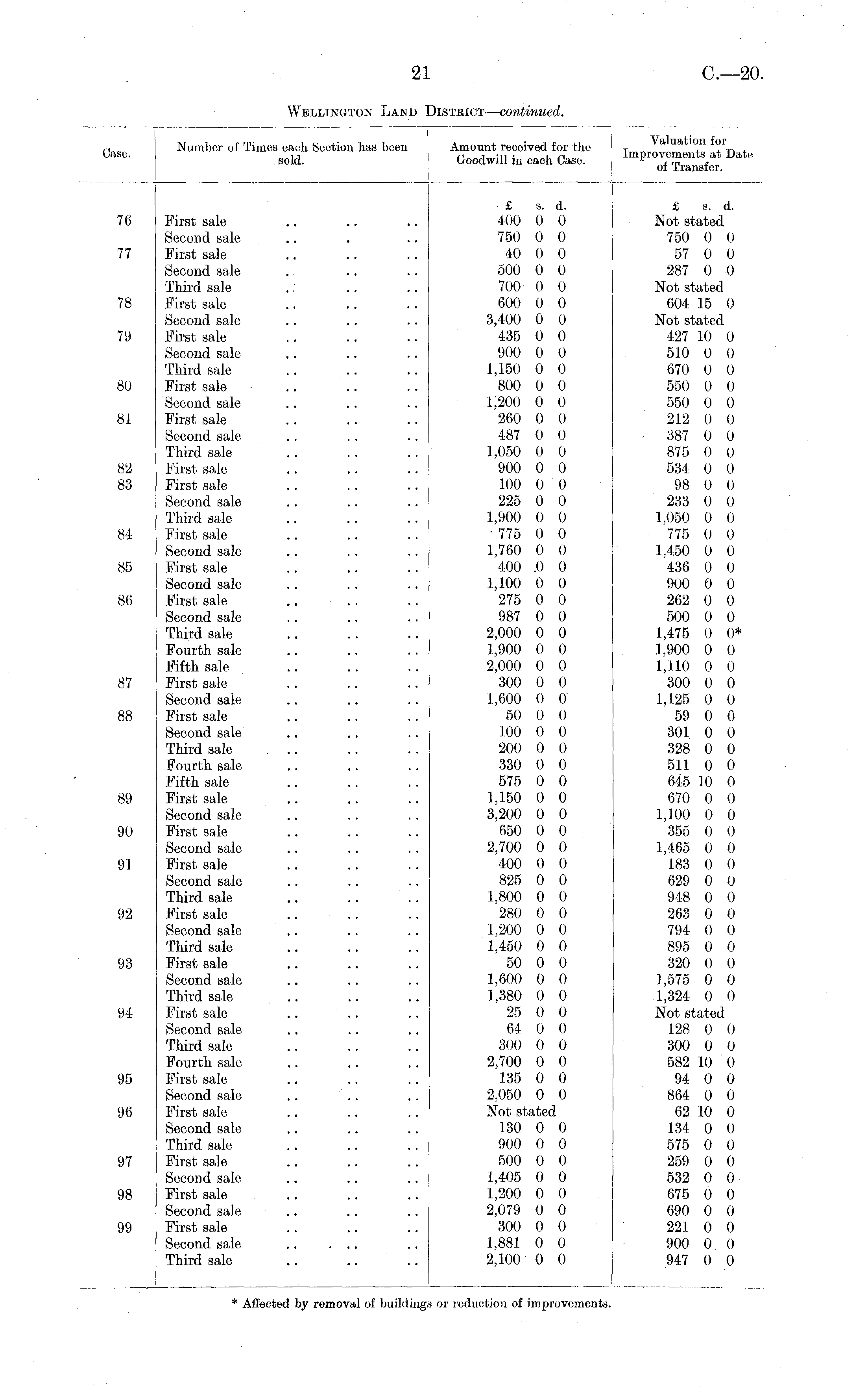 j&SV. Number of Times each Section has been sold. Amount received for the Goodwill in each Case. valuation for Improvements at Date of Transfer. 76 First sale Second salo First sale Second sale Third sale First sale Second sale First sale Second sale Third sale First sale Second sale First sale Second sale Third sale First sale First sale Second sale Third sale First sale Second sale First sale Second sale First sale Second sale Third sale Fourth sale Fifth sale First sale Second sale First sale Second salo Third sale Fourth sale Fifth sale First sale Second sale First sale Second sale First sale Second sale Third sale First sale Second sale Third sale First sale Second sale Third sale First sale Second sale Third sale Fourth salo First sale Second sale First sale Second sale Third sale First sale Second sale First sale Second salo First sale Second sale Third sale £ s. d. 400 0 0 750 0 0 40 0 0 500 0 0 700 0 0 600 0 0 3,400 0 0 435 0 0 900 0 0 1,150 0 0 800 0 0 1,200 0 0 260 0 0 487 0 0 1,050 0 0 900 0 0 100 0 0 225 0 0 "1,900 0 0 '775 0 0 1,760 0 0 400 .0 0 1,100 0 0 275 0 0 987 0 0 2,000 0 0 1,900 0 0 2,000 0 0 300 0 0 1,600 0 0 50 0 0 100 0 0 200 0 0 330 0 0 575 0 0 1,150 0 0 3,200 0 0 650 0 0 2,700 0 0 400 0 0 825 0 0 1,800 0 0 280 0 0 1,200 0 0 1,450 0 0 50 0 0 1,600 0 0 1,380 0 0 25 0 0 64 0 0 300 0 0 2,700 0 0 135 0 0 2,050 0 0 Not stated "130 0 0 900 0 0 500 0 0 1,405 0 0 1,200 0 0 2,079 0 0 300 0 0 1,881 0 0 2,100 0 0 £ s. d. Not stated 750 0 0 57 0 0 287 0 0 Not stated 604 15 0 Not stated 427 10 0 510 0 0 670 0 0 550 0 0 550 0 0 212 0 0 387 0 0 875 0 0 534 0 0 98 0 0 233 0 0 1,050 0 0 775 0 0 1,450 0 0 436 0 0 900 0 0 262 0 0 500 0 0 1,475 0 0* 1,900 0 0 1,110 0 0 300 0 0 1,125 0 0 59 0 0 301 0 0 328 0 0 511 0 0 645 10 0 670 0 0 1,100 0 0 355 0 0 1,465 0 0 183 0 0 629 0 0 948 0 0 263 0 0 794 0 0 895 0 0 320 0 0 1,575 0 0 1,324 0 0 Not stated 128 0 0 300 0 0 582 10 0 94 0 0 864 0 0 62 10 0 134 0 0 575 0 0 259 0 0 532 0 0 675 0 0 690 0 0 221 0 0 900 0 0 947 0 0 77 78 79 80 81 82 83 84 85 86 87 88 89 90 91 92 93 94 95 96 97 98 99 * Affected bremoval of buildini or reduction of im irovements.