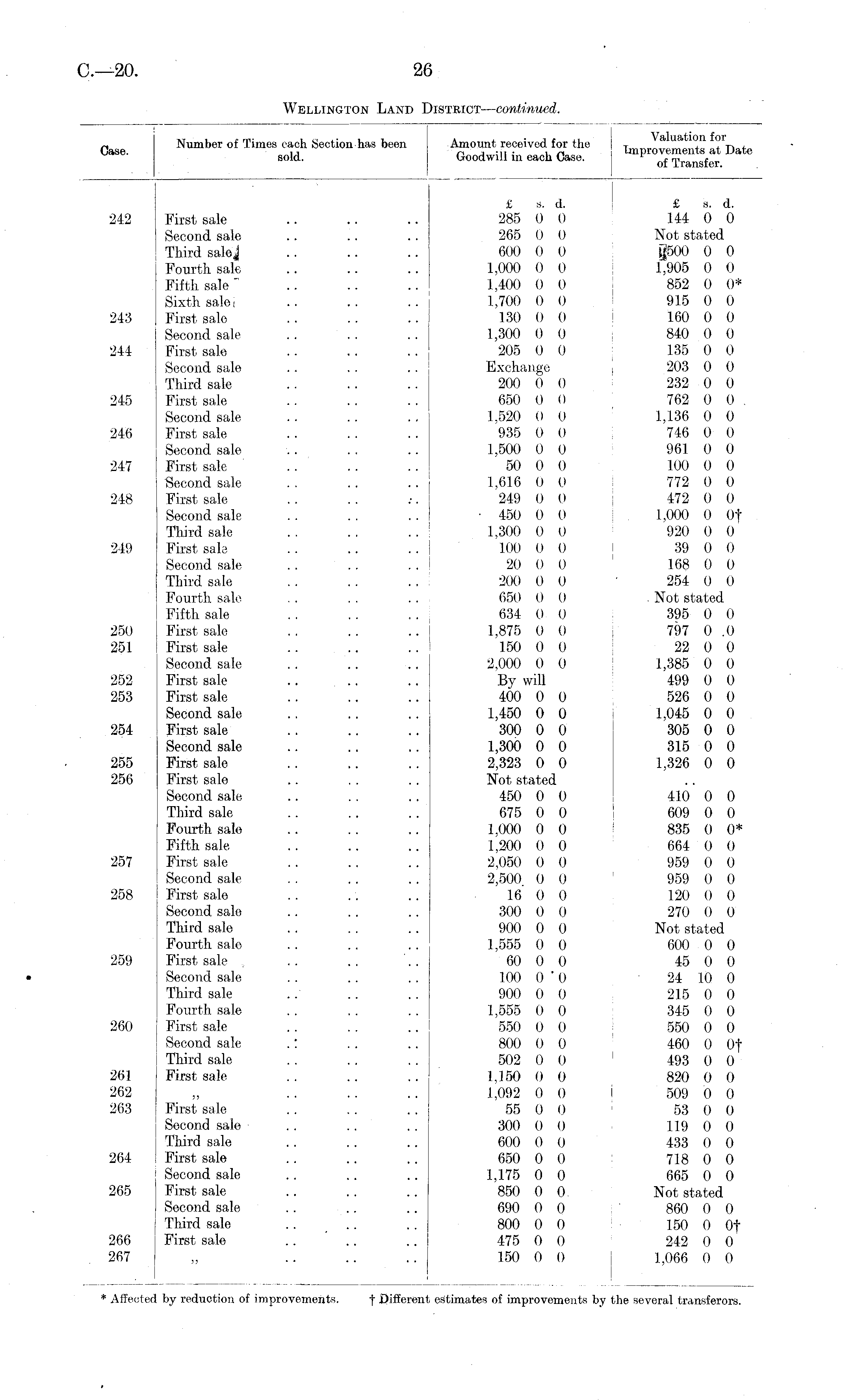 Jase. Number of Times each Section has been sold. Amount received for the Goodwill in each Case. Valuation for | Improvements at Dati of Transfer. 242 243 244 245 246 247 248 249 250 251 252 253 254 First sale Second salo Third salej Fourth sale Fifth sale " Sixth sale; First salo Second sale First sale Second salo Third sale First sale Second sale First sale Second sale First sale "Second salo First sale Second sale Third sale First sale Second salo Third sale Fourth salo Fifth sale First sale First sale Second salo First sale First sale Second sale First sale Second sale First sale First sale Second sale Third sale Fourth sale Fifth sale First sale Second sale First sale Second salo Third sale Fourth salo First sale Second sale Third sale Fourth salo First sale Second sale .; Third sale First sale £ s. d. £ s. d. 285 0 0 144 0 0 265 0 0 Not stated 600 0 0 g500 0 0 1,000 0 0 1,905 0 0 1,400 0 0 852 0 0* 1,700 0 0 915 0 0 130 0 0 160 0 0 1,300 0 0 840 0 0 205 0 0 135 0 0 Exchange 203 0 0 200 0 0 232 0 0 650 0 0 762 0 0 1,520 0 0 1,136 0 0 935 0 0 746 0 0 1,500 0 0 961 0 0 50 0 0 100 0 0 1,616 0 0 772 0 0 249 0 0 472 0 0 • 450 0 0 1,000 0 Of 1,300 0 0 920 0 0 100 0 0 39 0 0 20 0 0 168 0 0 200 0 0 254 0 0 650 0 0 Not stated 634 0 0 395 0 0 1,875 0 0 797 0 .0 150 0 0 22 0 0 2,000 0 0 1,385 0 0 By will 499 0 0 400 0 0 526 0 0 1,450 0 0 1,045 0 0 300 0 0 305 0 0 1,300 0 0 315 0 0 2,323 0 0 1,326 0 0 Not stated 450 0 0 410 0 0 675 0 0 609 0 0 1,000 0 0 835 0 0* 1,200 0 0 664 0 0 2,050 0 0 959 0 0 2,500 0 0 959 0 0 16 0 0 120 0 0 300 0 0 270 0 0 900 0 0 Not stated 1,555 0 0 600 0 0 60 0 0 45 0 0 100 0 ' 0 24 10 0 900 0 0 215 0 0 1,555 0 0 345 0 0 550 0 0 550 0 0 800 0 0 460 0 Of 502 0 0 493 0 0 1,150 0 0 820 0 0 1,092 0 0 i 509 0 0 55 0 0 53 0 0 300 0 () 119 0 0 600 0 0 433 0 0 650 0 0 718 0 0 1,175 0 0 665 0 0 850 0 0 Not stated 690 0 0 860 0 0 800 0 0 150 0 0| 475 0 0 242 0 0 150 0 0 1,066 0 0 255 256 257 258 259 260 261 262 263 First sale Second sale Third salo First sale Second sale First sale Second sale Third sale First sale 264 265 266 267 33 ! Affectei by reduction of improvements. f Differen - estimates of improvements by the several transferors.