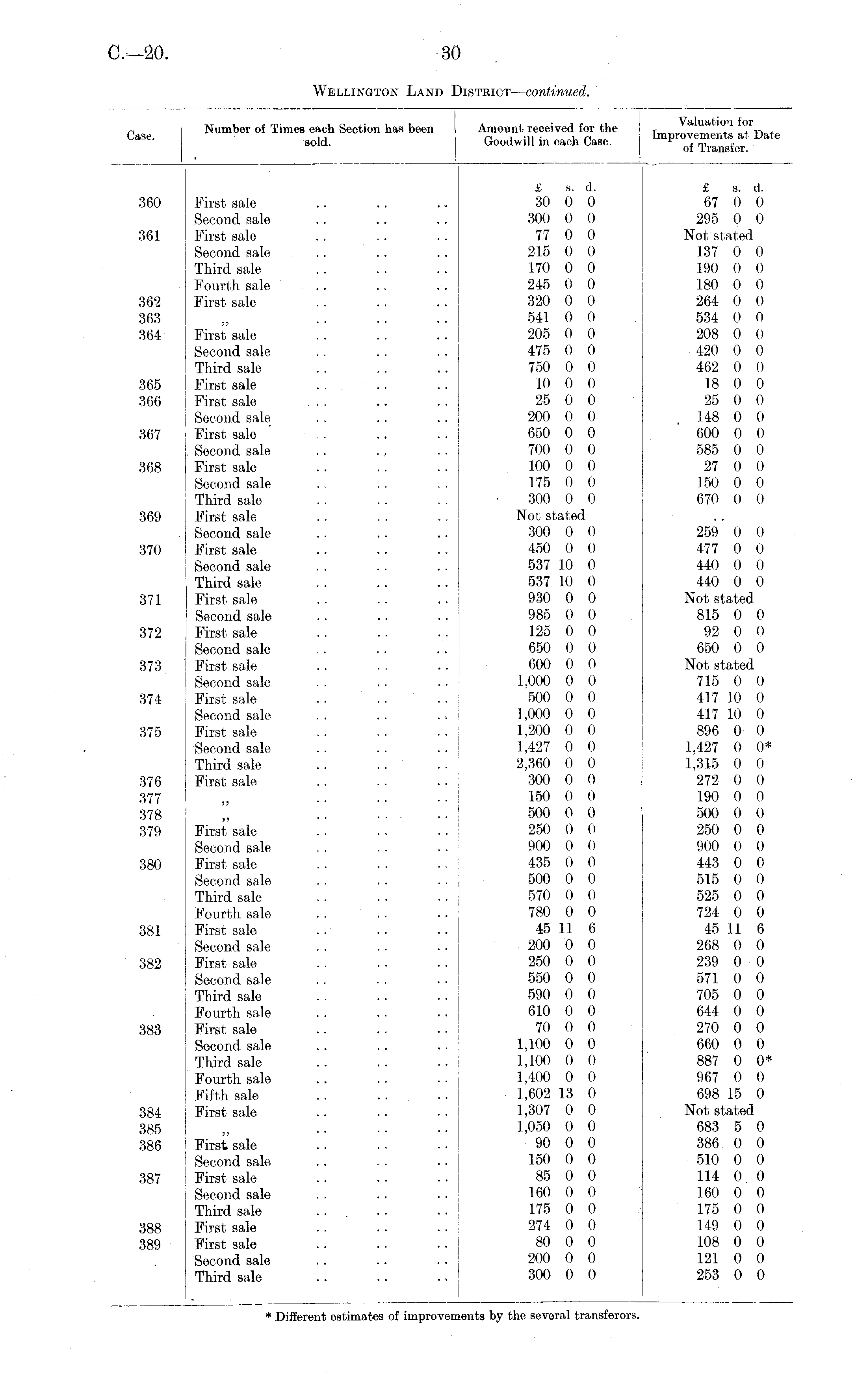!ase. Number of Times each Section has been sold. Amount received for the Goodwill in each Case. Valuation for I Improvements at Dati of Transfer. 1 360 361 362 363 364 First sale Second sale First sale Second sale Third sale Fourth salo First sale 33 First sale Second sale Third sale First sale First sale Second sale First sale . Second sale First sale Second sale Third sale First sale Second sale First sale Second sale Third sale First sale Second sale First sale I Second sale First sale ! Second sale First sale Second salo First sale Second sale Third sale First sale £ s. d. 30 0 0 300 0 0 77 0 0 215 0 0 170 0 0 245 0 0 320 0 0 541 0 0 205 0 0 475 0 0 750 0 0 10 0 0 25 0 0 200 0 0 650 0 0 700 0 0 100 0 0 175 0 0 300 0 0 £ s. d. 67 0 0 295 0 0 Not stated 137 0 0 190 (I 0 180 0 0 264 0 0 534 0 0 208 0 0 420 0 0 462 0 0 18 0 0 25 0 0 148 0 0 600 0 0 585 0 0 27 0 0 150 0 0 670 0 0 365 366 367 368 369 Not stated 300 0 0 450 0 0 537 10 0 537 10 0 930 0 0 985 0 0 125 0 0 650 0 0 600 0 0 1,000 0 0 500 0 0 1,000 0 0 1,200 0 0 1,427 0 0 2,360 0 0 300 0 0 150 0 0 500 0 0 250 0 0 900 0 0 435 0 0 500 0 0 570 0 0 780 0 0 45 11 6 200 0 0 250 0 0 550 0 0 590 0 0 610 0 0 70 0 0 1,100 0 0 1,100 0 0 1,400 0 0 ■ 1,602 13 0 1,307 0 0 1,050 0 0 90 0 0 150 0 0 85 0 0 160 0 0 175 0 0 274 0 0 80 0 0 200 0 0 300 0 0 259 0 0 477 0 0 440 0 0 440 0 0 Not stated 815 0 0 92 0 0 650 0 0 370 371 372 373 Not stated 715 0 0 417 10 0 417 10 0 896 0 0 1,427 0 0* 1,315 0 0 272 0 0 190 0 0 500 0 0 250 0 0 900 0 0 443 0 0 515 0 0 525 0 0 724 0 0 45 11 6 268 0 0 239 0 0 571 0 0 705 0 0 644 0 0 270 0 0 660 0 0 887 0 0* 967 0 0 698 15 0 Not stated 683 5 0 386 0 0 510 0 0 114 0 0 160 0 0 175 0 0 149 0 0 108 0 0 121 0 0 253 0 0 374 375 376 377 378 379 33 380 381 382 I ! 33 First sale Second sale First sale Second sale Third sale Fourth sale First sale Second sale First sale Second sale Third sale Fourth sale First sale Second sale Third sale Fourth sale Fifth sale First sale 383 384 385 386 33 ; First sale I Second sale First sale Second sale Third sale First sale First sale Second sale Third sale 387 388 389 * Different estimates of improve] tents by the several transferors.