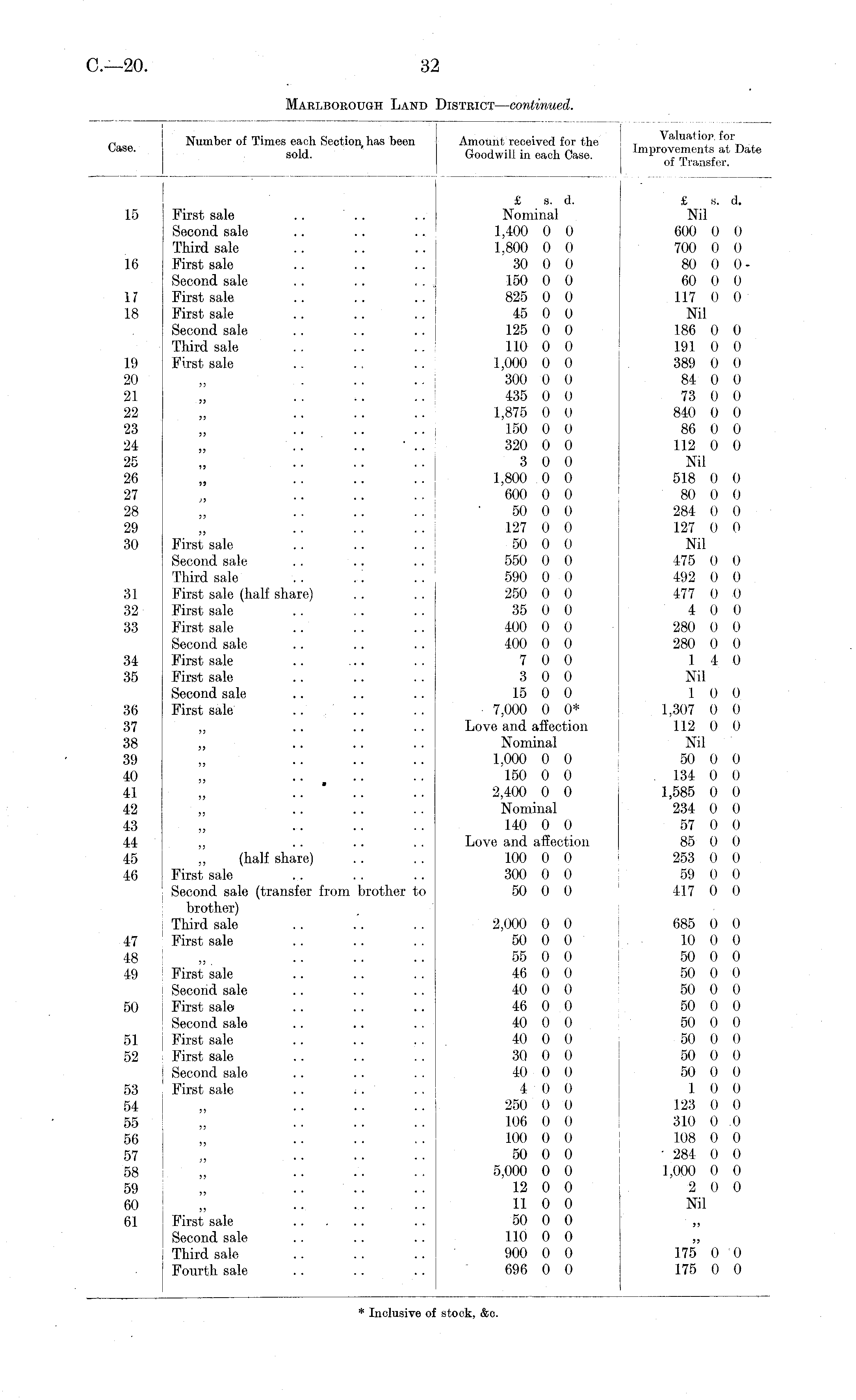;ase. Number of Times each Section, has been sold. Amount received for the Goodwill in each Case. Valuation for Improvements at Dati of Transfer. 15 16 17 18 19 20 21 22 23 24 25 26 27 28 29 30 First sale .. Second sale Third sale First sale Second sale .. . . First sale First sale Second sale Third sale First sale .. .. ...' 33 • ■ • • - * ,, - - • • 33 " ' . 33 33 33 33 ' * * * 55 33 First sale Second sale Third sale First sale (half share) First sale First sale Second sale First sale First sale Second sale First sale £ s. d. Nominal 1,400 0 0 1,800 0 0 30 0 0 150 0 0 825 0 0 45 0 0 125 0 0 110 0 0 1,000 0 0 300 0 0 435 0 0 1,875 0 0 150 0 0 320 0 0 3 0 0 1,800 0 0 600 0 0 50 0 0 127 0 0 50 0 0 550 0 0 590 0 0 250 0 0 35 0 0 400 0 0 400 0 0 7 0 0 3 0 0 15 0 0 - 7,000 0 0* Love and affection Nominal 1,000 0 0 150 0 0 2,400 0 0 Nominal 140 0 0 Love and affection 100 0 0 300 0 0 50 0 0 i £ s. d. Nil 600 0 0 700 0 0 80 0 060 0 0 117 0 0 Nil 186 0 0 191 0 0 389 0 0 84 0 0 73 0 0 840 0 0 86 0 0 112 0 0 Nil 518 0 0 80 0 0 284 0 0 127 0 0 Nil 475 0 0 492 0 0 477 0 0 4 0 0 280 0 0 280 0 0 1 4 0 Nil 1 0 0 1.307 0 0 112 0 0 Nil 50 0 0 , 134 0 0 1,585 0 0 234 0 0 57 0 0 85 0 0 253 0 0 59 0 0 417 0 0 31 32 33 34 35 36 37 38 39 40 41 42 43 44 45 46 35 - - » * * ,, (half share) First sale Second sale (transfer from brother to brother) Third sale First sale 47 48 49 50 51 52 53 54 55 56 57 58 59 60 61 35 . First sale Second sale First sale Second sale First sale First sale Second sale First sale .. ; . 2,000 0 0 50 0 0 55 0 0 46 0 0 40 0 0 46 0 0 40 0 0 40 0 0 30 0 0 40 0 0 4 0 0 250 0 0 106 0 0 100 0 0 50 0 0 5,000 0 0 12 0 0 11 0 0 50 0 0 no o o 900 0 0 696 0 0 685 0 0 10 0 0 50 0 0 50 0 0 50 0 0 50 0 0 50 0 0 50 0 0 50 0 0 50 0 0 10 0 123 0 0 310 0 .0 108 0 0 • 284 0 0 1,000 0 0 2 0 0 Nil 175" 0 0 175 0 0 35 33 35 33 First sale Second sale Third sale Fourth sale *
