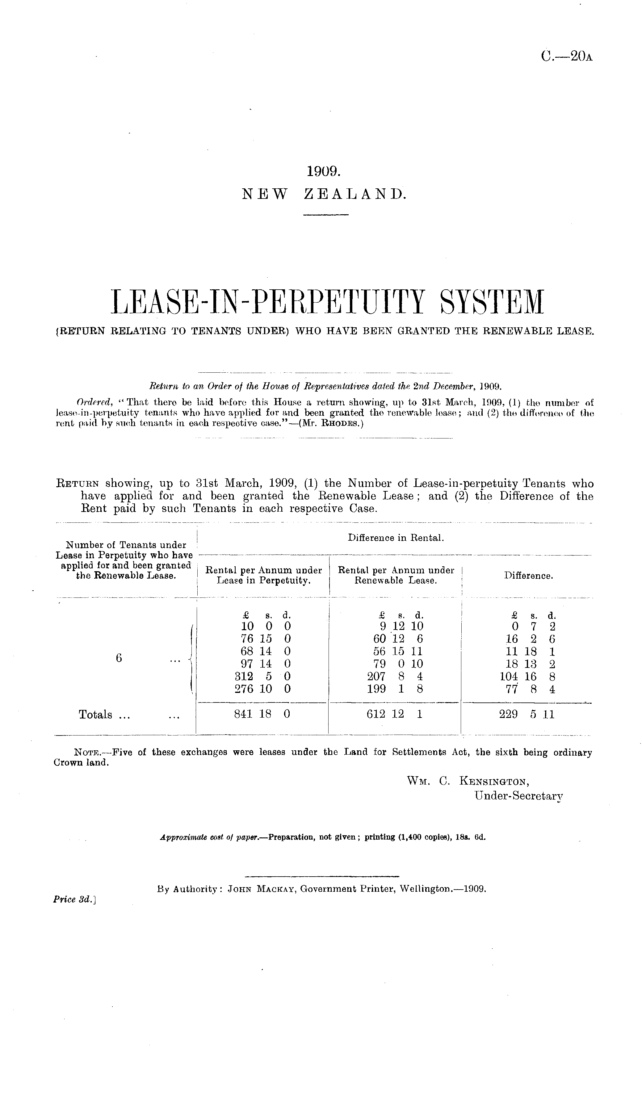 Return to an Order of the House of Representatives dated the 2nd December, 1909. Ordered, "That thoro be laid before this House a return showing, up to 31st March, 1909, (1) tho number of lease-in-perpetuity tenants who have applied for and been granted the renewable lease; and (2) the difference of the rent paid by such tenants in each respective case."—(Mr. Rhodes.)