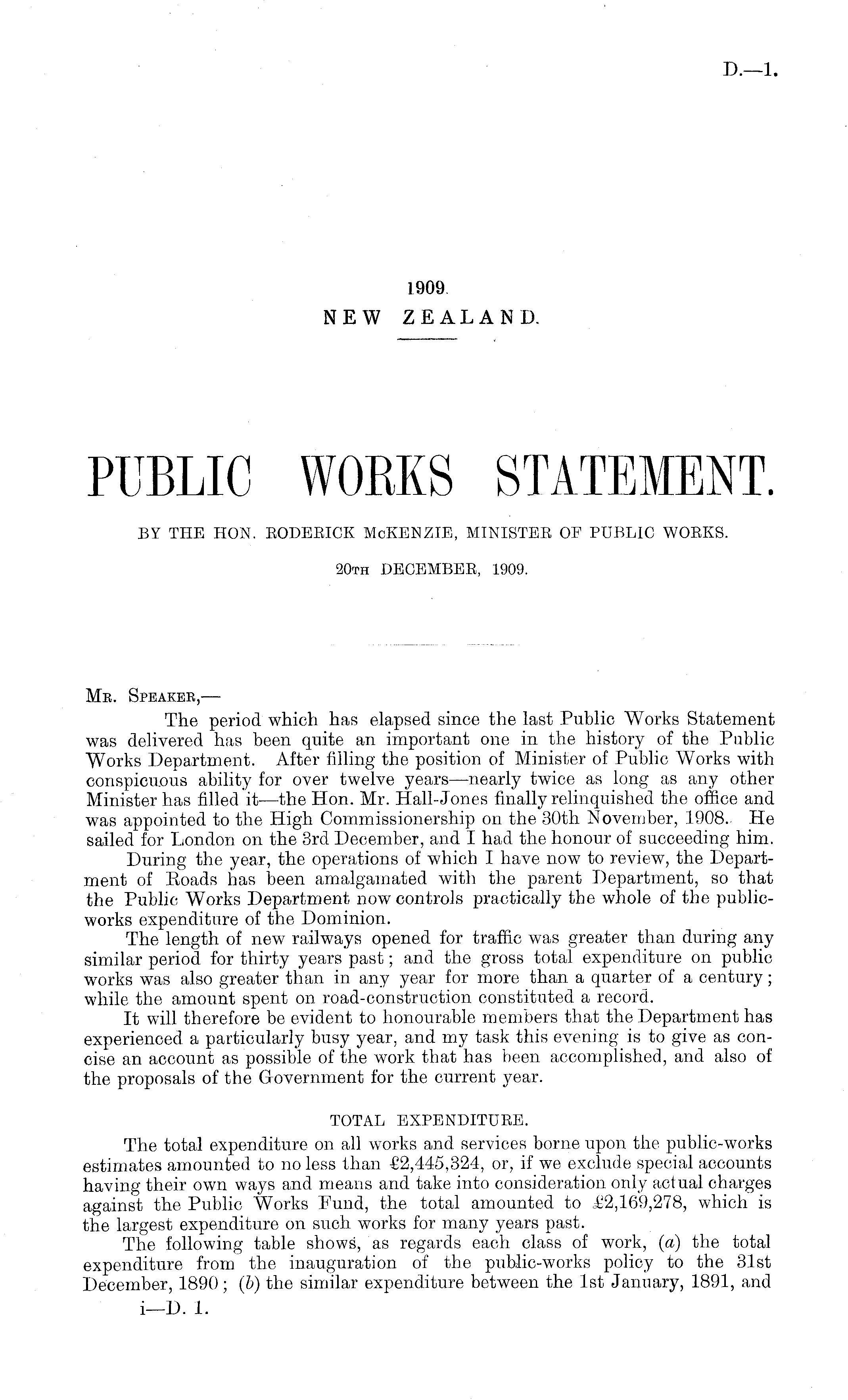 Mr. Speaker,— The period which has elapsed since the last Public Works Statement was delivered has been quite an important one in the history of the Public Works Department. After filling the position of Minister of Public Works with conspicuous ability for over twelve years —nearly twice as long as any other Minister has filled it—the Hon. Mr. Hall-Jones finally relinquished the office and was appointed to the High Commissionership on the 30th November, 1908.. He sailed for London on the 3rd December, and I had the honour of succeeding him. During the year, the operations of which I have now to review, the Department of Eoads has been amalgamated with the parent Department, so that the Public Works Department now controls practically the whole of the publicworks expenditure of the Dominion. The length of new railways opened for traffic was greater than during any similar period for thirty years past; and the gross total expenditure on public works was also greater than in any year for more than a quarter of a century; while the amount spent on road-construction constituted a record. It will therefore be evident to honourable members that the Department has experienced a particularly busy year, and my task this evening is to give as concise an account as possible of the work that has been accomplished, and also of the proposals of the Government for the current year. TOTAL EXPENDITUBE. The total expenditure on all works and services borne upon the public-works estimates amounted to no less than €2,445,324, or, if we exclude special accounts having their own ways and means and take into consideration only actual charges against the Public Works Fund, the total amounted to £2,169,278, which is the largest expenditure on such works for many years past. The following table shows, as regards each class of work, (a) the total expenditure from the inauguration of the public-works policy to the 31st December, 1890; (b) the similar expenditure between the Ist January, 1891, and