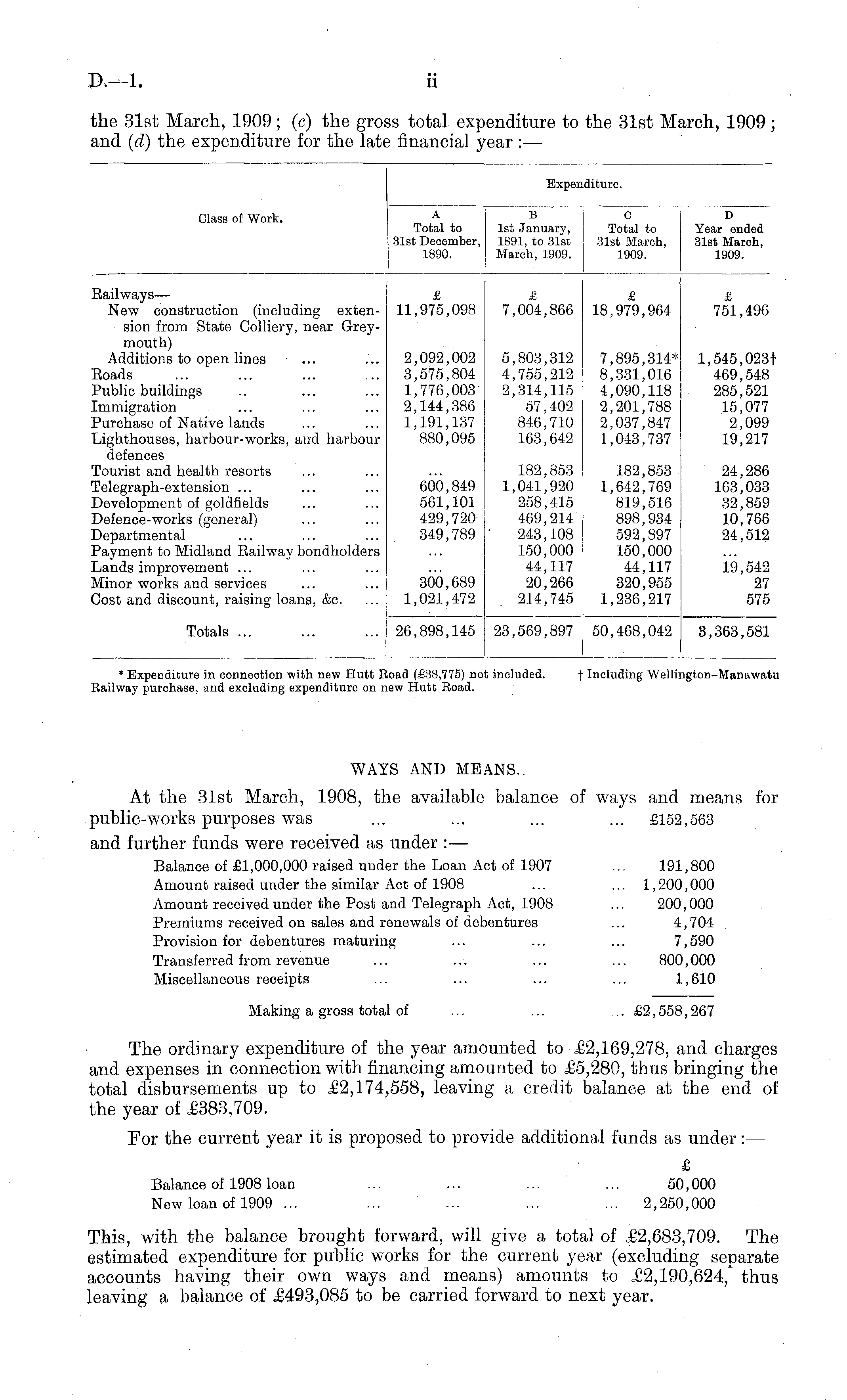 WAYS AND MEANS. At the 31st March, 1908, the available balance of ways and means for public-works purposes was ... ... ... ... £152,563 and further funds were received as under :— Balance of £1,000,000 raised under the Loan Act of 1907 ... 191,800 Amount raised under the similar Act of 1908 ... ... 1,200,000 Amount received under the Post and Telegraph Act, 1908 ... 200,000 Premiums received on sales and renewals of debentures ... 4,704 Provision for debentures maturing ... ... ... 7,590 Transferred from revenue ... ... ... ... 800,000 Miscellaneous receipts ... ... ... ... 1,610 Making a gross total of ... ... ... £2,558,267 The ordinary expenditure of the year amounted to £2,169,278, and charges and expenses in connection with financing amounted to £5,280, thus bringing the total disbursements up to .£2,174,558, leaving a credit balance at the end of the year of £383,709. For the current year it is proposed to provide additional funds as under: — £ Balance of 1908 loan ... ... ... ... 50,000 New loan of 1909 ... ... ... ... ... 2,250,000 This, with the balance brought forward, will give a total of £2,683,709. The estimated expenditure for public works for the current year (excluding separate accounts having their own ways and means) amounts to £2,190,624, thus leaving a balance of £493,085 to be carried forward to next year.