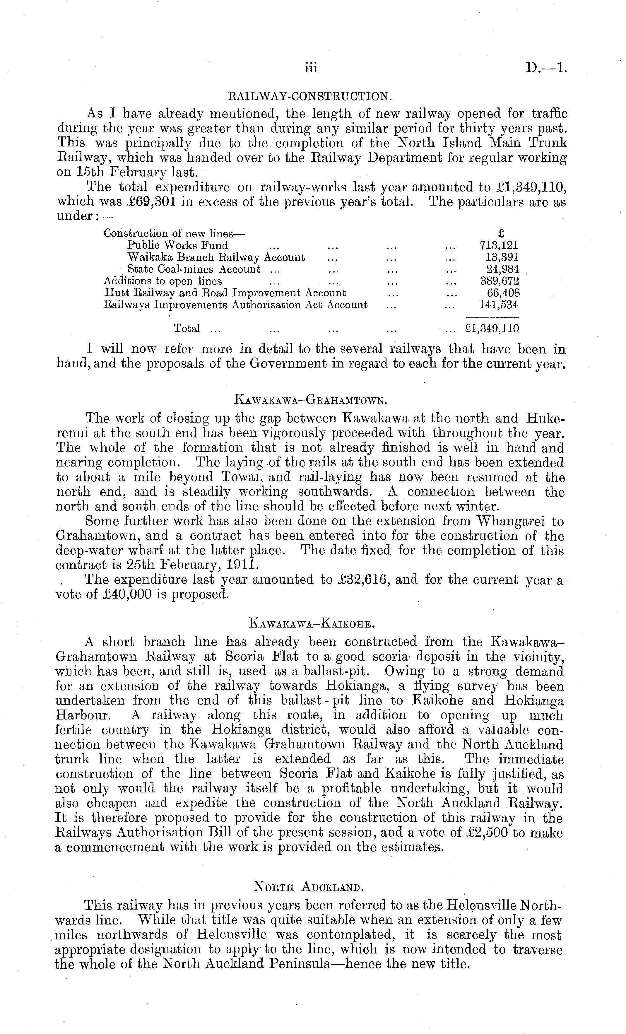 BAILWAY-CONSTBUCTION. As I have already mentioned, the length of new railway opened for traffic during the year was greater than during any similar period for thirty years past. This was principally due to the completion of the North Island Main Trunk Kailway, which was handed over to the Railway Department for regular working on 15th February last. The total expenditure on railway-works last year amounted to £1,349,110, which was £69,301 in excess of the previous year's total. The particulars are as under:— Construction of new lines— £ Public Works Fund ... ... ... ... 713,121 Waikaka Branch Bail way Account ... ... ... 13,391 State Coal-mines Account ... ... ... ... 24,984 Additions to open lines ... ... ... ... 389,672 Hutt Eailway and Boad Improvement Account ... ... 66,408 Bailways Improvements Authorisation Act Account ... ... 141,534 Total ... ... ... ... ... £1,349,110 I will now refer more in detail to the several railways that have been in hand, and the proposals of the Government in regard to each for the current year. Kawakawa-Grahamtown. The work of closing up the gap between Kawakawa at the north and Hukerenui at the south end has been vigorously proceeded with throughout the year. The whole of the formation that is not already finished is well in hand and nearing completion. The laying of the rails at the south end has been extended to about a mile beyond Towai, and rail-laying has now been resumed at the north end, and is steadily working southwards. A connection between the north and south ends of the line should be effected before next winter. Some further work has also been done on the extension from Whangarei to Grahamtown, and a contract has been entered into for the construction of the deep-water wharf at the latter place. The date fixed for the completion of this contract is 25th February, 1911. The expenditure last year amounted to £32,616, and for the current year a vote of £40,000 is proposed. Kawakawa-Kaikohe . A short branch line has already been constructed from the KawakawaGrahamtown Kailway at Scoria Flat to a good scoria deposit in the vicinity, which has been, and still is, used as a ballast-pit. Owing to a strong demand for an extension of the railway towards Hokianga, a flying survey has been undertaken from the end of this ballast - pit line to Kaikohe and Hokianga Harbour. A railway along this route, in addition to opening up much fertile country in the Hokianga district, would also afford a valuable connection between the Kawakawa-Grahamtown Kailway and the North Auckland trunk line when the latter is extended as far as this. The immediate construction of the line between Scoria Flat and Kaikohe is fully justified, as not only would the railway itself be a profitable undertaking, but it would also cheapen and expedite the construction of the North Auckland Railway. It is therefore proposed to provide for the construction of this railway in the Railways Authorisation Bill of the present session, and a vote of £2,500 to make a commencement with the work is provided on the estimates. North Auckland. This railway has in previous years been referred to as the Helensville Northwards line. While that title was quite suitable when an extension of only a few miles northwards of Helensville was contemplated, it is scarcely the most appropriate designation to apply to the line, which is now intended to traverse the whole of the North Auckland Peninsula—hence the new title.