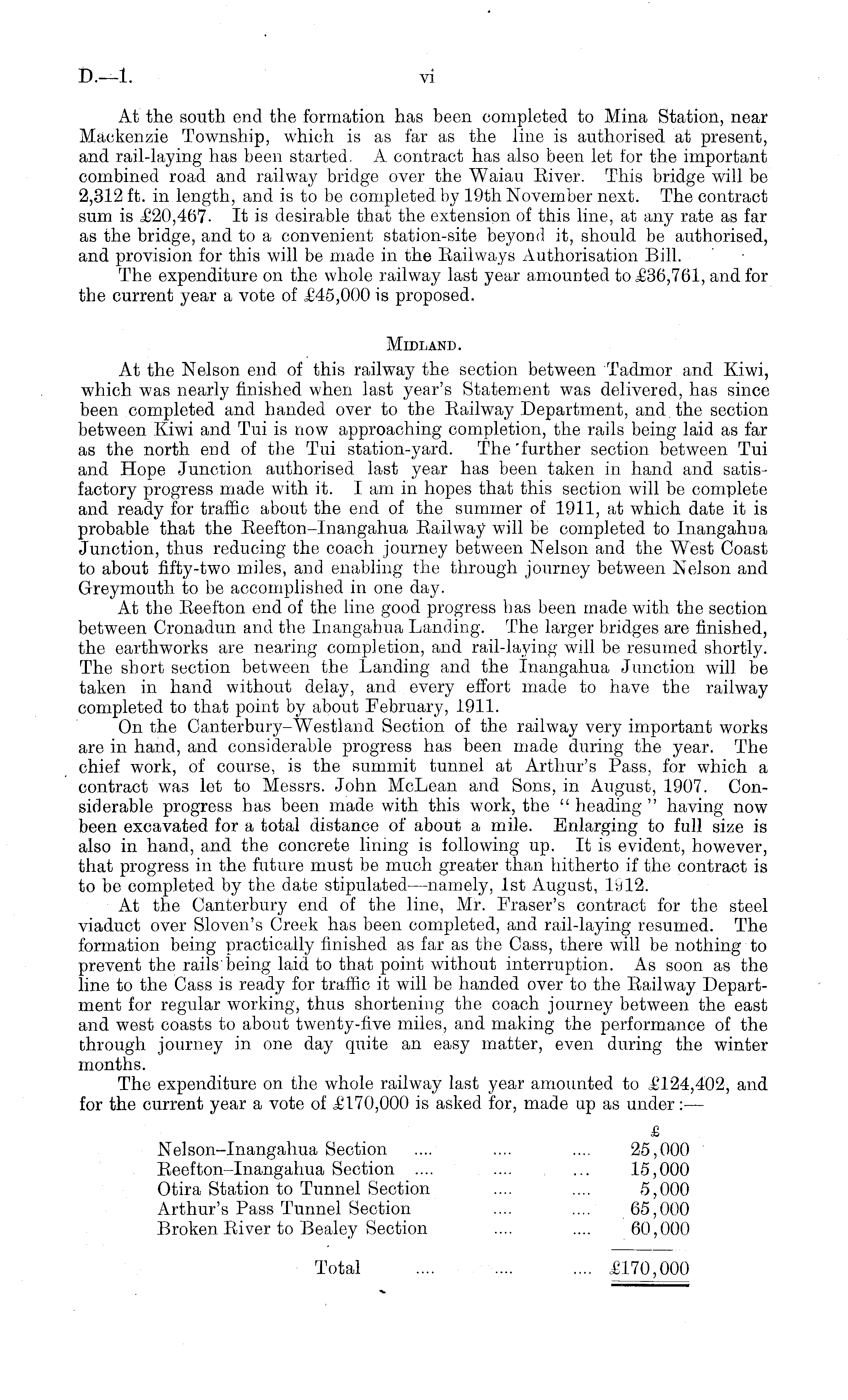 At the south end the formation has been completed to Mina Station, near Mackenzie Township, which is as far as the line is authorised at present, and rail-laying has been started. A. contract has also been let for the important combined road and railway bridge over the Waiau River. This bridge will be 2,312 ft. in length, and is to be completed by 19th November next. The contract sum is £20,467- It is desirable that the extension of this line, at any rate as far as the bridge, and to a convenient station-site beyond it, should be authorised, and provision for this will be made in the Railways Authorisation Bill. The expenditure on the whole railway last year amounted to £36,761, and for the current year a vote of £45,000 is proposed. Midland. At the Nelson end of this railway the section between Tadmor and Kiwi, which was nearly finished when last year's Statement was delivered, has since been completed and handed over to the Railway Department, and, the section between Kiwi and Tui is now approaching completion, the rails being laid as far as the north end of the Tui station-yard. The'further section between Tui and Hope Junction authorised last year has been taken in hand and satisfactory progress made with it. lam in hopes that this section will be complete and ready for traffic about the end of the summer of 1911, at which date it is probable that the Reefton-Inangahua Railway will be completed to Inangahua Junction, thus reducing the coach journey between Nelson and the West Coast to about fifty-two miles, and enabling the through journey between Nelson and Greymouth to be accomplished in one day. At the Reefton end of the line good progress has been made with the section between Cronadun and the Inangahua Landing. The larger bridges are finished, the earthworks are nearing completion, and rail-laying will be resumed shortly. The short section between the Landing and the Inangahua Junction will be taken in hand without delay, and every effort made to have the railway completed to that point by about February, 1911. On tbe Canterbury-Westland Section of the railway very important works are in hand, and considerable progress has been made during the year. The chief work, of course, is the summit tunnel at Arthur's Pass, for which a contract was let to Messrs. John McLean and Sons, in August, 1907. Considerable progress has been made with this work, the " heading " having now been excavated for a total distance of about a mile. Enlarging to full size is also in hand, and the concrete lining is following up. It is evident, however, that progress in the future must be much greater than hitherto if the contract is to be completed by the date stipulated—namely, Ist August, 1912. At the Canterbury end of the line, Mr. Fraser's contract for the steel viaduct over Sloven's Creek has been completed, and rail-laying resumed. The formation being practically finished as far as the Cass, there will be nothing to prevent the rails'being laid to that point without interruption. As soon as the line to the Cass is ready for traffic it will be handed over to the Railway Department for regular working, thus shortening the coach journey between the east and west coasts to about twenty-five miles, and making the performance of the through journey in one day quite an easy matter, even during the winter months. The expenditure on the whole railway last year amounted to £124,402, and for the current year a vote of £170,000 is asked for, made up as under: — £ Nelson-Inangahua Section .... .... .... 25,000 Reefton-Inangahua Section .... 15,000 Otira Station to Tunnel Section .... .... 5,000 Arthur's Pass Tunnel Section .... .... 65,000 Broken River to Bealey Section .... .... 60,000 Total .... .... .... £170,000 I