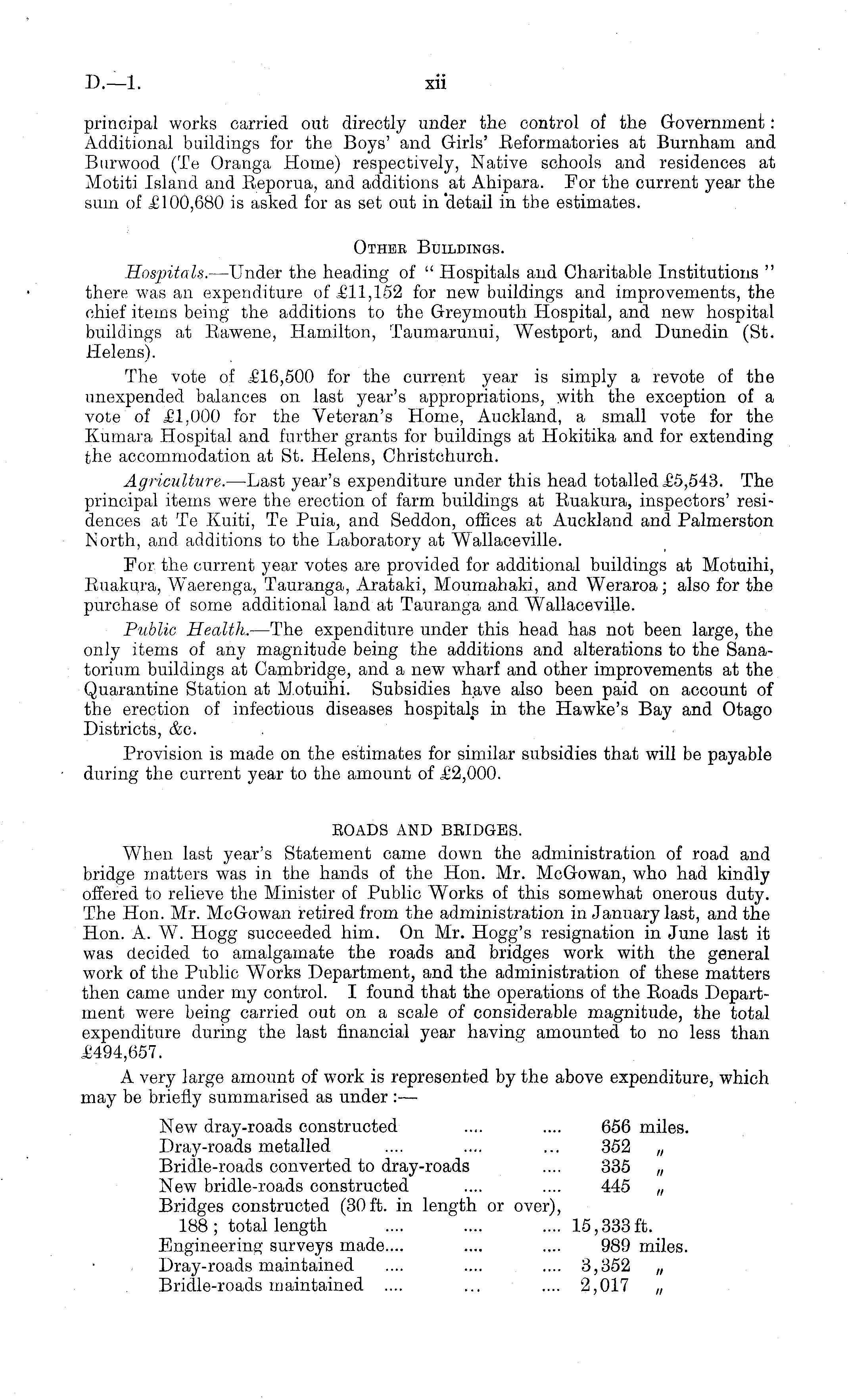 principal works carried out directly under the control of the Government: Additional buildings for the Boys' and Girls' Reformatories at Burnham and Burwood (Te Oranga Home) respectively, Native schools and residences at Motiti Island and Reporua, and additions at Ahipara. For the current year the sum of £100,680 is asked for as set out in 'detail in the estimates. Other Buildings. Hospitals. —Under the heading of " Hospitals and Charitable Institutions " there was an expenditure of £11,152 for new buildings and improvements, the chief items being the additions to the Greymouth Hospital, and new hospital buildings at Rawene, Hamilton, Taumarunui, Westport, and Dunedin (St. Helens). The vote of £16,500 for the current year is simply a revote of the unexpended balances on last year's appropriations, with the exception of a vote of £1,000 for the Veteran's Home, Auckland, a small vote for the Kumara Hospital and further grants for buildings at Hokitika and for extending the accommodation at St. Helens, Christchurch. Agriculture. —Last year's expenditure under this head totalled £5,543. The principal items were the erection of farm buildings at Ruakura, inspectors' residences at Te Kuiti, Te Puia, and Seddon, offices at Auckland and Palmerston North, and additions to the Laboratory at Wallaceville. For the current year votes are provided for additional buildings at Motuihi, Ruakura, Waerenga, Tauranga, Arataki, Moumahaki, and Weraroa; also for the purchase of some additional land at Tauranga and Wallaceville. Public Health. —The expenditure under this head has not been large, the only items of any magnitude being the additions and alterations to the Sanatorium buildings at Cambridge, and a new wharf and other improvements at the Quarantine Station at Motuihi. Subsidies have also been paid on account of the erection of infectious diseases hospitals in the Hawke's Bay and Otago Districts, &c. Provision is made on the estimates for similar subsidies that will be payable during the current year to the amount of £2,000. BOADS AND BEIDGES. When last year's Statement came down the administration of road and bridge matters was in the hands of the Hon. Mr. McGowan, who had kindly offered to relieve the Minister of Public Works of this somewhat onerous duty. The Hon. Mr. McGowan retired from the administration in January last, and the Hon. A. W. Hogg succeeded him. On Mr. Hogg's resignation in June last it was decided to amalgamate the roads and bridges work with the general work of the Public Works Department, and the administration of these matters then came under my control. I found that the operations of the Roads Department were being carried out on a scale of considerable magnitude, the total expenditure during the last financial year having amounted to no less than £494,657. A very large amount of work is represented by the above expenditure, which may be briefly summarised as under :— New dray-roads constructed .... .... 656 miles. Dray-roads metalled .... .... ... 352 „ Bridle-roads converted to dray-roads .... 335 „ New bridle-roads constructed .... .... 445 „ Bridges constructed (30 ft. in length or over), 188; total length .... .... ....15,333ft. Engineering surveys made.... .... .... 989 miles. Dray-roads maintained .... .... .... 3,352 „ Bridle-roads maintained .... ... .... 2,017 „