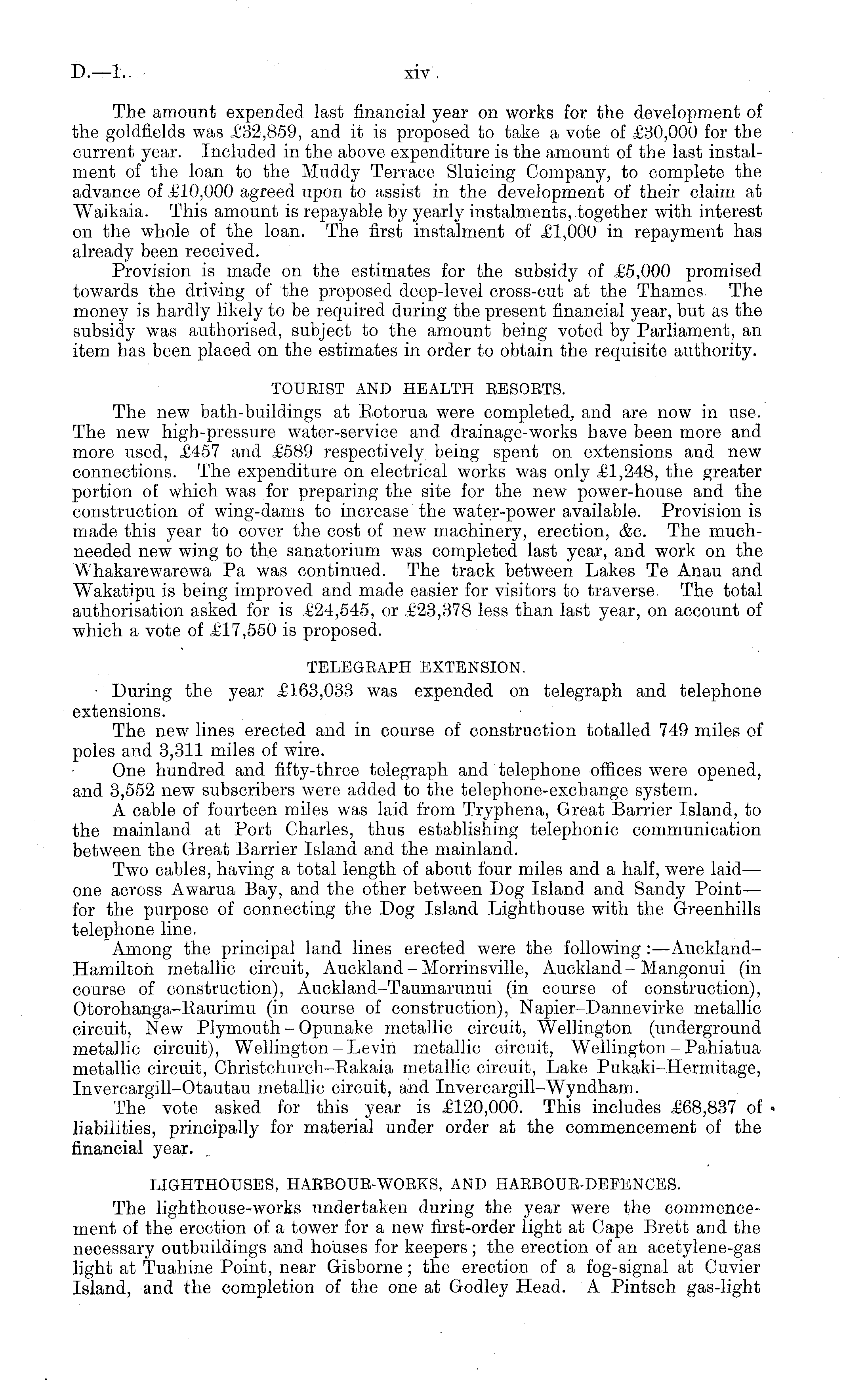 The amount expended last financial year on works for the development of the goldfields was £32,859, and it is proposed to take a vote of £30,000 for the current year. Included in the above expenditure is the amount of the last instalment of the loan to the Muddy Terrace Sluicing Company, to complete the advance of £10,000 agreed upon to assist in the development of their claim at Waikaia. This amount is repayable by yearly instalments, together with interest on the whole of the loan. The first instalment of £1,000 in repayment has already been received. Provision is made on the estimates for the subsidy of £5,000 promised towards the driving of the proposed deep-level cross-cut at the Thames, The money is hardly likely to be required during the present financial year, but as the subsidy was authorised, subject to the amount being voted by Parliament, an item has been placed on the estimates in order to obtain the requisite authority. TOUEIST AND HEALTH BESOBTS. The new bath-buildings at Rotorua were completed, and are now in use. The new high-pressure water-service and drainage-works have been more and more used, £457 and £589 respectively being spent on extensions and new connections. The expenditure on electrical works was only £1,248, the greater portion of which was for preparing the site for the new power-house and the construction of wing-dams to increase the water-power available. Provision is made this year to cover the cost of new machinery, erection, &c. The muchneeded new wing to the sanatorium was completed last year, and work on the Whakarewarewa Pa was continued. The track between Lakes Te Anau and Wakatipu is being improved and made easier for visitors to traverse. The total authorisation asked for is £24,545, or £23,378 less than last year, on account of which a vote of £17,550 is proposed. TELEGBAPH EXTENSION. During the year £163,033 was expended on telegraph and telephone extensions. The new lines erected and in course of construction totalled 749 miles of poles and 3,311 miles of wire. One hundred and fifty-three telegraph and telephone offices were opened, and 3,552 new subscribers were added to the telephone-exchange system. A cable of fourteen miles was laid from Tryphena, Great Barrier Island, to the mainland at Port Charles, thus establishing telephonic communication between the Great Barrier Island and the mainland. Two cables, having a total length of about four miles and a half, were laid— one across Awarua Bay, and the other between Dog Island and Sandy Point— for the purpose of connecting the Dog Island Lighthouse with the Greenhills telephone line. Among the principal land lines erected were the following : —AucklandHamilton metallic circuit, Auckland - Morrinsville, Auckland - Mangonui (in course of construction), Auckland-Taumarunui (in course of construction), Otorohanga-Raurimu (in course of construction), Napier-Dannevirke metallic circuit, New Plymouth - Opunake metallic circuit, Wellington (underground metallic circuit), Wellington - Levin metallic circuit, Wellington - Pahiatua metallic circuit, Christchurch-Rakaia metallic circuit, Lake Pukaki-Hermitage, Invercargill-Otautau metallic circuit, and Invercargill-Wyndham. The vote asked for this year is £120,000. This includes £68,837 of liabilities, principally for material under order at the commencement of the financial year. LIGHTHOUSES, HABBOUB-WOBKS, AND HABBOUB-DEFENCES. The lighthouse-works undertaken during the year were the commencement of the erection of a tower for a new first-order light at Cape Brett and the necessary outbuildings and houses for keepers; the erection of an acetylene-gas light at Tuahine Point, near Gisborne; the erection of a fog-signal at Cuvier Island, and the completion of the one at Godley Head. A Pintsch gas-light