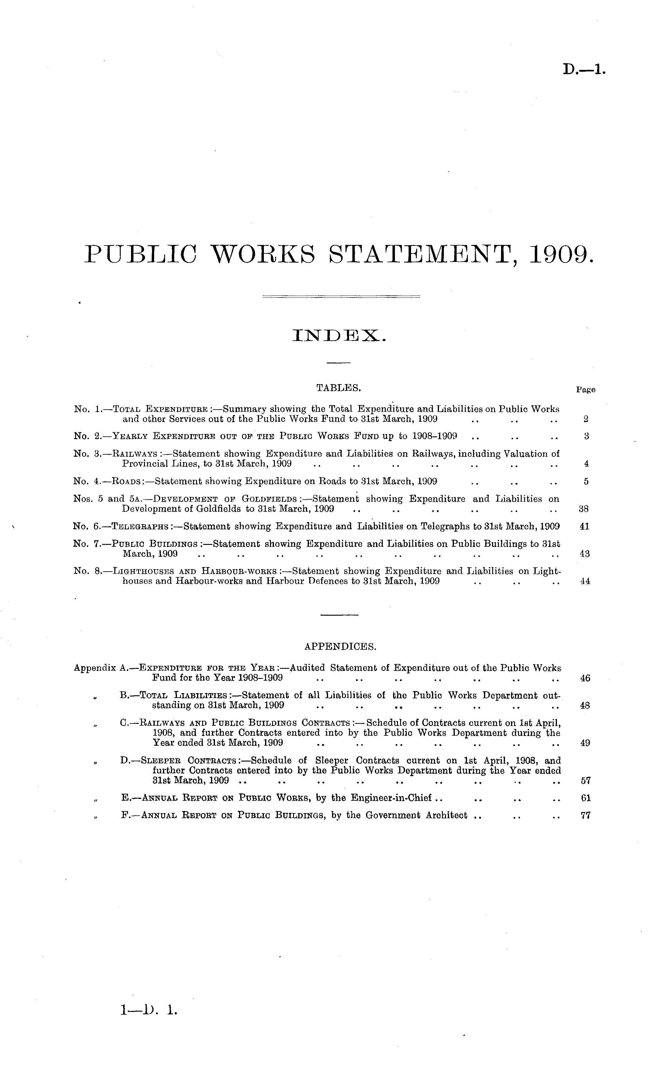 TABLES. Page No. 1, —Total Expenditure:—Summary showing the Total Expenditure and Liabilities on Public Works and other Services out of the Public Works Eund to 31st March, 1909 .. .. .. 2 No. 2.—Yearly. Expenditure out of the Public Works Eund up to 1908-1909 .. .. .. 3 No. 3.—Railways : —Statement showing Expenditure and Liabilities on Railways, including Valuation of Provincial Lines, to 31st March, 1909 .. .. .. .. .. .. .. 4 No. 4.—Roads : —Statement showing Expenditure on Roads to 31st March, 1909 .. .. .. 5 Nos. 5 and sa.—Development of Goldfields : —Statement showing Expenditure and Liabilities on Development of Goldfields to 31st March, 1909 .. .. .. .. .. .. 38 No. 6. —Telegraphs:—Statement showing Expenditure and Liabilities on Telegraphs to 31st March, 1909 41 No. 7. —Public Buildings :—Statement showing Expenditure and Liabilities on Public Buildings to 31st March, 1909 .. .. .. .. .. .. .. .. .. .. 43 No. B.—Lighthouses and Harbour-works : —Statement showing Expenditure and Liabilities on Lighthouses and Harbour-works and Harbour Defences to 31st March, 1909 .. .. .. 44 APPENDICES. Appendix A.—Expenditure for the Year : —Audited Statement of Expenditure out of the Public Works Fund for the Year 1908-1909 .. .. .. .. .. .. .. 46 „ B.—Total Liabilities : —Statement of all Liabilities of the Public Works Department outstanding on 31st March, 1909 .. .. .. .. .. .. .. 48 C —Railways and Public Buildings Contracts: —Schedule of Contracts current on Ist April, 1908, and further Contracts entered into by the Public Works Department during the Year ended 31st March, 1909 .. .. .. .. .. .. .. 49 D. —Sleeper Contracts: —Schedule of Sleeper Contracts current on Ist April, 1908, and further Contracts entered into by the Public Works Department during the Year ended 31st Maroh, 1909 .. .. .. .. .. .. .. .. .. 57 E. —Annual Report on Public Works, by the Engineer-in-Chief .. .. .. .. 61 F.—Annual Report on Public Buildings, by the Government Architect .. .. .. 77