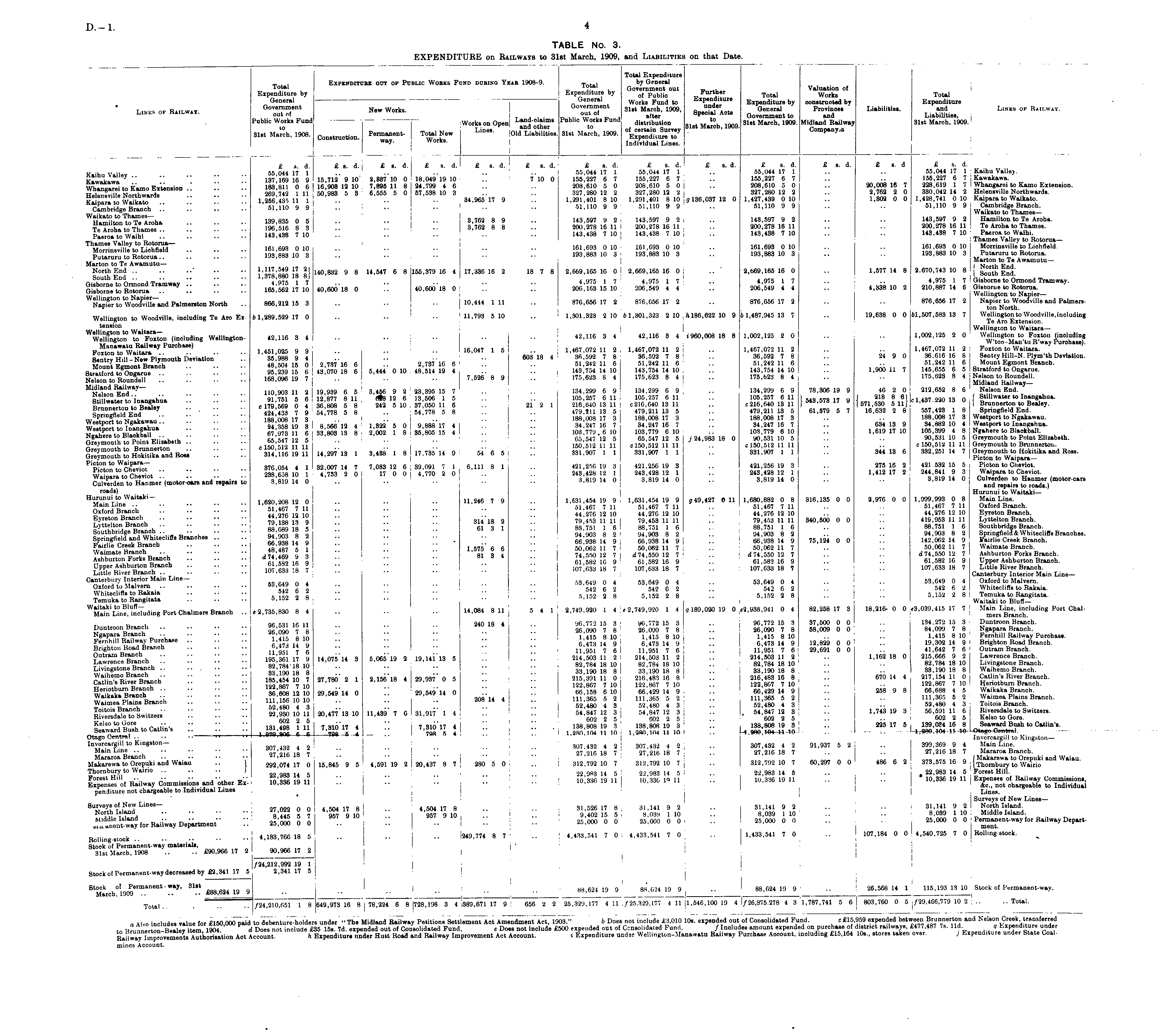 • Lines of Railway. Total Expenditure by General Government out of Public Works Fund to 31st March, 1908. Works Fund to — r . Expenditure by constructed by New Works. G< 7u?S 31st March, 1909, G G^ Uo iWorksonOperj Luri-claims Public Works Fund dist^ r tion '°. - qm Midlano^Railwaj x> Tuxr Lines. n oi mi i, ionc of certain Survey 31st March ' 1909 - Company.a Construction. Works'" Liabilities. 31st March, 1909. Expendilure J • *"*'" " Individual Lines. Expenditure out op Public Works Fund during Year 1908-9. Total Expenditure by General Government out of Public Works Fund to 31st March, 1909. Total Expenditure by General Government out of Public Works Fund to 31st March, 1909, after distribution of certain Survey Expenditure to Individual Lines. Further Expenditure under Special Acts to 31st March, 1909. Total Expenditure by General Government to 31st March, 1909. Valuation of Works constructed by Provinces and Midland Railway Company.a Liabilities. Total Expenditure and Lines ok Railway. Liabilities, 31st March, 1909. Kaihu Valley Kawakawa Whangarei to Kamo Extension Helensville Northwards Kaipara to Waikato Cambridge Branch Waikato to Thames — Hamilton to Te Aroha Te Aroha to Thames Paeroa to Waihi Thames Valley to Rotorua — Morrinsville to Lichfield Putaruru to Rotorua Marton to Te Awamutu— North End .. South End Gisborne to Ormond Tramway Gisborne to Rotorua Wellington to Napier— Napier to Woodville and Palmerston North £ s. d. 55,044 17 1 137,169 16 9 183,811 0 6 269,742 1 11 1,256,430 11 1 51,110 9 9 I I : £ s. d. £ s. d. £ s. d. I £ s. d. £ s. d. £ s. d. £ s. d. £ s. d. £ s. d. £ s. d. 55,044 17 1 55,044 17 1 .. 55,044 17 1 15,712 9 10 2,337 10 0 18,049 19 10 I .. 7 10 0 155,227 6 7 155,227 6 7 .. 155,227 6 7 16 903 12 10 7,895 11 8 24,799 4 6 .. .. 208,610 5 0 208,610 5 0 1 .. 208,610 5 0 50 983 5 3 6,555 5 0 57,538 10 8 .. .. 327,280 12 2 327,280 12 2 . 327,280 12 2 34,965 17 9 .. 1,291,401 8 10 1,291,401 8 10 \g 136,037 12 0 1,427,439 0 10 51,110 9 9 ! 51,110 9 9 ! .. 51,110 9 9 £ s. d 20,008 16 7 2,762 2 0 1,302 0 0 £ s. d. 55,044 17 1 Kaihu Valley. 155,227 6 7 Kawakawa. 228,619 1 7 Whangarei to Kamo Extension. 330,042 14 2 i Helensville Northwards. 1,428,741 0 10 Kaipara to Waikato. 51,110 9 9 Cambridge Branch. Waikato to Thames— 143,597 9 2 Hamilton to Te Aroha. 200,278 16 11 Te Aroha to Thamss. 143,438 7 10 Paeroa to Waihi. Thames Valley to Rotorua— 161,693 0 10 Morrinsville to Lichfleld. 193,883 10 3 Putaruru to Botorua. Marton to Te Awamutu — a f. m 7<l q 1n o ( North End. 2.670, (43 10 8 | gouth End 4,975 1 7 Gisborne to Ormond Tramway. 210,887 14 6 Gisborue to Rotorua. J Wellington to Napier— 876,656 17 2 Napier to Woodville and Palmerston North. 61,507,583 13 7 Wellington to Woodville, including Te Aro Extension. Wellington to Waitara— 1,002,125 2 0 Wellington to Foxton (including W'ton-Man'tu R'way Purchase). 1,467,072 11 2 I Foxton to Waitara. 36,616 16 8 i Sentry Hill-N.Plym'th Deviation. 51,242 11 6 ! Mount Egmont Branch. 145,655 6 5 I Stratford to Ongarue. 175,623 8 4 Nelson to Roundell. Midland Railway— 212,652 8 6 Nelson End. , ..,„ oon ,„ n ( Stilhvater to Inangahua. c 1,437.220 13 0 | Brunnerton to Bealey. 557,423 1 8 Springfield End. 188,008 17 3 Westport to Ngakawau. 34,882 10 4 Westport to Inangahua. 105,399 4 8 j Ngahere to Blackball. 90,531 10 5 I Greymouth to Point Elizabeth, c 150,512 11 11 : Greymouth to Brunnerton. 332,251 14 7 Greymouth to Hokitika and Ross. Picton to Waipara— 421:532 15 5 | Picton to Cheviot. 244,841 9 3 Waipara to Cheviot. 3,819 14 0 Culverden to Hanmer (motor-cars and repairs to roads.) Hurunui to Waitaki— 1,999,993 0 8 Main Line. 51,467 7 11 Oxford Branch. 44,276 12 10 Eyreton Branch. 419,953 11 11 Lyttelton Branch. 88,751 1 6 Southbridge Branch. 94,903 8 2 Springfield & Whitecliffs Branches. 142,062 14 9 Fairlie Creek Branch. 50,062 11 7 Waimate Branch. d 74,550 12 7 Ashburton Forks Branch. 61,582 16 9 Upper Ashburton Branch. 107,633 18 7 Little River Branch. Canterbury Interior Main Line— 53,649 0 4 Oxford to Malvern. 542 6 2 Whitecliffs to Rakaia. 5,102 i 8 Temuka to Rangitata. Waitaki to Bluff— e3,039,415 17 7 Main Line, including Port Chalmers Branch. 134,272 15 3 Duntroon Branch. 84,099 7 8 Ngapara Branch. 1,415 8 10 Fernhill Railway Purchase. 19,302 14 9 Brighton Road Branch. 41,642 7 6 Outram Branch. 215,666 9 2 Lawrence Branch. 82,784 18 10 ! Livingstone Branch. 33,190 18 8 I Waihemo Branch. , 217,154 11 0 Catlin's River Branch. 122,867 7 10 Heriotburn Branch. 66,688 4 5 Waikaka Branch. 111,365 5 2 Waimea Plains Branch. 52,480 4 3 Toitois Branch. 56,59111 6 Riversdale to Switzers. 602 2 5 Kelso to Gore. 139,034 16 8 Seaward Bush to Catlin'a. 1,980,104 -» 46 Central . Invercargill to Kingston— 399,369 9 4 i Main Line. 27,216 18 7 Mararoa Branch. „_„ ,,-_ .„ „ J Makarewa to Orepuki and Waiau. 373,515 16 9 j Thornbury to Wairio. 22,983 14 5 Forest Hill. * 10,336 19 11 Expenses of Railway Commissions, &c, not chargeable to Individual Lines. Surveys of New Lines— 31,141 9 2 North Island. 8,039 1 10 Middle Island. 25,000 0 0 Permanent-way for Railway Depart- : ment. 4,540,725 7 0 Rolling-stock. 139,835 0 5 196,516 8 3 143,438 7 10 161,693 0 10 193,883 10 3 1,117,549 17 21 1,378,880 18 8f 4,975 1 7 165,562 17 10 3,762 8 9 .. 143,597 9 2 ' 143,597 9 2 .. 143,597 9 2 3,762 8 8 .. 200,278 16 11 200,278 16 11 .. 200,278 16 11 143,438 7 10 143,438 7 10 .. 143,488 7 10 161,693 0 10 161,693 0 10 .. 161,693 0 10 ., .. .. .. .. 193,883 10 3 193,883 10 3 .. 193,883 10 3 140,832 9 8 14,547 6 8 155,379 16 4 17,336 16 2 18 7 8 2,669,165 16 0 2,669,165 16 0 .. 2,669,165 16 0 4,975 1 7 4,975 17 .. 4,975 17 40,600 18 0 .. 40,600 18 0 .. .. 206,163 15 10 206,549 4 4 .. 206,549 4 4 10,444 1 11 .. 876,656 17 2 876,656 17 2 j .. 876,656 17 2 11,793 5 10 .. 1,301,323 2 10 61,301,323 2 10 , ft 186,622 10 9 61,487,945 13 7 1,577 14 8 4,338 10 2 866,212 15 3 Wellington to Woodville, incl