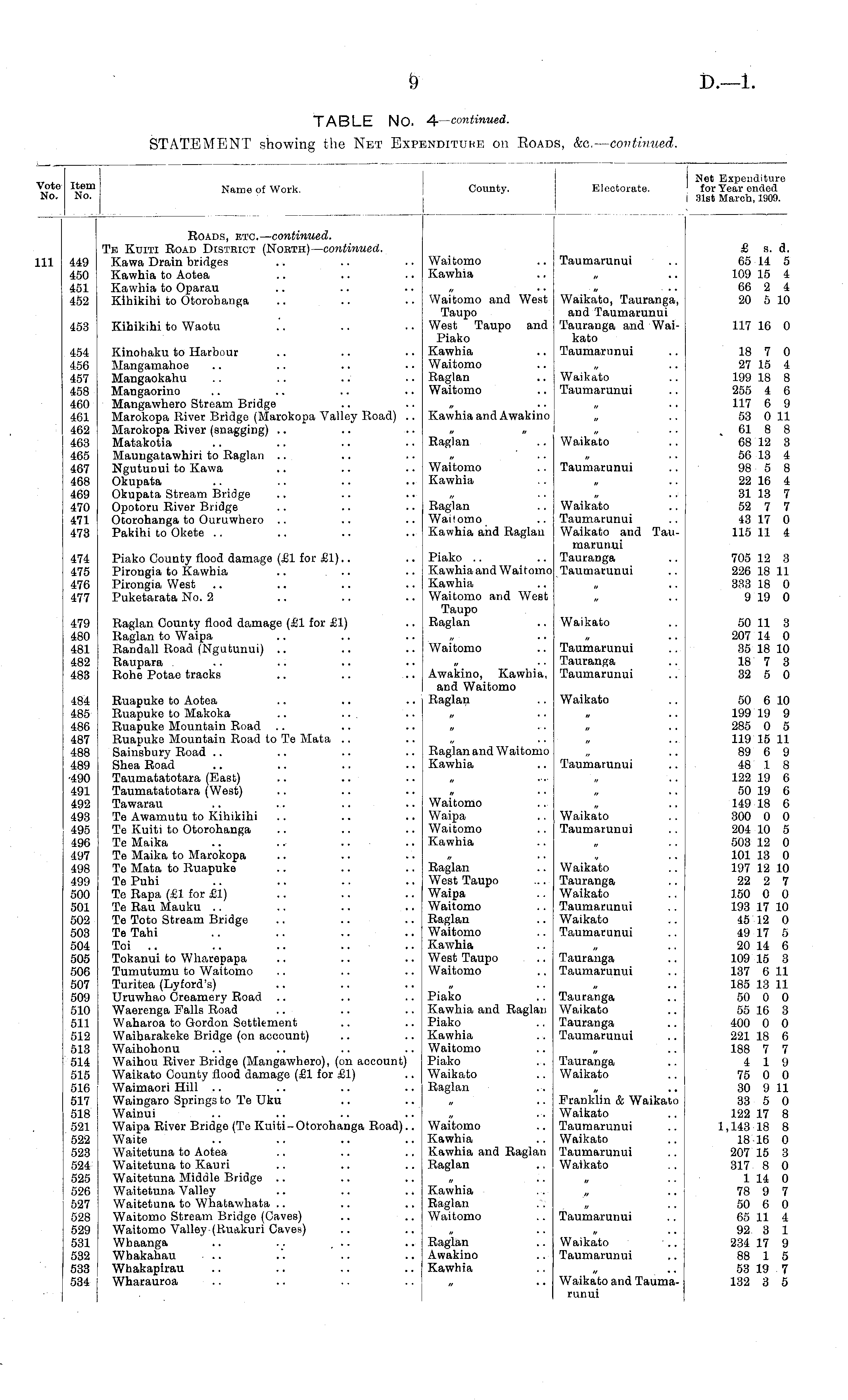 Vote Item No. No. Name of Work. County. Electorate. Net Expenditure 1 for Year ended I 31st March, 1909. 11 449 450 451 452 Roads, etc. — continued. Te Kuiti Road District (North) — continued. Kawa Drain bridges Kawhia to Aotea Kawhia to Oparau Kihikihi to Otorohanga Waitomo Kawhia Taumarunui £ s. d 65 14 £ £ s. d. 65 14 5 109 15 4 66 2 4 20 5 10 109 15 4 453 454 456 457 458 460 461 462 463 465 467 468 469 470 471 473 Kihikihi to Waotu Kinohaku to Harbour Mangamahoe Mangaokahu Mangaorino Mangawhero Stream Bridge Marokopa River Bridge (Marokopa Valley Road) .. Marokopa River (snagging) Matakotia Maungatawhiri to Raglan Ngutunui to Kawa Okupata Okupata Stream Bridge Opotoru River Bridge Otorohanga to Ouruwhero Pakihi to Okete Waitomo and West Taupo West Taupo and Piako Kawhia Waitomo Raglan Waitomo Waikato, Tauranga, j and Taumarunui Tauranga and Waikato Taumarunui 66 2 4 20 5 1C 117 16 ( 18 7 ( 117 16 0 18 7 0 27 15 4 199 18 8 255 4 6 117 6 9 53 0 11 61 8 8 68 12 3 56 13 4 98 5 8 22 16 4 31 13 7 52 7 7 43 17 0 115 11 4 Waikato Taumarunui 27 15 4 199 18 e 255 4 t Kawhia and Awakino 117 6 i Raglan i, Waikato 61 8 8 68 12 i Waitomo Kawhia Taumarunui 56 13 4 98 5 i 22 16 4 Raglan Waitomo Kawhia and Raglan Waikato Taumarunui Waikato and Taumarunui Tauranga Taumarunui 31 13 7 52 7 7 43 17 C 115 11 4 705 12 i 226 18 11 30 0 io r 474 475 476 477 Piako County flood damage (£1 for £1) Pirongia to Kawhia Pirongia West Puketarata No. 2 Piako Kawhia and Waitomo Kawhia Waitomo and West Taupo Raglan 705 12 3 226 18 11 333 18 0 9 19 0 333 18 C 9 19 C 479 480 481 482 483 Raglan County flood damage (£1 for £1) Raglan to Waipa Randall Road (Ngutunui) Raupara Rone Potae tracks Waitomo Waikato Taumarunui Tauranga Taumarunui 50 11 c 207 14 C 35 18 1C 18 7 i 32 5 C 50 11 3 207 14 0 35 18 10 18 7 3 32 5 0 Awakino, Kawhia, and Waitomo Raglan 484 485 486 487 488 489 ■490 491 492 493 495 496 497 498 499 500 501 502 503 504 505 506 507 509 510 511 512 513 514 515 516 517 518 521 522 523 524 525 526 527 528 529 531 532 533 534 Ruapuke to Aotea Ruapuke to Makoka Ruapuke Mountain Road Ruapuke Mountain Road to Te Mata Sainsbury Road Shea Road Taumatatotara (East) Taumatatotara (West) Tawarau Te Awamutu to Kihikihi Te Kuiti to Otorohanga Te Maika Te Maika to Marokopa Te Mata to Ruapuke Te Puhi Te Rapa (£1 for £1) Te Rau Mauku Te Toto Stream Bridge Te Tahi Toi .. Tokanui to Wharepapa Tumutumu to Waitomo Turitea (Lyford's) Uruwhao Creamery Road Waerenga Falls Road Waharoa to Gordon Settltment Waiharakeke Bridge (on account) Waihohonu Waihou River Bridge (Mangawhero), (on account) Waikato County flood damage (£1 for £1) Waimaori Hill Waingaro Springs to Te Uku Wainui Waipa River Bridge (Te Kuiti-Otorohanga Road).. Waite Waitetuna to Aotea Waitetuna to Kauri Waitetuna Middle Bridge Waitetuna Valley Waitetuna to Whatawhata Waitomo Stream Bridge (Caves) Waitomo Valley (Ruakuri Caves) Whaanga .. ._. ... Whakahau Whakapirau Wharauroa Raglan and Waitomo Kawhia Waitomo Waipa Waitomo Kawhia Raglan West Taupo Waipa Waitomo Raglan Waitomo Kawhia West Taupo Waitomo Piako Kawhia and Raglan Piako Kawhia Waitomo Piako Waikato Raglan Waikato Taumarunui Waikato Taumarunui Waikato Tauranga Waikato Taumarunui Waikato Taumarunui Tauranga Taumarunui Tauranga Waikato Tauranga Taumarunui 50 6 1C 199 19 i 285 0 £ 119 15 11 89 6 £ 48 1 6 122 19 t 50 19 e 149 18 £ 300 0 C 204 10 E 503 12 C 101 13 C 197 12 1C 22 2 7 150 0 0 193 17 10 45 12 0 49 17 5 20 14 6 109 15 3 137 6 11 185 13 11 50 0 0 55 16 3 400 0 0 221 18 6 50 6 10 199 19 9 285 0 5 119 15 11 89 6 9 48 1 8 122 19 6 50 19 6 149 18 6 300 0 0 204 10 5 503 12 0 101 13 0 197 12 10 22 2 7 150 0 0 193 17 10 45 12 0 49 17 5 20 14 6 109 15 3 137 6 11 185 13 11 50 0 0 55 16 3 400 0 0 221 18 6 188 7 7 4 19 75 0 0 30 9 11 33 5 0 122 17 8 1,143 18 8 18 16 0 207 15 3 317 8 0 1 14 0 78 9 7 50 6 0 65 11 4 92 3 1 234 17 9 88 1 5 53 19 7 132 3 5 Tauranga Waikato 188 7 7 4 19 75 0 C Waitomo Kawhia Kawhia and Raglan Raglan Franklin & Waikato Waikato Taumarunui Waikato Taumarunui Waikato 30 9 11 33 5 0 122 17 8 1,143 18 8 18 16 0 207 15 3 317 8 0 Kawhia Raglan Waitomo 1 14 0 78 9 7 Taumarunui 50 6 0 65 11 4 Raglan Awakino Kawhia Waikato Taumarunui 92 3 1 234 17 9 88 1 5 Waikato and Taumarunui 53 19 7 132 3 5