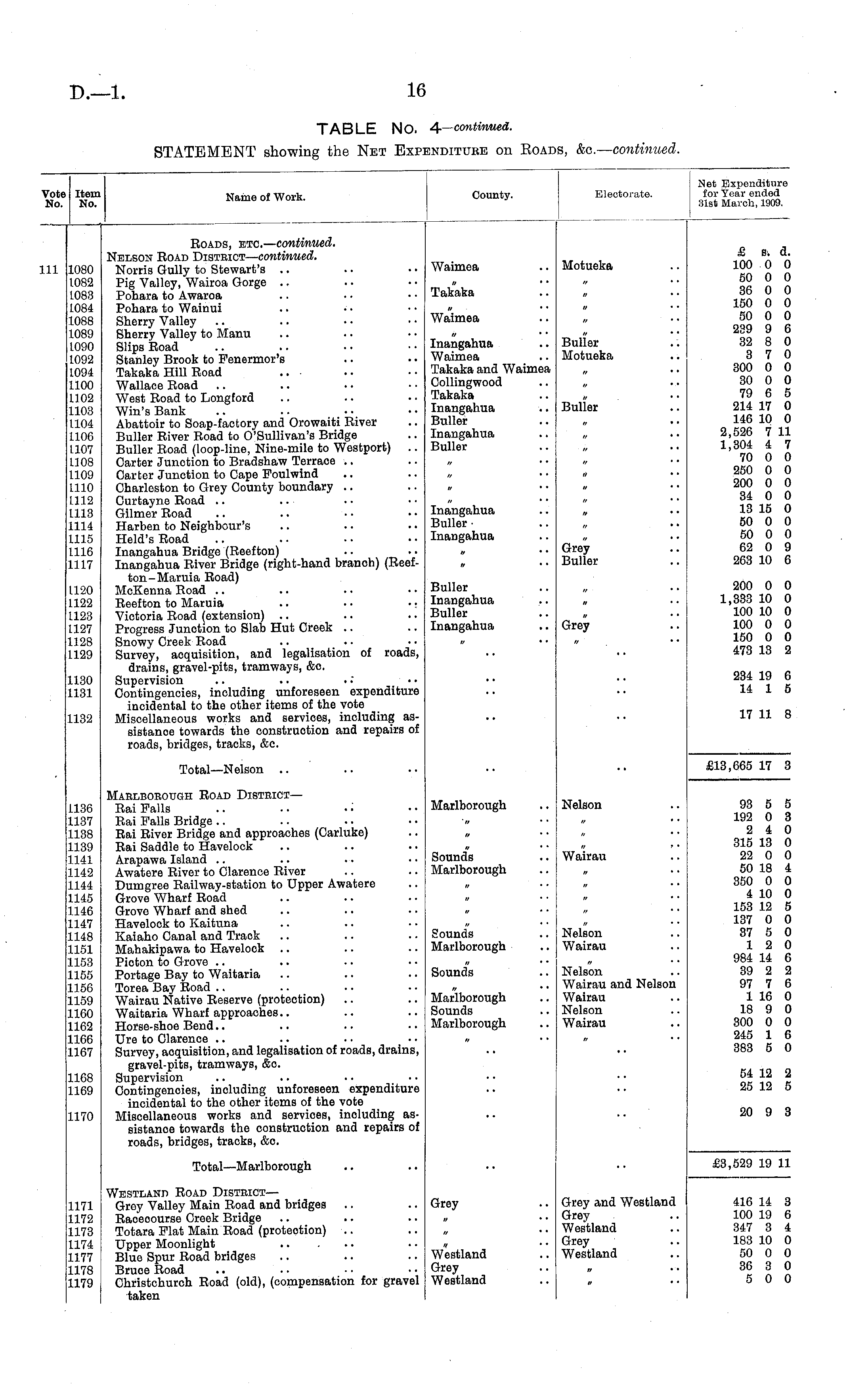 Vote Item No. No. Name of Work. County. Electorate. Net Expenditure for Year ended 31st March, 1909. 11 1080 1082 1083 L084 1088 1089 1090 1092 1094 1100 1102 1103 1104 1106 1107 1108 1109 1110 1112 1113 1114 1115 1116 1117 Roads, etc. — continued. Nelson Road District — continued. Norris Gully to Stewart's Pig Valley, Wairoa Gorge Pohara to Awaroa Pohara to Wainui Sherry Valley Sherry Valley to Manu Slips Road Stanley Brook to Fenermor's Takaka Hill Road Wallace Road West Road to Longford Win's Bank Abattoir to Soap-factory and Orowaiti River Buller River Road to O'Sullivan's Bridge Buller Road (loop-line, Nine-mile to Westport) .. Carter Junction to Bradshaw Terrace Carter Junction to Cape Foulwind Charleston to Grey County boundary Curtayne Road Gilmer Road Harben to Neighbour's Hold's Road Inangahua Bridge (Reefton) Inangahua River Bridge (right-hand branoh) (Reef-ton-Maruia Road) McKenna Road Reefton to Maruia .. • • •: Victoria Road (extension) Progress Junction to Slab Hut Creek Snowy Creek Road Survey, acquisition, and legalisation of roads, drains, gravel-pits, tramways, &o. Supervision Contingencies, including unforeseen expenditure incidental to the other items of the vote Miscellaneous works and servioes, including asBistanoe towards the construction and repairs of roads, bridges, tracks, &c. Waimea Takaka Waimea Inangahua Waimea Takaka and Waimea Collingwood Takaka Inangahua Buller Inangahua Buller Inangahua Buller • Inangahua Motueka » • • Buller Motueka Buller £ Eg a. 100 0 0 50 0 0 36 0 0 150 0 0 SO 0 0 239 9 6 32 8 0 3 7 0 300 0 0 30 0 0 79 6 5 214 17 0 146 10 0 2,526 7 11 1,304 4 7 70 0 0 250 0 0 200 0 0 34 0 0 13 15 0 50 0 0 50 0 0 62 0 9 263 10 6 Grey Buller ./ • • 1120 1122 1123 1127 1128 1129 Buller Inangahua Buller Inangahua 200 0 0 1,333 10 0 100 10 0 100 0 0 150 0 0 473 13 2 Grey 1130 1131 234 19 6 14 1 5 1132 17 11 8 Total—Nelson £13,665 17 3 1136 1137 1138 1139 1141 1142 1144 1145 1146 1147 1148 1151 1153 1155 1156 1159 1160 1162 1166 1167 Marlborough Road District— Rai Falls .. .. • • Rai Falls Bridge Rai River Bridge and approaches (Carluke) Rai Saddle to Havelock Arapawa Island Awatere River to Clarence River Dumgree Railway-station to Upper Awatere Grove Wharf Road Grove Wharf and shed Havelock to Kaituna Kaiaho Canal and Traok Mahakipawa to Havelock Pioton to Grove Portage Bay to Waitaria Torea Bay Road Wairau Native Reserve (protection) Waitaria Wharf approaches.. Horse-shoe Bend.. Ure to Clarence .. .. .. Survey, acquisition, ana legalisation of roads, drains, gravel-pits, tramways, &o. Supervision Contingencies, inoluding unforeseen expenditure incidental to the other items of the vote Miscellaneous works and servioes, inoluding assistance towar3s the construction ana repairs of roads, bridges, tracks, &c. Marlborough Sounds Marlborough Sounds Marlborough Sounds Nelson Wairau Nelson Wairau Nelson Wairau ana Nelson Wairau Nelson Wairau 93 5 5 192 0 3 2 4 0 315 13 0 22 0 0 50 18 4 350 0 0 4 10 0 153 12 5 137 0 0 37 5 0 12 0 984 14 6 39 2 2 97 7 6 1 16 0 18 9 0 300 0 0 245 1 6 383 5 0 Marlborough Sounds Marlborough 1168 1169 54 12 2 25 12 5 1170 20 9 3 Total—Marlborough £3,529 19 11 1171 1172 1173 1174 1177 1178 1179 Westland Road District — Grey Valley Main Road and bridges Raoeoourse Creek Bridge Totara Flat Main Road (protection) Upper Moonlight Blue Spur Road bridges Bruce Roaa Christchurch Road (old), (compensation for gravel taken Grey Westland Grey Westland Grey and Westland Grey Westlana Grey Westlana 416 14 3 100 19 6 347 3 4 183 10 0 50 0 0 36 3 0 5 0 0