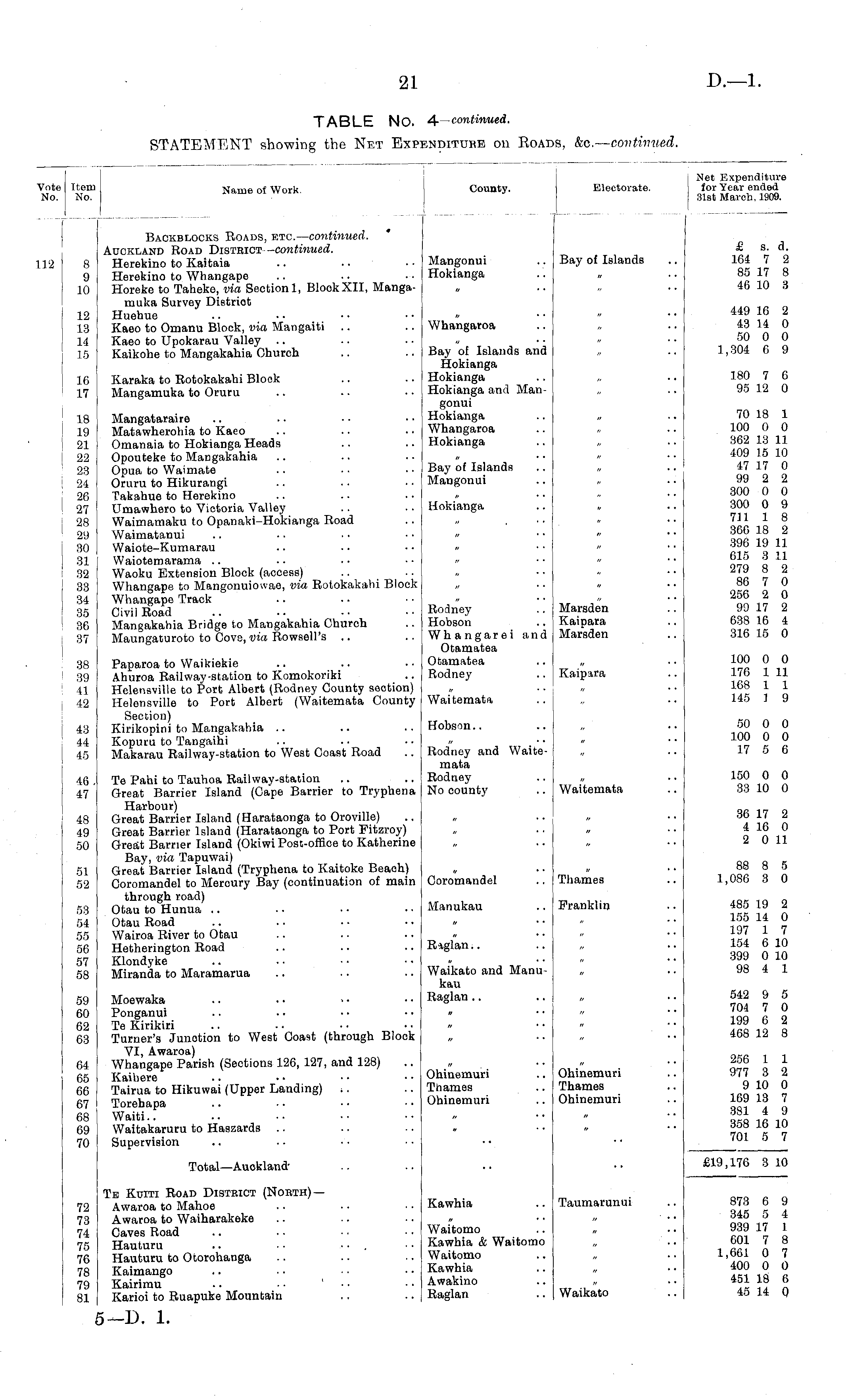 Vote No. » em Name of Work. No. County. Electorate. Net Expenditure for Year ended 31st March, 1909. 12 Backblocks Roads, etc. — continued. Auckland Road District— continued. 8 Herekino to Kaitaia 9 Herekino to Whangape 10 Horeke to Taheke, via Section 1, BlockXII, Mangamuka Survey Distriot 12 Huehue 13 Kaeo to Omanu Block, via Mangaiti 14 Kaeo to Upokarau Valley 15 Kaikohe to Mangakahia Church 8 9 10 Mangonui Hokianga Bay of Islands £ s. d. 164 7 2 85 17 8 46 10 3 12 13 14 15 Whangaroa 449 16 2 43 14 0 50 0 0 1,304 6 9 16 Karaka to Rotokakahi Blook 17 Mangamuka to Oruru 16 17 Bay of Islands and Hokianga Hokianga Hokianga and Mangonui Hokianga Whangaroa Hokianga 180 7 6 95 12 0 18 Mangataraire 19 Matawherohia to Kaeo 21 Omanaia to Hokianga Heads 22 Opouteke to Mangakahia 23 Opua to Waimate 24 Oruru to Hikurangi 26 Takahue to Herekino 27 Umawhero to Victoria Valley 28 Waimamaku to Opanaki-Hokianga Road 29 Waimatanui 30 Waiote-Kumarau 31 Waiotemarama 32 Waoku Extension Block (access) 33 Whangape to Mangonuiowae, via Rotokakahi Block 34 Whangape Track 35 Civil Road 36 Mangakahia Bridge to Mangakahia Church 37 Maungaturoto to Cove, via Rowsell's 18 19 21 22 23 24 26 27 28 29 30 31 32 33 34 35 36 37 Bay of Islands Mangonui Hokianga 70 18 1 100 0 0 362 13 11 409 15 10 47 17 0 99 2 2 300 0 0 300 0 9 711 1 8 366 18 2 396 19 11 615 3 11 279 8 2 86 7 0 256 2 0 99 17 2 638 16 4 316 15 0 Rodney Hobson Whangarei and Otamatea Otamatea Rodney Marsden Kaipara Marsden 38 Paparoa to Waikiekie 39 Ahuroa Railway-station to Komokoriki 41 Helensville to Port Albert (Rodney County section) 42 Helensville to Port Albert (Waitemata County Section) 43 Kirikopini to Mangakahia 44 Kopuru to Tangaihi 45 Makarau Railway-station to West Coast Road 38 39 41 42 Kaipara 100 0 0 176 1 11 168 1 1 145 I 9 Waitemata 43 44 45 Hobson.. Rodney and Waitemata Rodney No county 50 0 0 100 0 0 17 5 6 46 . Te Pahi to Tauhoa Railway-station 47 Great Barrier Island (Cape Barrier to Tryphena Harbour) 48 Great Barrier Island (Harataonga to Oroville) 49 Great Barrier Island (Harataonga to Port Fitzroy) 50 Great Barrier Island (Okiwi Post-office to Katherine Bay, via Tapuwai) 51 Great Barrier Island (Tryphena to Kaitoke Beaoh) 52 Ooromandel to Meroury Bay (continuation of main through road) 53 Otau to Hunua 54 Otau Road 55 Wairoa River to Otau 56 Hetherington Road 57 Klondyke 58 Miranda to Maramarua 46. 47 Waitemata 150 0 0 33 10 0 48 49 50 36 17 2 4 16 0 2 0 11 51 52 Coromandel Thames 88 8 5 1,086 3 0 53 54 55 56 57 58 Manukau Franklin 485 19 2 155 14 0 197 1 7 154 6 10 399 0 10 98 4 1 Raglan.. Waikato and Manukau Raglan 59 Moewaka 60 Ponganui 62 Te Kirikiri 63 Turner's Junotion to West Coast (through Block VI, Awaroa) 64 Whangape Parish (Sections 126, 127, and 128) 65 Kaihere 66 Tairua to Hikuwai (Upper Landing) 67 Torehapa 68 Waiti 69 Waitakaruru to Haszards 70 Supervision 59 60 62 63 542 9 5 704 7 0 199 6 2 468 12 8 64 65 66 67 68 69 70 Ohinemuri Thames Ohinemuri Ohinemuri Thames Ohinemuri 256 1 1 977 3 2 9 10 0 169 13 7 381 4 9 358 16 10 701 5 7 Total—Auckland£19,176 3 10 Te Kuiti Road District (North) — 72 Awaroa to Mahoe 73 Awaroa to Waiharakeke 74 Caves Road 75 Hauturu .. ■ • • • . 76 Hauturu to Otorohanga 78 Kaimango 79 Kairimu 81 Karioi to Ruapuke Mountain 72 73 74 75 76 78 79 81 Kawhia Waitomo Kawhia & Waitomo Waitomo Kawhia Awakino Raglan Taumarunui 873 6 9 345 5 4 939 17 1 601 7 8 1,661 0 7 400 0 0 451 18 6 45 14 Q Waikato