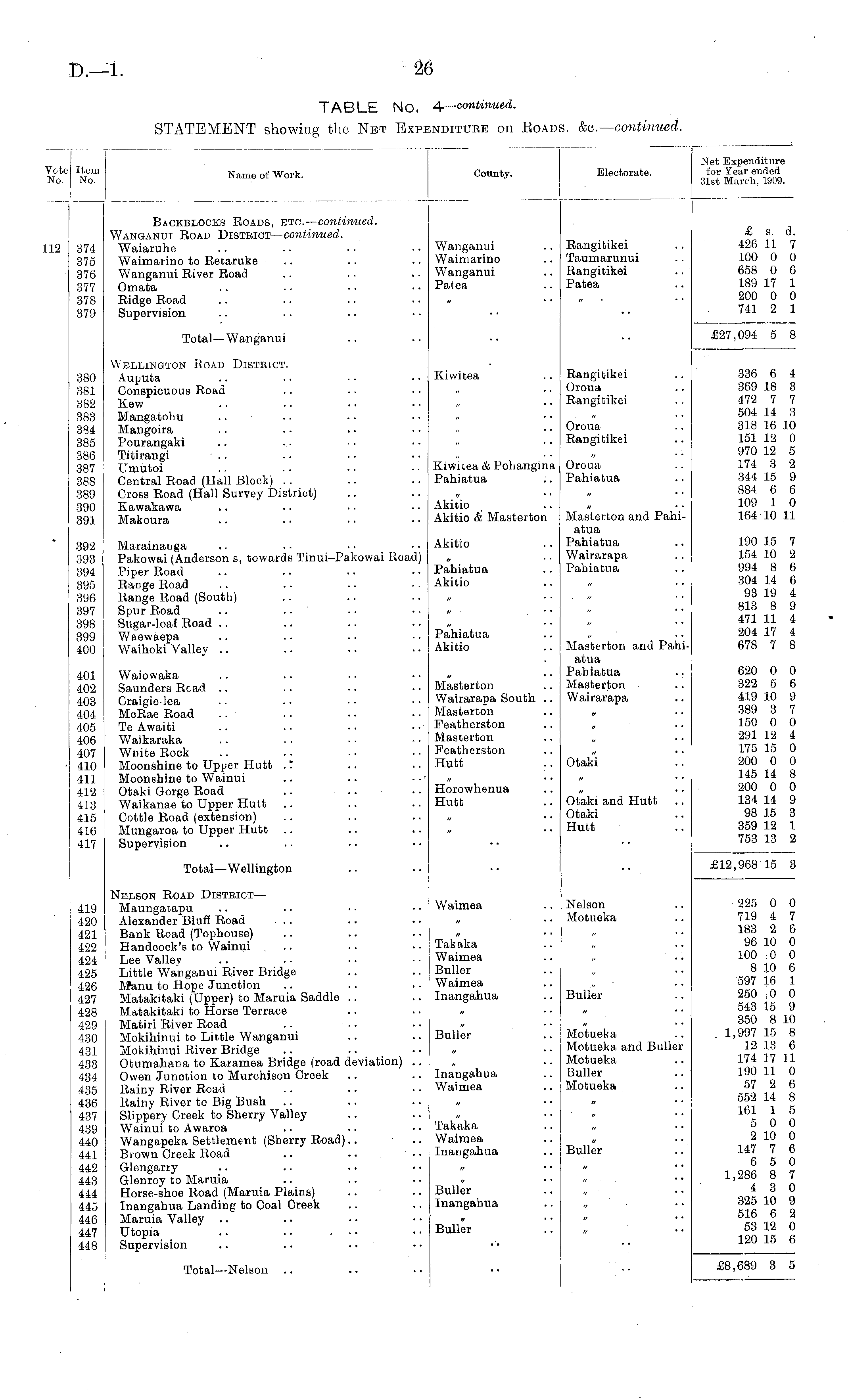 Vote No. Item No. Name of Work. County. Electorate. Net Expenditure for Year ended 31st March, 1909. 12 374 375 376 377 378 379 Backblocks Roads, etc.— continued. Wanganui Road District— continued. Waiaruhe Waimarino to Rotaruke Wanganui River Road Omata Ridge Road Supervision Wanganui Waimarino Wanganui Patea Rangitikei Taumarunui Rangitikei Patea £ s. d. 426 11 7 100 0 0 658 0 6 189 17 1 200 0 0 741 2 1 Total—Wanganui £27,094 5 8 380 381 382 383 384 385 386 387 388 389 390 391 Wellington Road District. Auputa Conspicuous Road Kew Mangatohu Mangoira Pourangaki Titirangi Umutoi Central Road (Hall Block) Cross Road (Hall Survey District) Kawakawa Makoura Kiwitea Rangitikei Oroua Rangitikei Oroua Rangitikei 336 6 4 369 18 3 472 7 7 504 14 3 318 16 10 151 12 0 970 12 5 174 3 2 344 15 9 884 6 6 109 1 0 164 10 11 Kiwnea & Pohangina Pahiatua Oroua Pahiatua Akitio Akitio & Masterton Masterton and Pahiatua Pahiatua Wairarapa Pahiatua 392 393 394 395 396 397 398 399 400 Marainauga Pakowai (Anderson s, towards Tinui-Pakowai Road) Piper Road Range Road Range Road (South) Spur Road .. Sugar-loaf Road Waewaepa Waihoki Valley Akitio 190 15 7 154 10 2 994 8 6 304 14 6 93 19 4 813 8 9 471 11 4 204 17 4 678 7 8 Pahiatua Akitio Pahiatua Akitio Masterton and Pahiatua Pahiatua Masterton Wairarapa 401 402 403 404 405 406 407 410 411 412 413 415 416 417 Waiowaka Saunders Road Craigie lea McRae Road Te Awaiti Waikaraka White Rock Moonshine to Upper Hutt .". Moonshine to Wainui Otaki Gorge Road Waikanae to Upper Hutt Cottle Road (extension) Mungaroa to Upper Hutt Supervision Masterton Wairarapa South .. Masterton Featherston Masterton Featherston Hutt Otaki 620 0 0 322 5 6 419 10 9 389 3 7 150 0 0 291 12 4 175 15 0 200 0 0 145 14 8 200 0 0 134 14 9 98 15 3 359 12 1 753 13 2 Horowhenua Hutt Otaki and Hutt Otaki Hutt Total—Wellington £12,968 15 3 419 420 421 422 424 425 426 427 428 429 430 431 433 434 435 436 437 439 440 441 442 443 444 445 446 447 448 Nelson Road District — Maungatapu Alexander Bluff Road Bank Road (Tophouse) Handcock'B to Wainui ... Lee Valley Little Wanganui River Bridge Manu to Hope Junction Matakitaki (Upper) to Maruia Saddle Matakitaki to Horse Terrace Matiri River Road Mokihinui to Little Wanganui Mokihinui River Bridge Otumahana to Karamea Bridge (road deviation) .. Owen Junotion to Murchison Creek Rainy River Road Rainy River to Big Bush Slippery Creek to Sherry Valley Wainui to Awaroa Wangapeka Settlement (Sherry Road).. Brown Creek Road .. • • Glengarry Glenroy to Maruia Horse-shoe Road (Maruia Plains) Inangahua Landing to Coal Creek Maruia Valley Utopia .. . • ... Supervision Waimea Takaka Waimea Buller Waimea Inangahua Buller Inangahua Waimea Nelson Motueka Buller Motueka Motueka and Buller Motueka Buller Motueka 225 0 0 719 4 7 183 2 6 96 10 0 100 0 0 8 10 6 597 16 1 250 0 0 543 15 9 350 8 10 1,997 15 8 12 13 6 174 17 11 190 11 0 57 2 6 552 14 8 161 1 5 5 0 0 2 10 0 147 7 6 6 5 0 1,286 8 7 4 3 0 325 10 9 516 6 2 53 12 0 120 15 6 Takaka Waimea Inangahua Buller Buller Inangahua Buller Total—Nelson £8,689 3 5