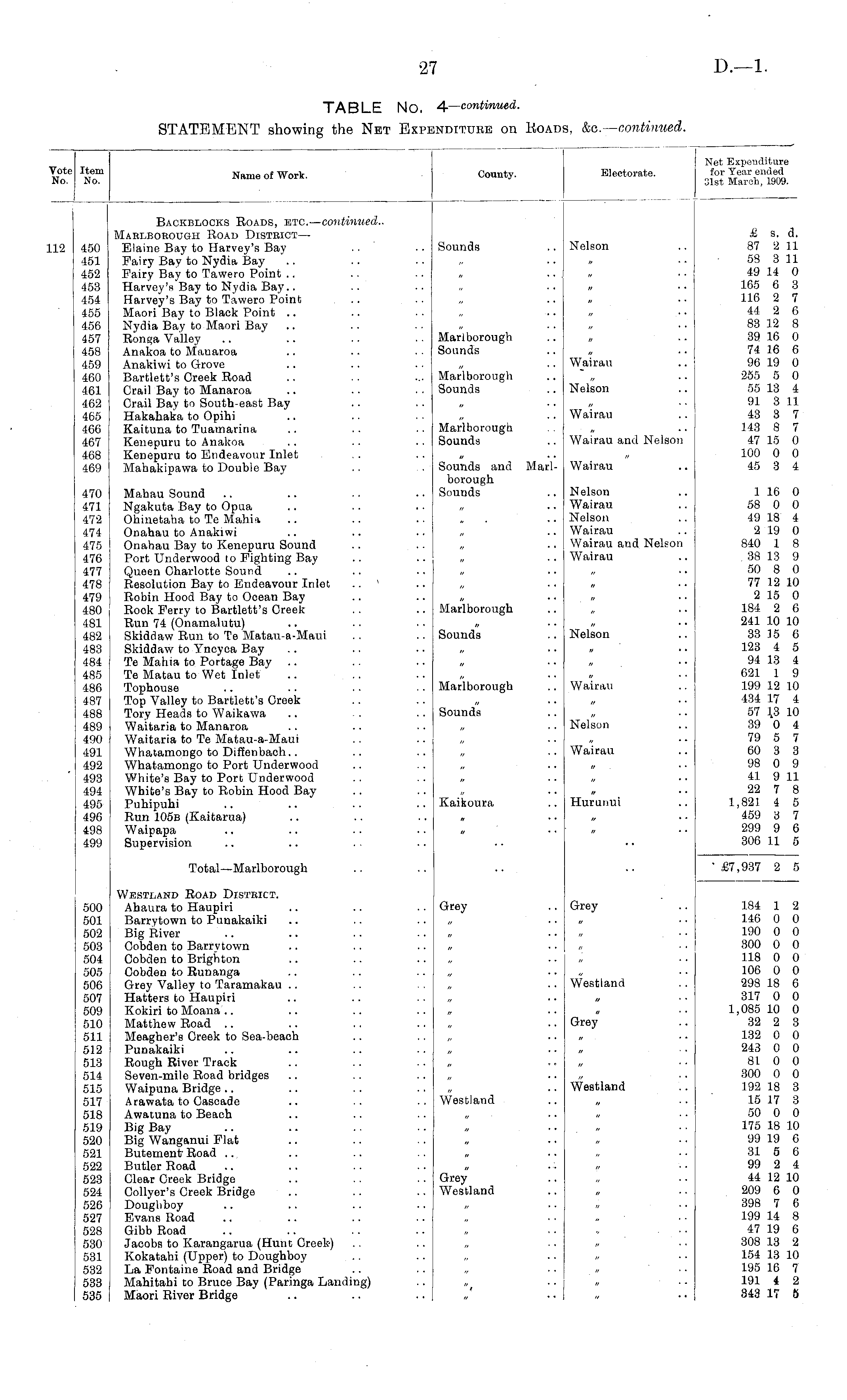 Vote Item No. No. Name of Work. County. Electorate. Net Expenditure for Year ended 31st March, 1909. .12 450 451 452 453 454 455 456 457 458 459 460 461 462 465 466 467 468 469 Backblocks Roads, etc.— continued.. Marlborough Road District— Elaine Bay to Harvey's Bay Fairy Bay to Nydia Bay Fairy Bay to Tawero Point Harvey's Bay to Nydia Bay.. Harvey's Bay to Tawero Point Maori Bay to Black Point Nydia Bay to Maori Bay Ronga Valley Anakoa to Manaroa Anakiwi to Grove Bartlett's Creek Road Crail Bay to Manaroa Crail Bay to South-east Bay Hakahaka to Opihi Kaituna to Tuamarina Kenepuru to Anakoa Kenepuru to Endeavour Inlet Mahakipawa to Double Bay Sounds Marlborough Sounds Nelson Wairau £ s. d. 87 2 11 58 3 11 49 14 0 165 6 3 116 2 7 44 2 6 83 12 8 39 16 0 74 16 6 96 19 0 255 5 0 55 13 4 91 3 11 43 3 7 143 8 7 47 15 0 100 0 0 45 3 4 Marlborough Sounds Nelson Wairau Marlborough Sounds Wairau and Nelson Sounds and Marlborough Sounds Wairau 470 471 472 474 475 476 477 478 479 480 481 482 483 484 485 486 487 488 489 490 491 492 493 494 495 496 498 499 Mahau Sound Ngakuta Bay to Opua Ohinetaha to Te Maliin. Onahau to Anakiwi Onahau Bay to Kenepuru Sound Port Underwood lo Fighting Bay Queen Charlotte Sound Resolution Bay to Endeavour Inlet Robin Hood Bay to Ocean Bay Rock Ferry to Bartlett's Creek Run 74 (Onamalutu) Skiddaw Run to Te Matau-a-Maui Skiddaw to Yncyca Bay Te Mania to Portage Bay Te Matau to Wet Inlet Tophouse Top Valley to Bartlett's Creek Tory Heads to Waikawa Waitaria to Manaroa Waitaria to Te Matau-a-Maui Whatamongo to Diffenbach.. Whatamongo to Port Underwood White's Bay to Port Underwood White's Bay to Robin Hood Bay Puhipuhi Run 105b (Kaitarua) Waipapa Supervision Marlborough Sounds Nelson Wairau Nelson Wairau Wairau and Nelson Wairau Nelson 1 10 0 58 0 0 49 18 4 2 19 0 840 1 8 38 13 9 50 8 0 77 12 10 2 15 0 184 2 6 241 10 10 33 15 6 123 4 5 94 13 4 621 1 9 199 12 10 434 17 4 57 13 10 39 0 4 79 5 7 60 3 3 98 0 9 41 9 11 22 7 8 1,821 4 5 459 3 7 299 9 6 306 11 5 Marlborough Wairau Sounds Nelson Wairau Kaikoura Hurunui Total—Marlborough • £7,937 2 5 500 501 502 503 504 505 506 507 509 510 511 512 513 514 515 517 518 519 520 521 522 523 524 526 527 528 530 531 532 533 535 Westland Road District. Ahaura to Haupiri Barrytown to Punakaiki Big River Cobden to Barrytown Cobden to Brighton Cobden to Runanga Grey Valley to Taramakau Hatters to Haupiri Kokiri to Moana Matthew Road Meagher's Creek to Sea-beach Punakaiki Rough River Track Seven-mile Road bridges Waipuna Bridge Arawata to Cascade Awatuna to Beach Big Bay Big Wanganui Flat Butement Road Butler Road Clear Creek Bridge Collyer's Creek Bridge Doughboy Evans Road Gibb Road Jacobs to Karangarua (Hunt Creek) Kokatahi (Upper) to Doughboy La Fontaine Road and Bridge Mahitahi to Bruce Bay (Paringa Landing) Maori River Bridge Grey Westland Grey Westland Grey Westland 184 1 2 146 0 0 190 0 0 300 0 0 118 0 0 106 0 0 298 18 6 317 0 0 1,085 10 0 32 2 3 132 0 0 243 0 0 81 0 0 300 0 0 192 18 3 15 17 3 50 0 0 175 18 10 99 19 6 31 5 6 99 2 4 44 12 10 209 6 0 398 7 6 199 14 8 47 19 6 308 13 2 154 13 10 195 16 7 191 4 2 343 17 6 Grey Westland "i
