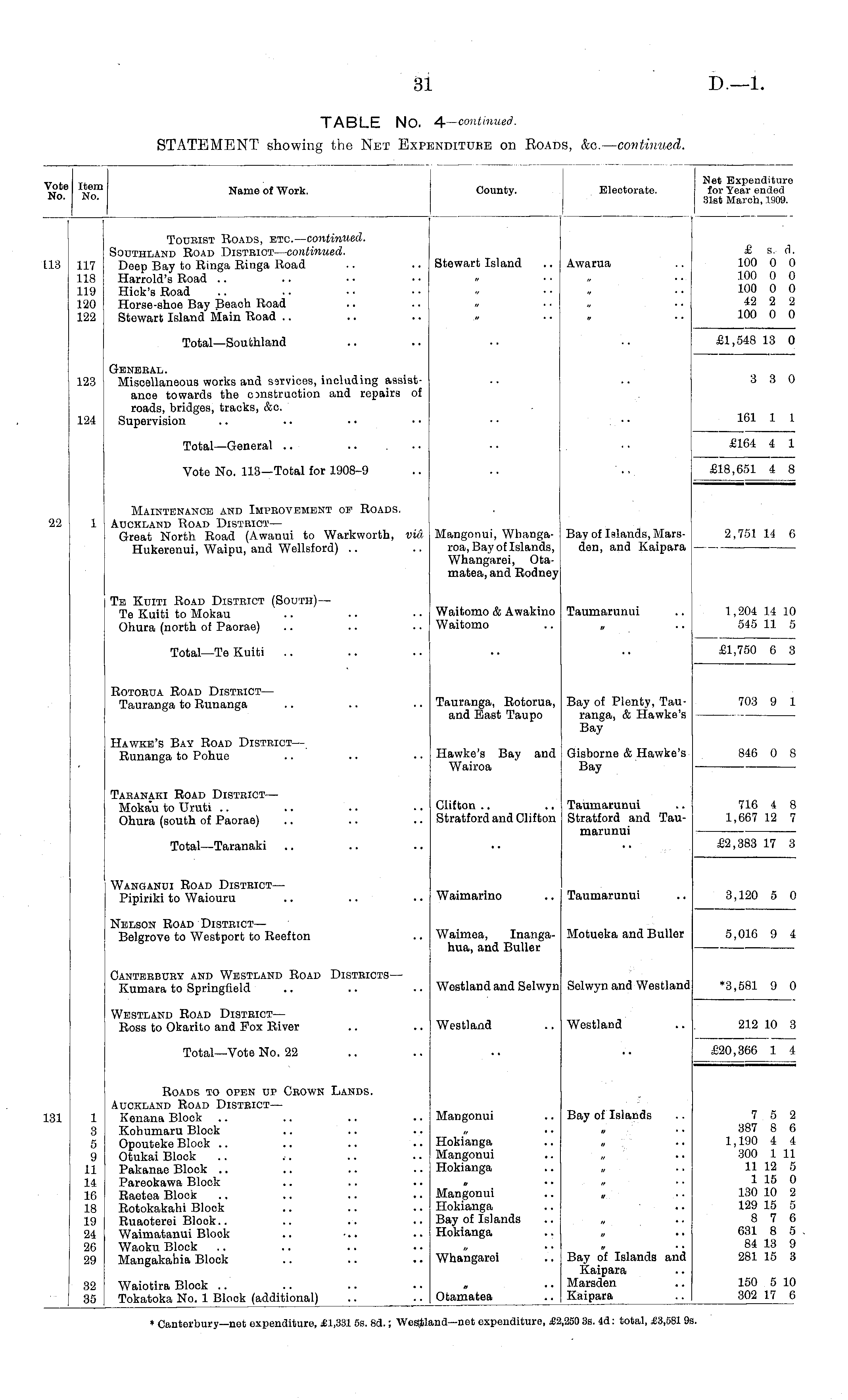 Vote Iteu No. No. Name of Work. County. Electorate. Net Expenditure for Year ended 31st March, 1909. .13 117 118 119 120 122 Tourist Roads, -etc.—continued. Southland Road District— continued. Deep Bay to Ringa Ringa Road Harrold's Road Hick's Road Horse-shoe Bay Beach Road Stewart Island Main Road Stewart Island Awarua £ s. d. 100 0 0 100 0 0 100 0 0 42 2 2 100 0 0 Total—Southland £1,548 13 0 123 General. Miscellaneous works and S9rvices, including assistance towards the construction and repairs of roads, bridges, tracks, &c. Supervision 3 3 0 124 161 1 1 Total —General £164 4 1 Vote No. 113—Total for 1908-9 £18,651 4 8 -22 Maintenance and Improvement op Roads. Auckland Road District — Great North Road (Awanui to Warkworth, via Hukerenui, Waipu, and Wellsford) Mangonui, Whangaroa, Bay of Islands, Whangarei, Otamatea, and Rodney Bay of Islands, Marsden, and Kaipara 2,751 14 6 Te Kuiti Road District (South)— Te Kuiti to Mokau Ohura (north of Paorae) Waitomo & Awakino Waitomo Taumarunui 1,204 14 10 545 11 5 Total—Te Kuiti £1,750 6 3 Rotorua Road District — Tauranga to Runanga Tauranga, Rotorua, and East Taupo Bay of Plenty, Tauranga, & Hawke's Bay 703 9 1 Hawke's Bay Road District — Runanga to Pohue Hawke's Bay and Wairoa Gisborne & Hawke's Bay 846 0 8 Taranaki Road District — Mokau to Uruti Ohura (south of Paorae) Clifton Stratford and Clifton Taumarunui Stratford and Taumarunui 716 4 8 1,667 12 7 Total—Taranaki £2,383 17 3 Wanganui Road District — Pipiriki to Waiouru Waimarino Taumarunui 3,120 5 Nelson Road District — Belgrove to Westport to Reefton Waimea, Inangahua, and Buller Motueka and Buller 5,016 9 4 Canterbury and Westland Road Districts— Kumara to Springfield Westland and Selwyn Selwyn and Westland *3,581 9 Westland Road District — Ross to Okarito and Fox River Westland Westland 212 10 3 Total—Vote No. 22 £20,366 1 4 .31 1 3 5 9 11 14 16 18 19 24 26 29 Roads to open up Crown Lands. Auckland Road District — Kenana Block Kohumaru Block Opouteke Block Otukai Block Pakanae Block Pareokawa Block Raetea Block Rotokakahi Blook Ruaoterei Blook.. Waimatanui Blook Waoku Block Mangakahia Block Mangonui Hokianga Mangonui Hokianga Bay of Islands 7 5 2 387 8 6 1,190 4 4 300 1 11 11 12 5 1 15 0 130 10 2 129 15 5 8 7 6 631 8 5 84 13 9 281 15 3 Mangonui Hokianga Bay of Islands Hokianga .. a •. Whangarei Bay of Islands and Kaipara Marsden Kaipara 32 35 Waiotira Block Tokatoka No. 1 Block (additional) ■■ _.. Otamatea 150 5 10 302 17 6 * Canterbur '—net expenditure, £1,331 5s. 8d.; Weatli bnd —net expenditure, £'■ !,250 3s. id: total, £3,581 9i